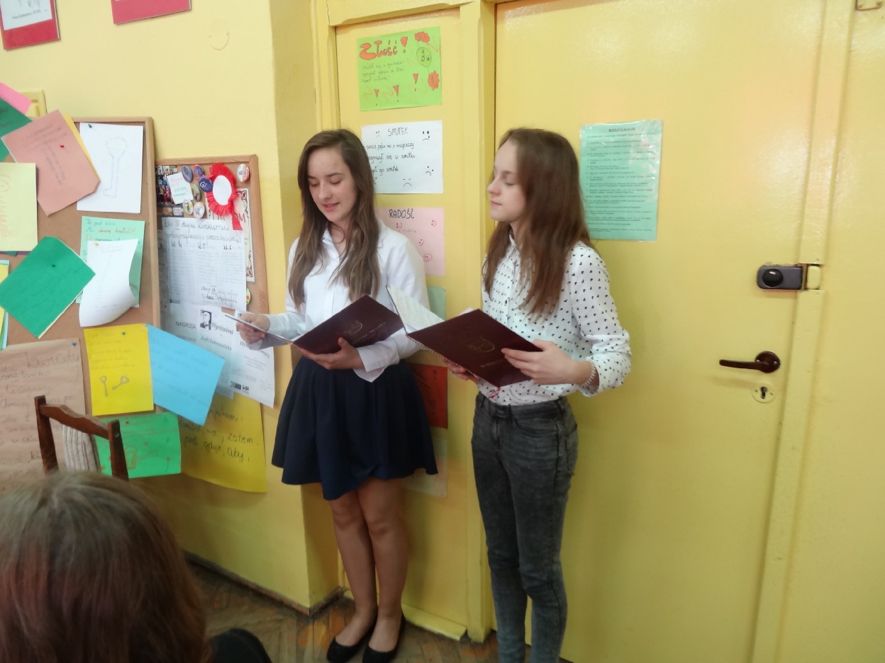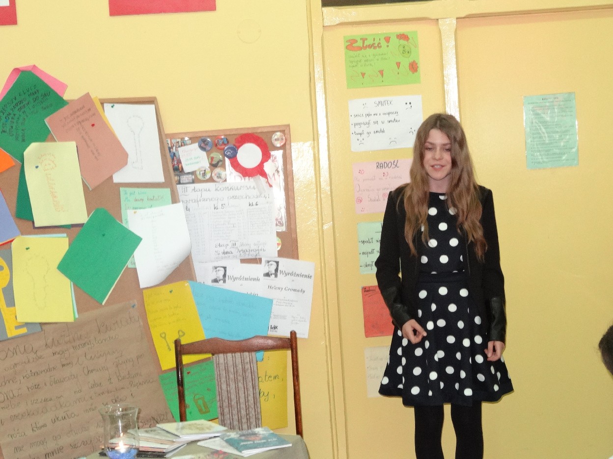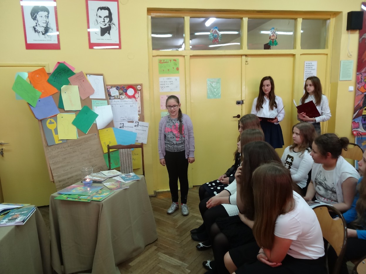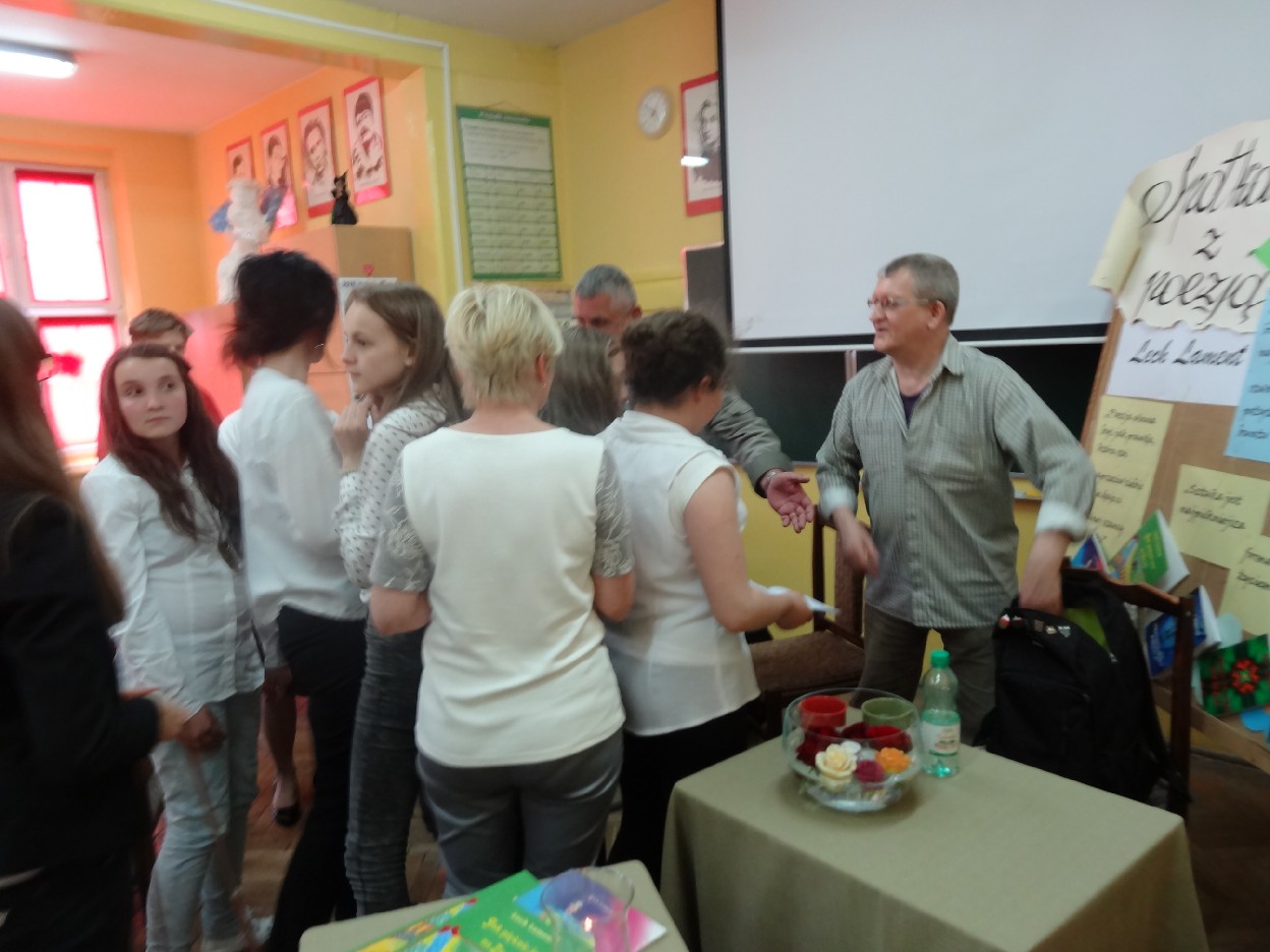 Dnia 27.05.2015 r. w naszej szkole odbyło się spotkanie z turkowskim pisarzem panem Lechem Lamentem i piosenkarzem poezji śpiewanej panem Jerzym Kellerem. O godzinie 15:30 uczniowie, którzy chcieli uczestniczyć w spotkaniu z poezją, zebrali się w sali 406. Na początku Natalia Borowczyk i Dominika Ziemiańska z klasy 6 a wprowadziły wszystkich w atmosferę spotkania. Potem goście przedstawili się nam, a następnie obejrzeliśmy krótką prezentację dotyczącą ich życia i twórczości. Następnie nasze koleżanki: Nina Grabara, Helena Gromada, Agata Drabina i Agnieszka Majda pięknie wyrecytowały wiersze. Wszyscy byli pod ogromnym wrażeniem ich umiejętności. Później nasze koleżanki z klasy 4d: Helenka Gromada i Zosia Dobrowolska zaprezentowały swoje wiersze, za które otrzymały wyróżnienia w Międzypowiatowym Konińskim Konkursie Poezji Dziecięcej.