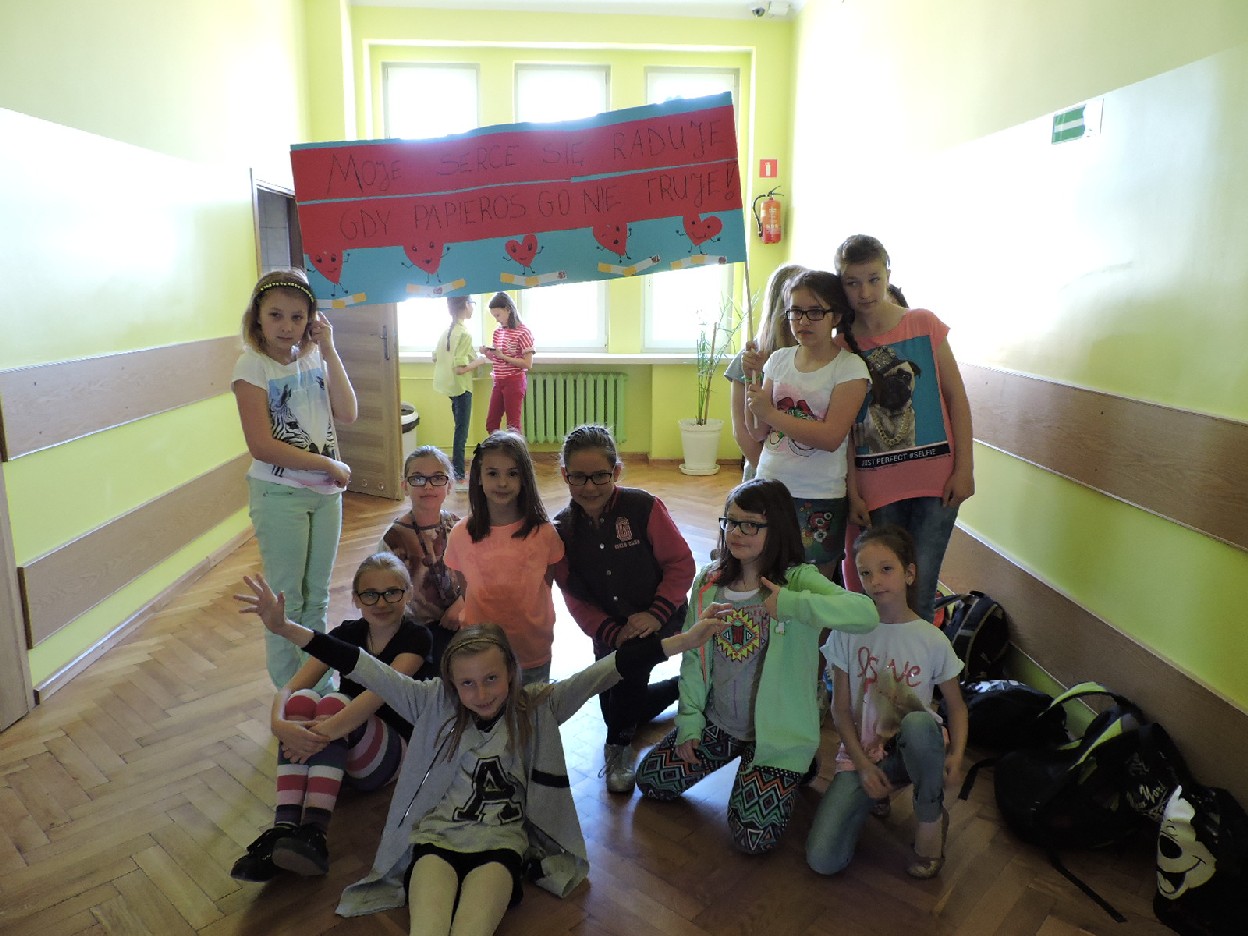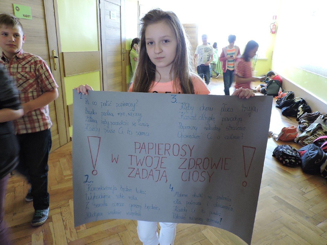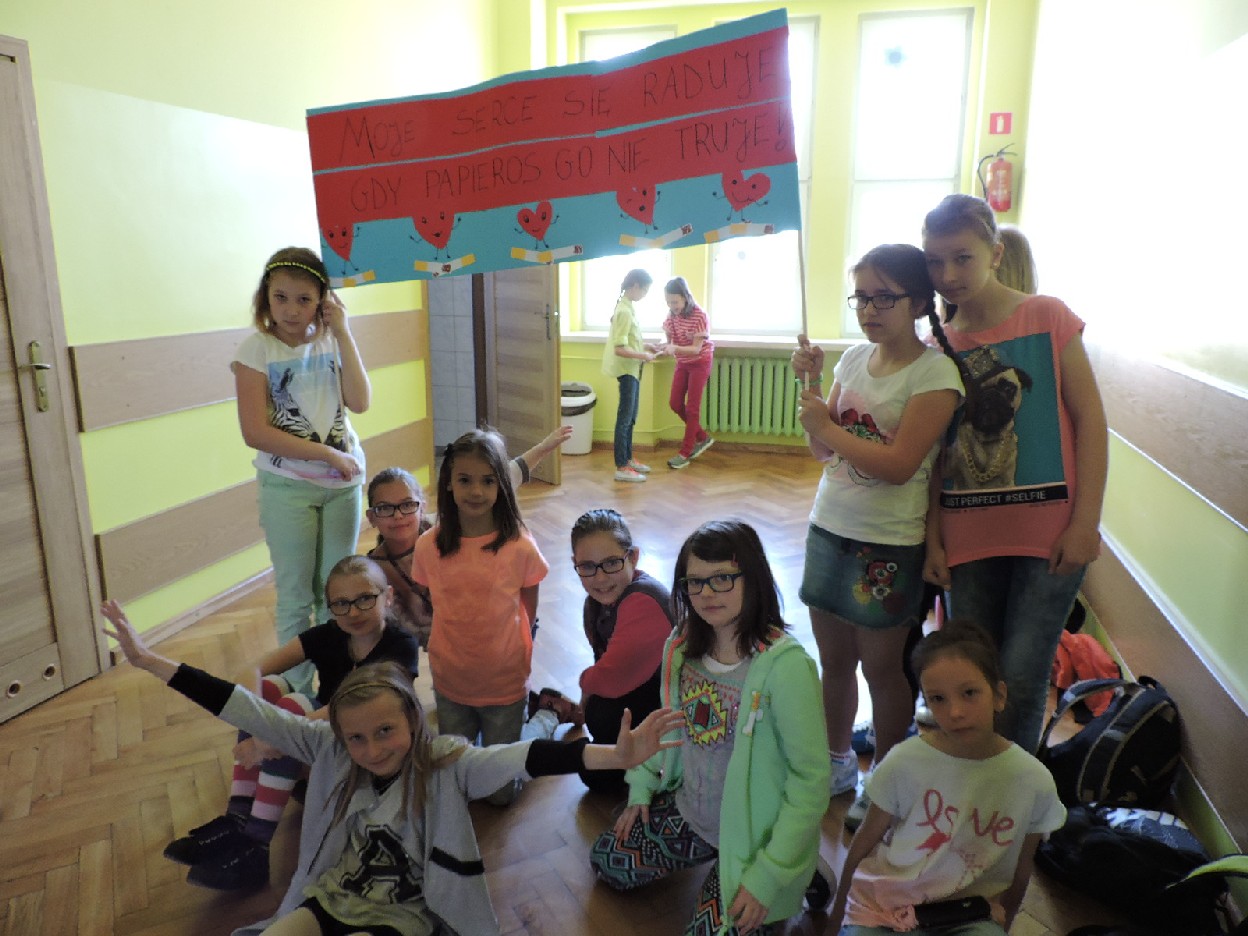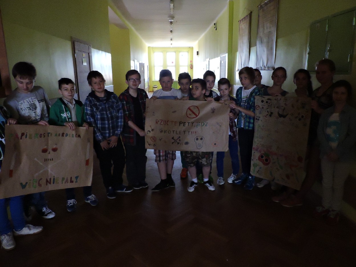 31 maja 2015 roku obchodzono „Światowy Dzień bez Tytoniu” pod tegorocznym hasłem „Stop nielegalnemu obrotowi wyrobami tytoniowymi”. Z tej okazji klasy 4-6 wymyślały i przygotowały hasła promujące rzucanie palenia papierosów, natomiast klasy 1-3 plakaty w formie graficznej. Każda klasa na lekcji wychowawczej omawiała negatywne skutki palenia papierosów, również w sposób bierny (przebywając w towarzystwie osób palących). Na wywiadówkach dla rodziców przygotowano ulotkę informującą o tegorocznej akcji wśród uczniów, ale również o zgubnych skutkach palenia.