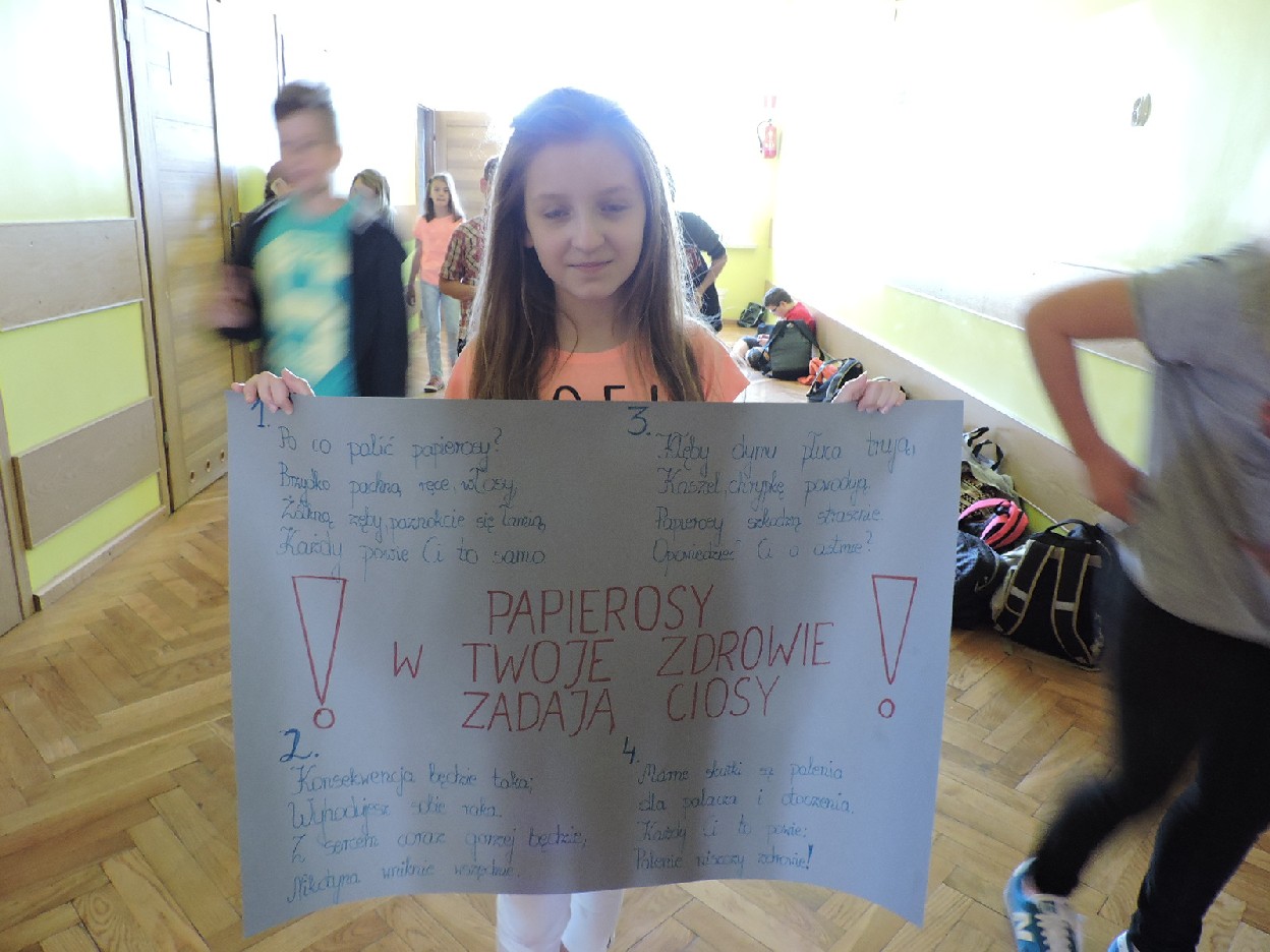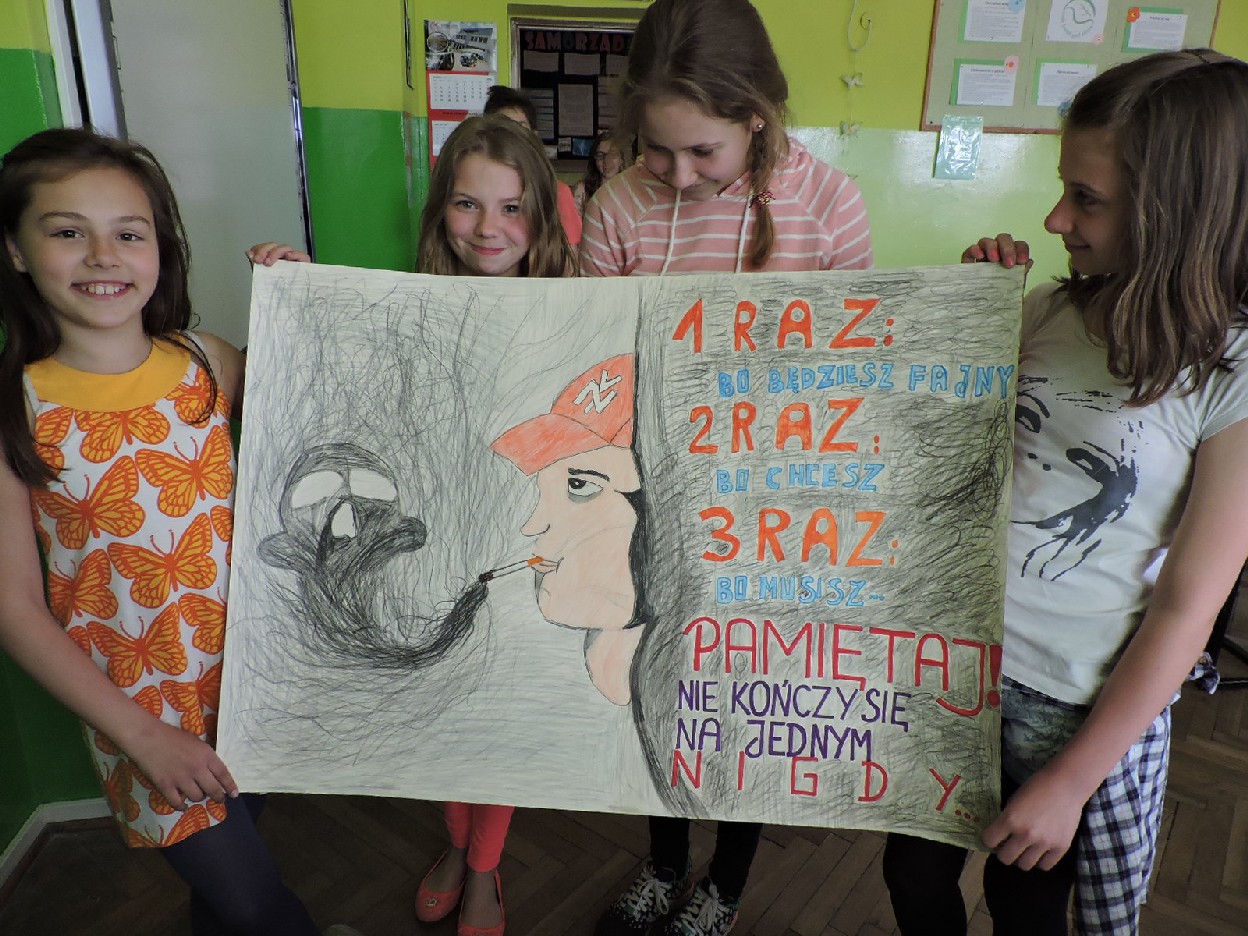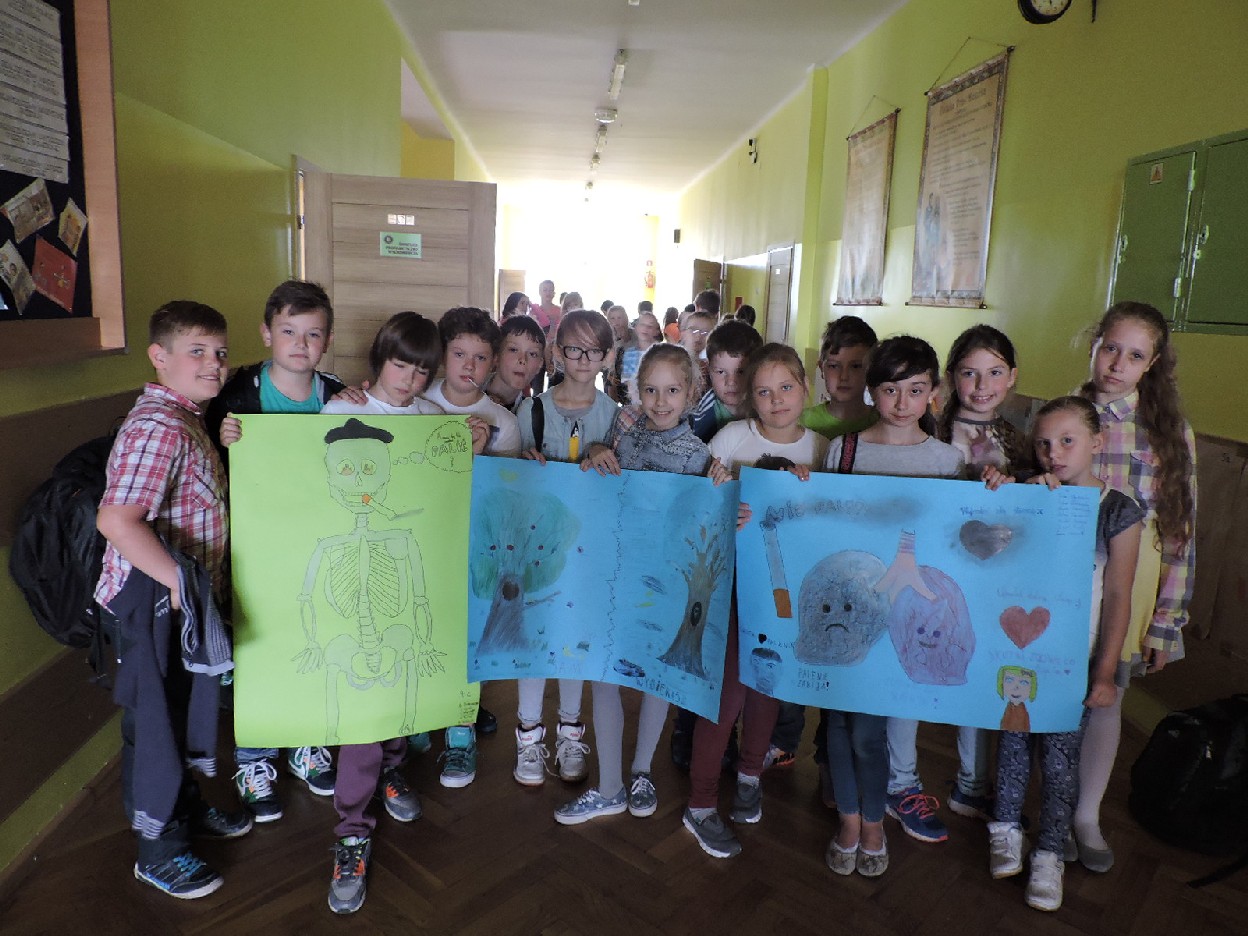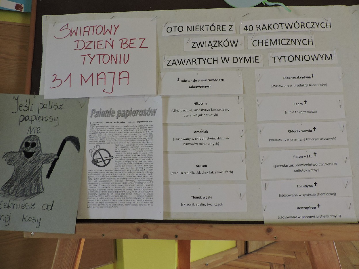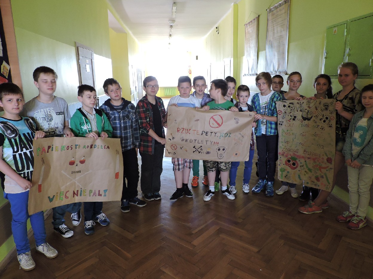 31 maja 2015 roku obchodzono „Światowy Dzień bez Tytoniu” pod tegorocznym hasłem „Stop nielegalnemu obrotowi wyrobami tytoniowymi”. Z tej okazji klasy 4-6 wymyślały i przygotowały hasła promujące rzucanie palenia papierosów, natomiast klasy 1-3 plakaty w formie graficznej. Każda klasa na lekcji wychowawczej omawiała negatywne skutki palenia papierosów, również w sposób bierny (przebywając w towarzystwie osób palących). Na wywiadówkach dla rodziców przygotowano ulotkę informującą o tegorocznej akcji wśród uczniów, ale również o zgubnych skutkach palenia.