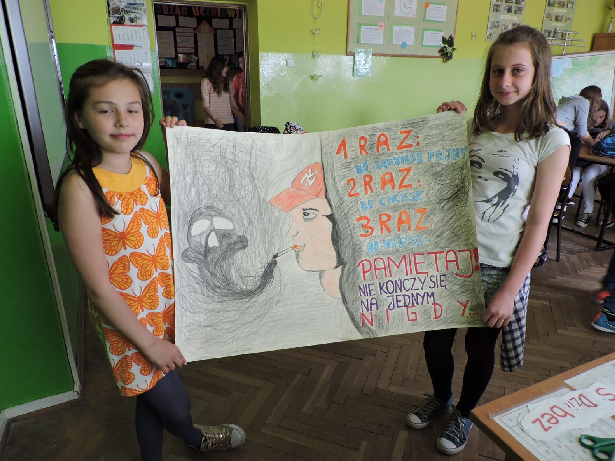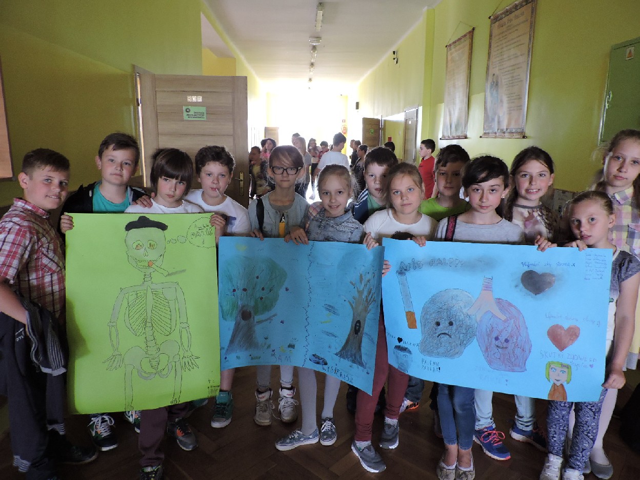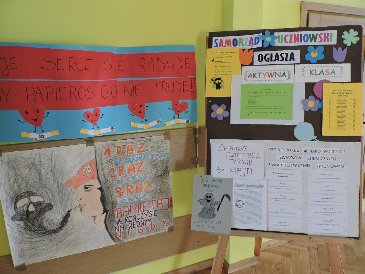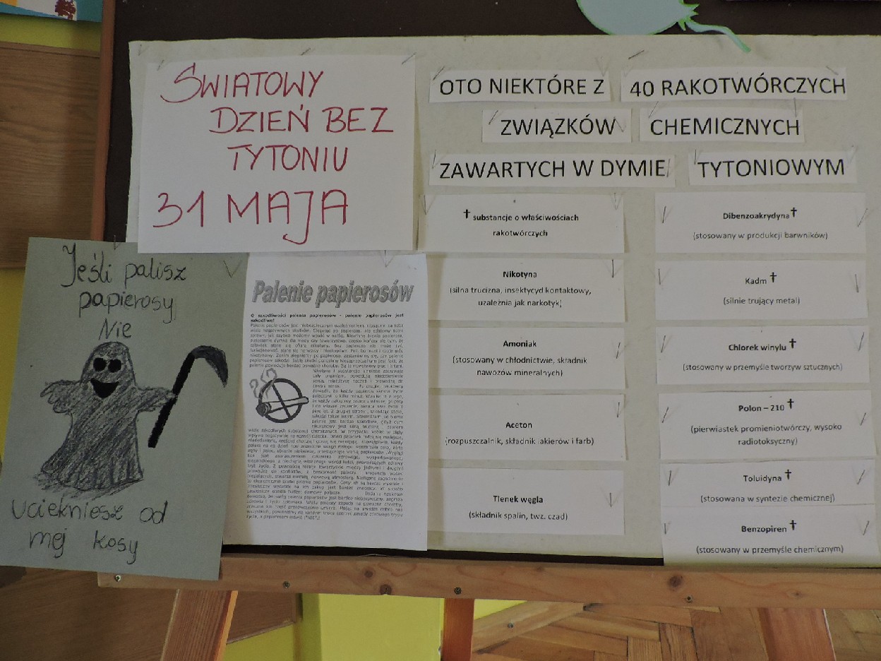 31 maja 2015 roku obchodzono „Światowy Dzień bez Tytoniu” pod tegorocznym hasłem „Stop nielegalnemu obrotowi wyrobami tytoniowymi”. Z tej okazji klasy 4-6 wymyślały i przygotowały hasła promujące rzucanie palenia papierosów, natomiast klasy 1-3 plakaty w formie graficznej. Każda klasa na lekcji wychowawczej omawiała negatywne skutki palenia papierosów, również w sposób bierny (przebywając w towarzystwie osób palących). Na wywiadówkach dla rodziców przygotowano ulotkę informującą o tegorocznej akcji wśród uczniów, ale również o zgubnych skutkach palenia.