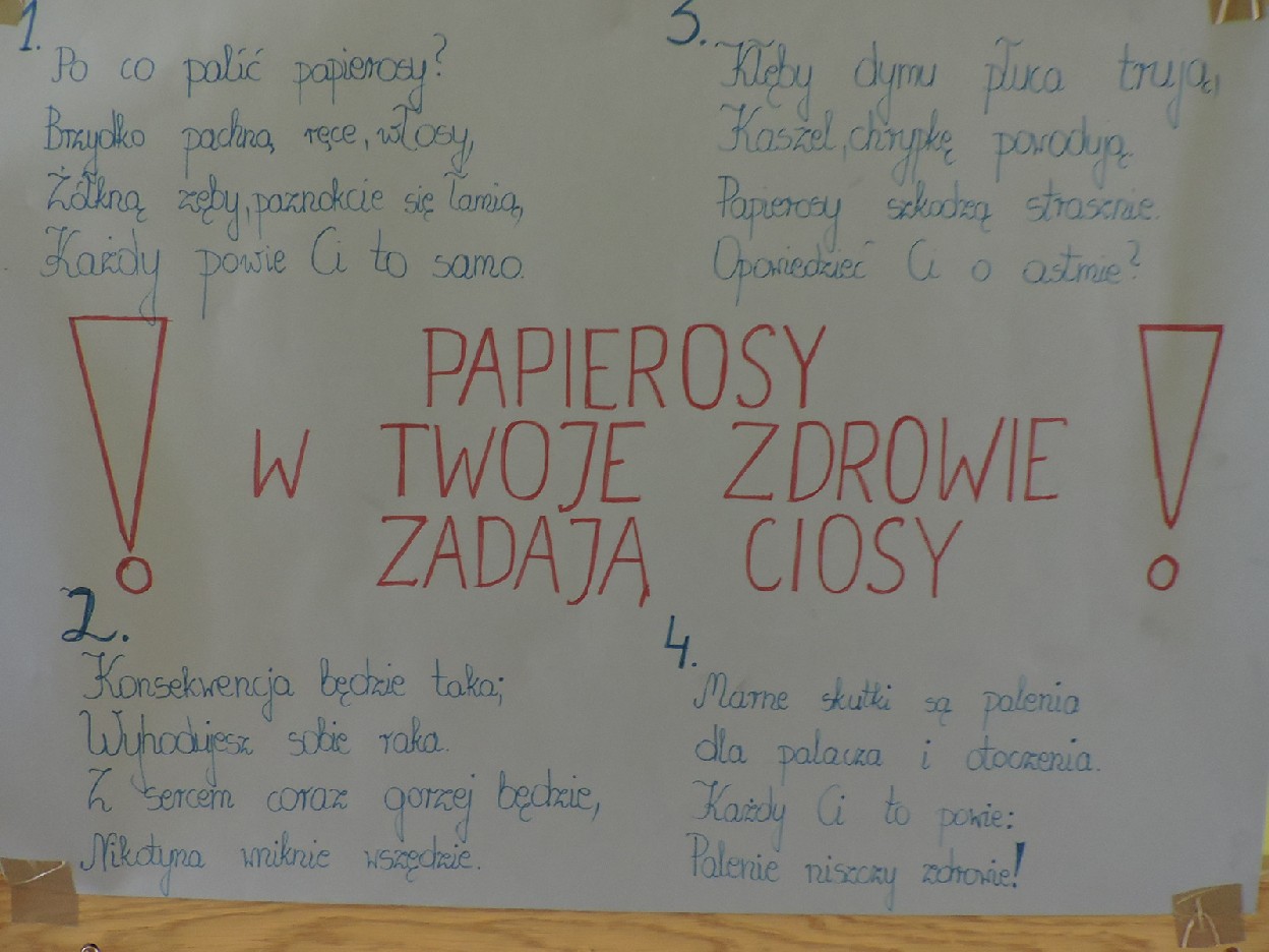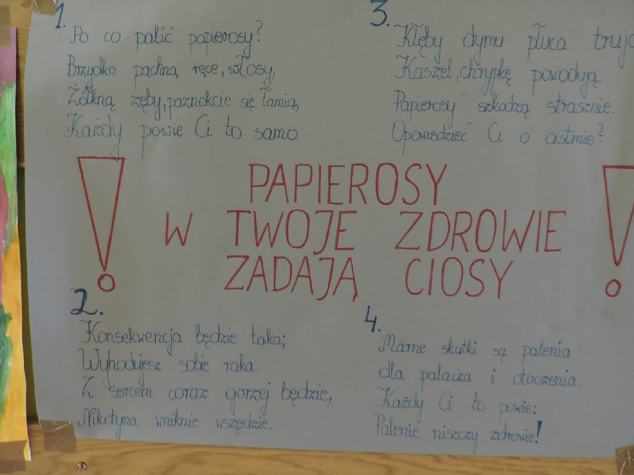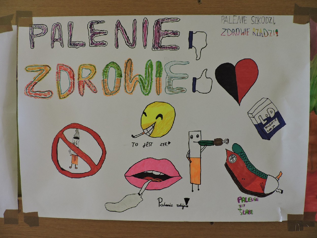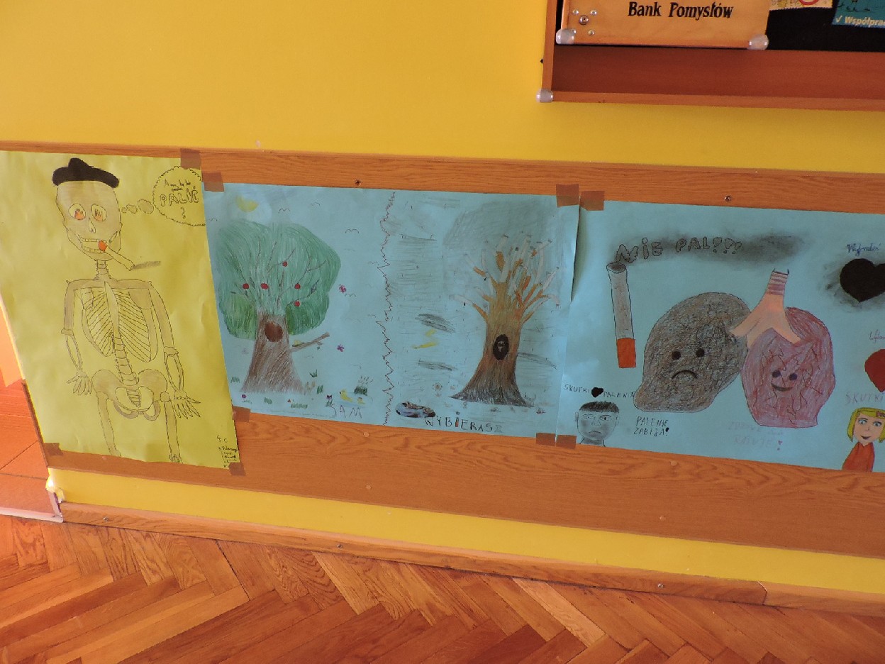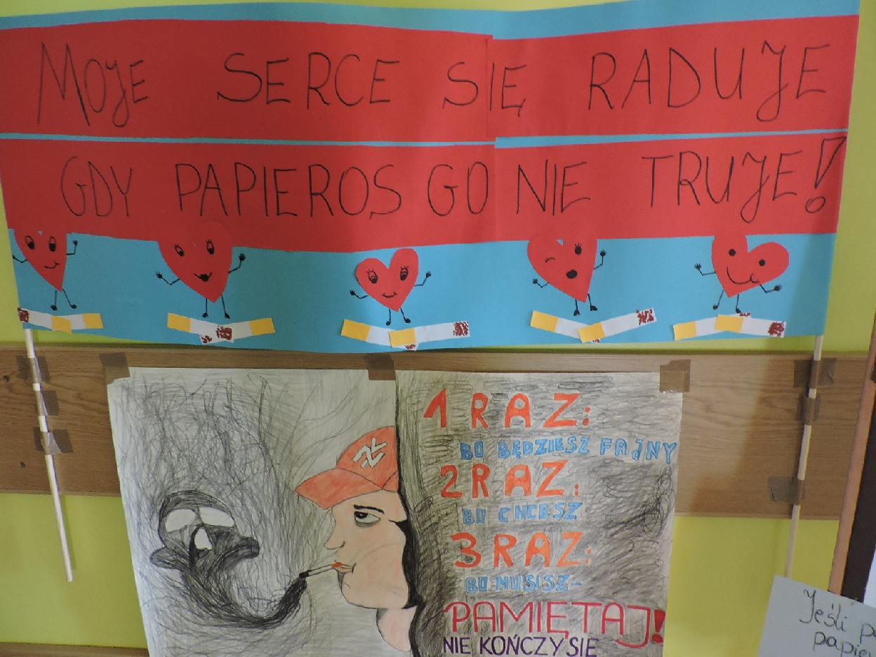 31 maja 2015 roku obchodzono „Światowy Dzień bez Tytoniu” pod tegorocznym hasłem „Stop nielegalnemu obrotowi wyrobami tytoniowymi”. Z tej okazji klasy 4-6 wymyślały i przygotowały hasła promujące rzucanie palenia papierosów, natomiast klasy 1-3 plakaty w formie graficznej. Każda klasa na lekcji wychowawczej omawiała negatywne skutki palenia papierosów, również w sposób bierny (przebywając w towarzystwie osób palących). Na wywiadówkach dla rodziców przygotowano ulotkę informującą o tegorocznej akcji wśród uczniów, ale również o zgubnych skutkach palenia.