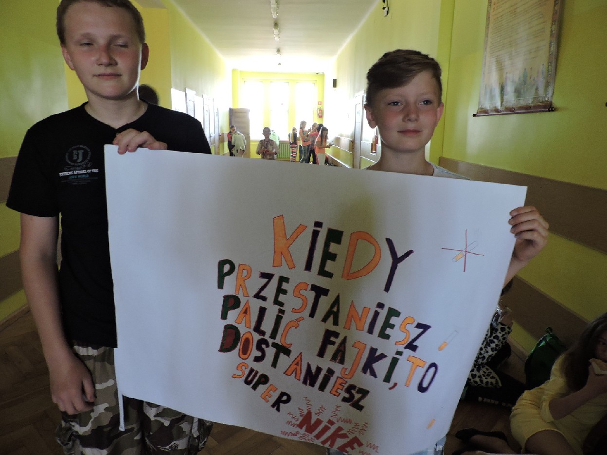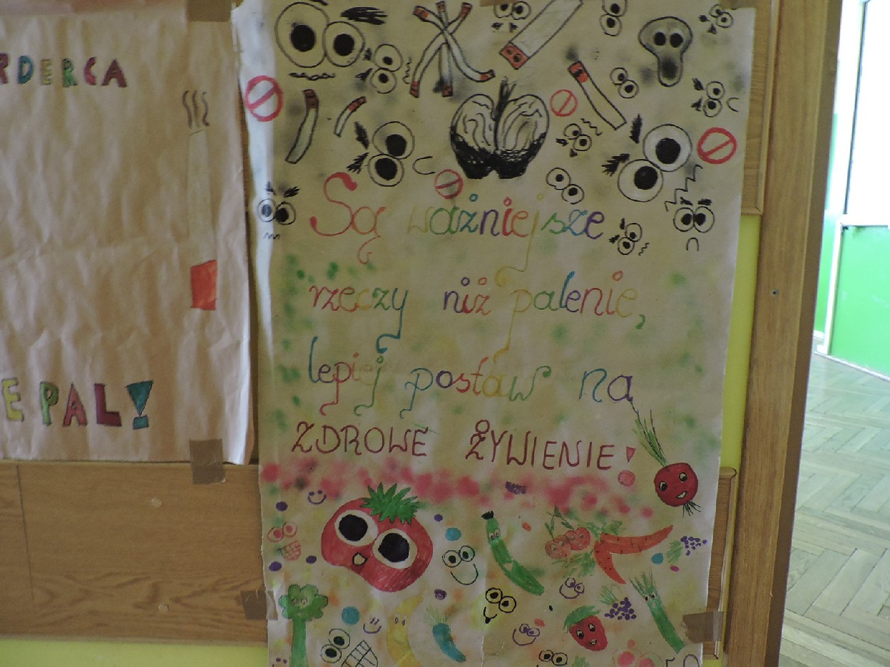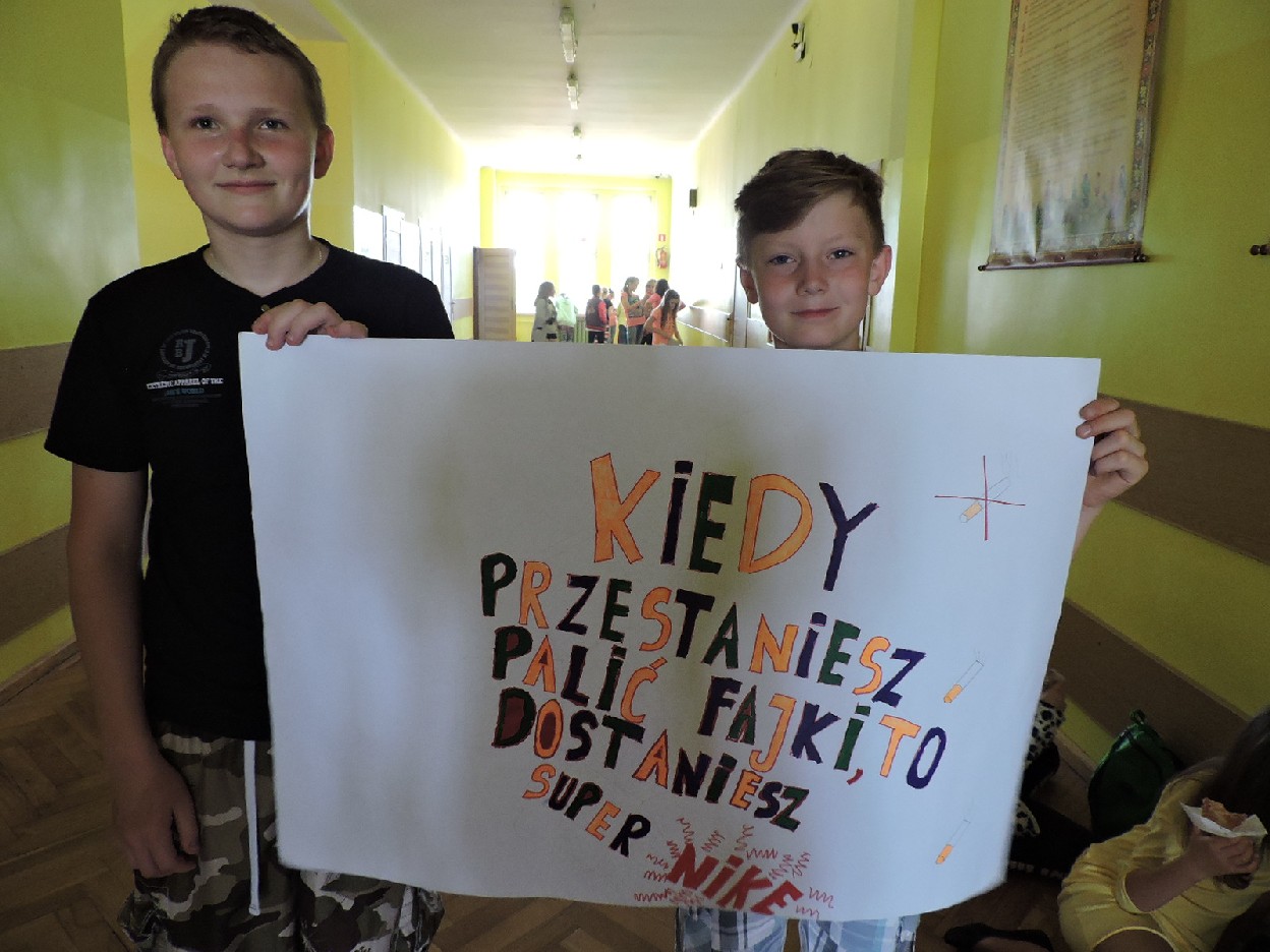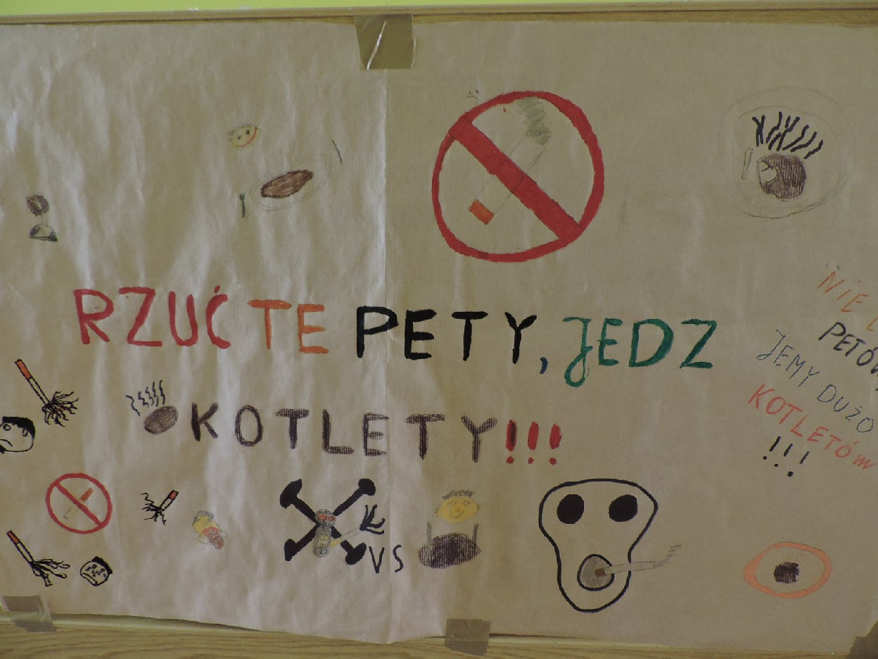 31 maja 2015 roku obchodzono „Światowy Dzień bez Tytoniu” pod tegorocznym hasłem „Stop nielegalnemu obrotowi wyrobami tytoniowymi”. Z tej okazji klasy 4-6 wymyślały i przygotowały hasła promujące rzucanie palenia papierosów, natomiast klasy 1-3 plakaty w formie graficznej. Każda klasa na lekcji wychowawczej omawiała negatywne skutki palenia papierosów, również w sposób bierny (przebywając w towarzystwie osób palących). Na wywiadówkach dla rodziców przygotowano ulotkę informującą o tegorocznej akcji wśród uczniów, ale również o zgubnych skutkach palenia.
