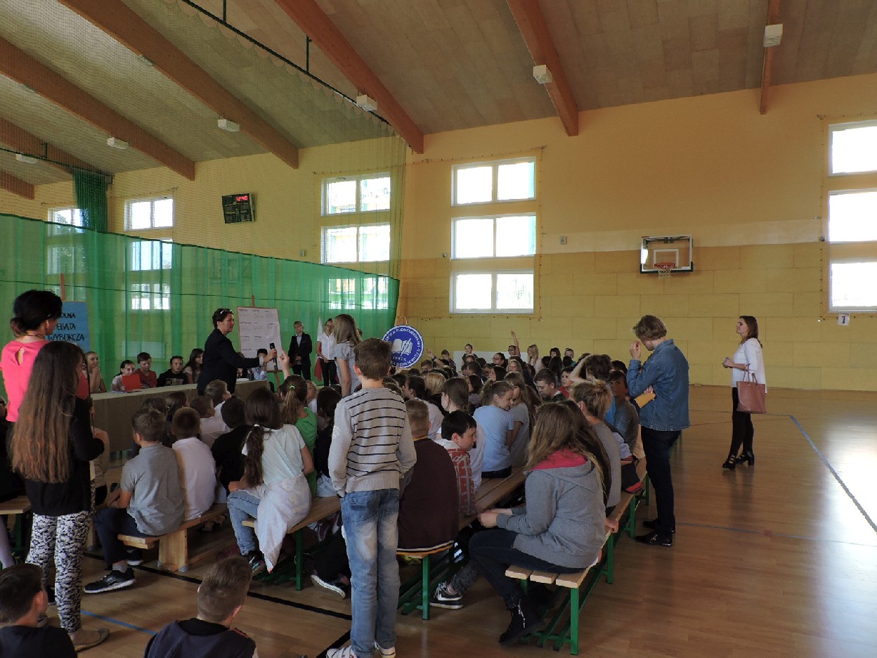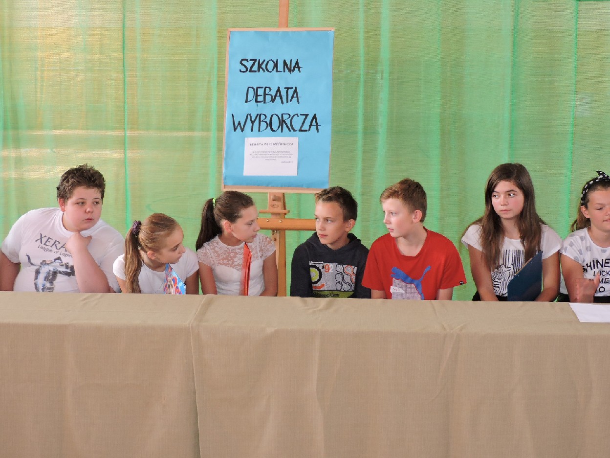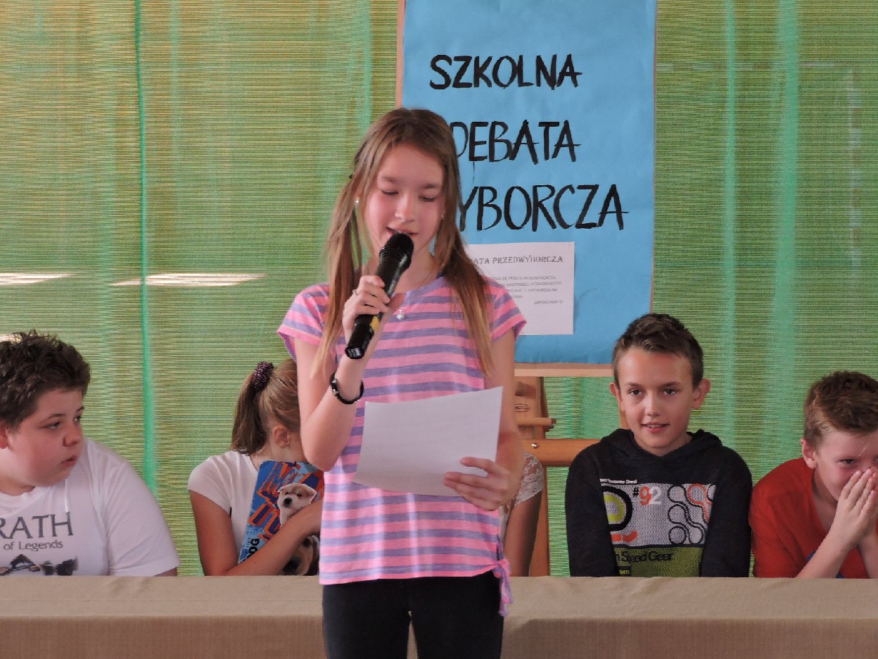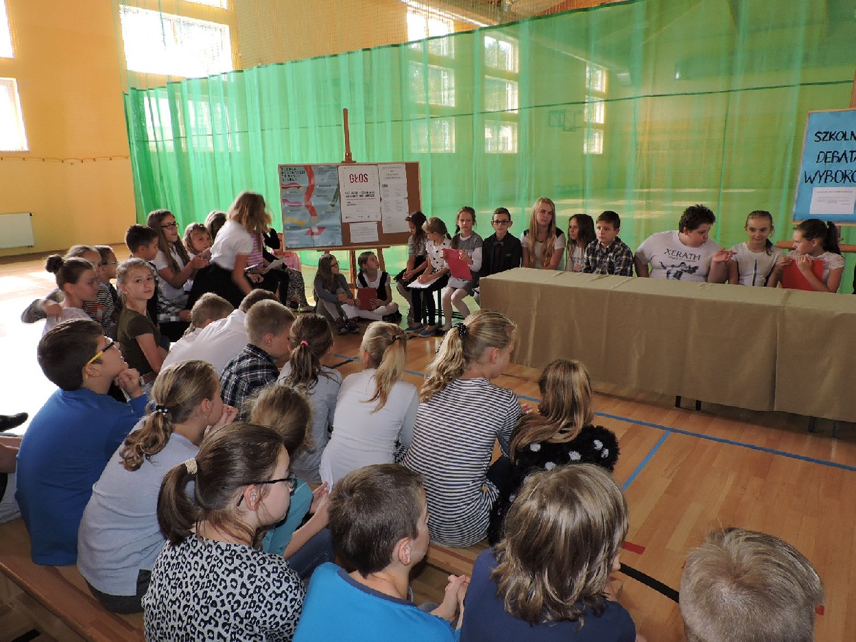 O godzinie 11:40 kandydaci, uczniowie, z niektórych klas oraz nauczyciele zebrali się w sali gimnastycznej. Na początku spotkania głos zabrali przedstawiciele klasy 6e, którzy w krótkim przemówieniu przedstawili nam zasady i przybliżyli przebieg dzisiejszej debaty. Później osoby ubiegające się o dostanie do Samorządu Uczniowskiego po kolei, według ściśle określonej kolejności przedstawiali swoje pomysły i plany na to, jakie zmiany chcieliby wprowadzić w naszej szkole, aby nauka w niej była dla nas samą przyjemnością, a czas spędzony w jej murach łączył się również z zabawą. Najczęściej podawanymi propozycjami były : więcej dyskotek, przerw muzycznych, lekcji na świeżym powietrzu, wycieczek oraz ponownego otwarcia sklepiku szkolnego. Wszystkie pomysły były bardzo ciekawe i warte naszej uwagi. Następnie kandydaci zapisywali w kalendarzu, pod miesiącem propozycje zmian, które mieli za zadanie wymyśleć podczas debaty, przypisując im w ten sposób datę, z którą chcieliby je zrealizować. Wiele pomysłów było bardzo zaskakujących, a zrazem interesujących. Na koniec uczniowie przysłuchujący się prezentacjom kandydatów mogli osobiście skierować do nich swoje pytania. Najczęściej pytano o to, w jaki sposób zostaną wprowadzone w życie proponowane koncepcje. Po skończonej debacie wróciliśmy do swoich klas na lekcje.