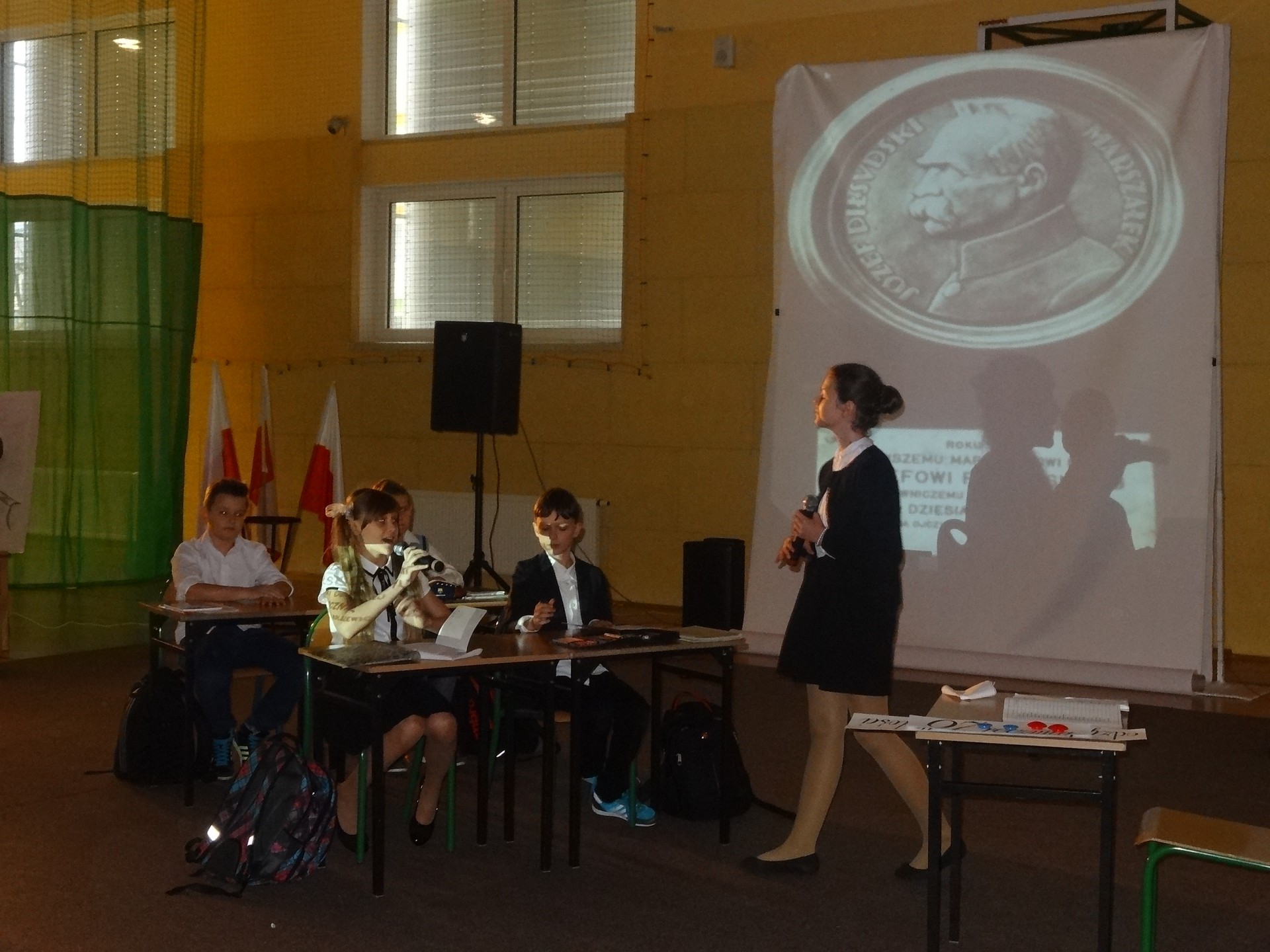 Na początku przewodnicząca Samorządu Uczniowskiego – Kinga Fijałkowska powitała wszystkich zebranych. Następnie zaprosiła na krótką lekcję historii, podczas której mieliśmy okazję przypomnieć ważne dla naszego kraju wydarzenia historyczne począwszy od pierwszego rozbioru Polski aż po odzyskanie niepodległości. Momentem kulminacyjnym uroczystości było pojawienie się na scenie Józef Piłsudskiego wraz z żoną i córkami. Majestatyczne ubrania przeniosły nas w początki XX wiek. Zwieńczeniem całej uroczystości był taniec polonez przygotowany przez uczniów klasy VIe. Wyszło im to wspaniale, a wszyscy zebrani byli pod dużym wrażeniem ich wdzięku. Po występie, goście zabrali głos.
