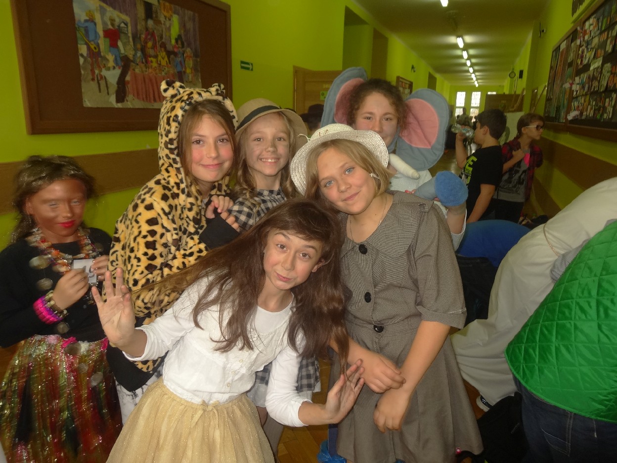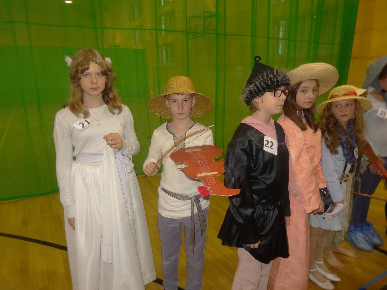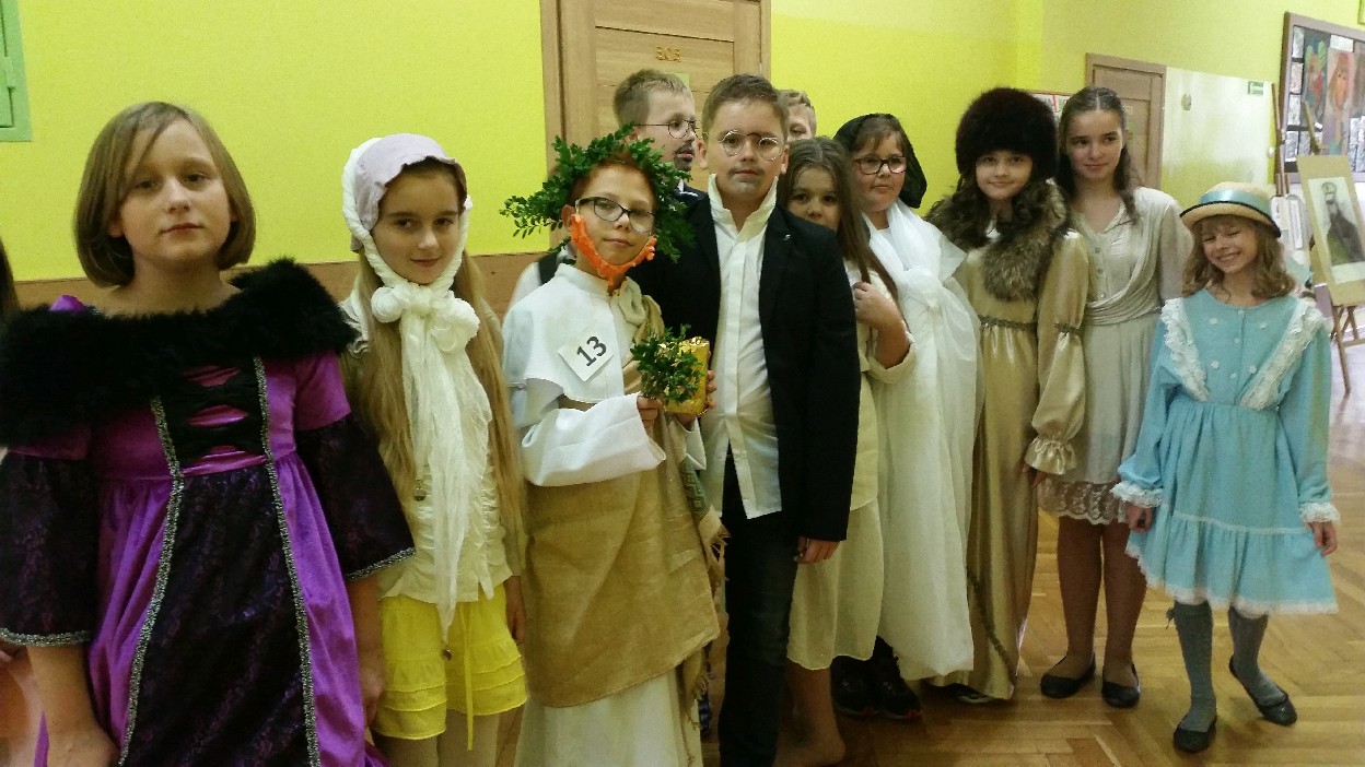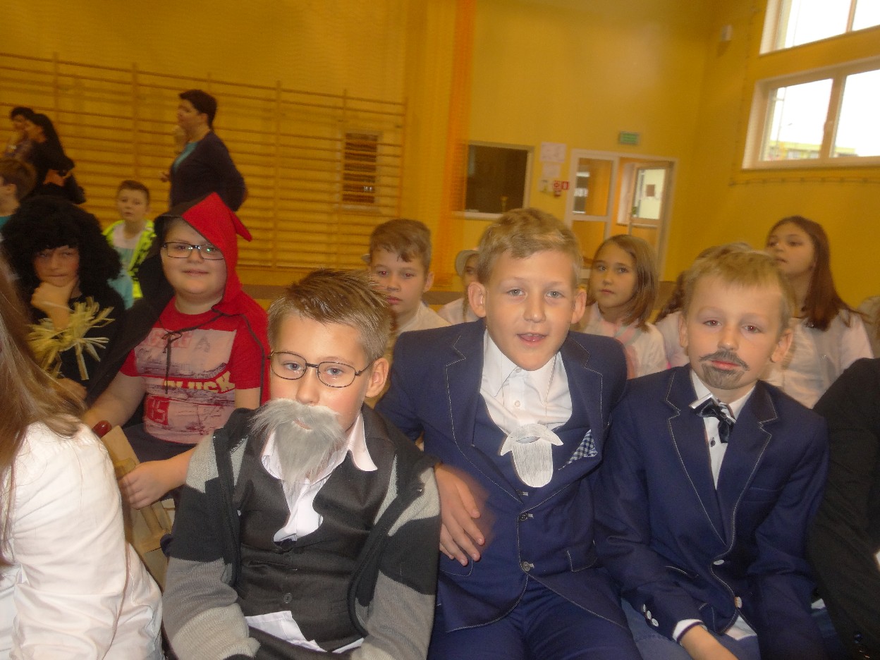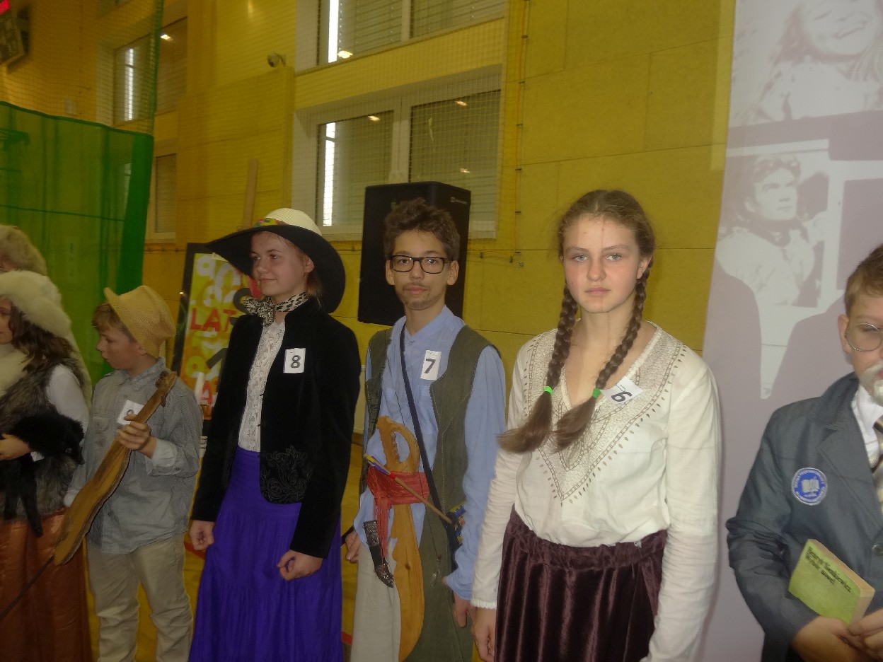12 listopada było inaczej niż zazwyczaj w szkole. Od samego rana na szkolnych korytarzach można było spotkać bohaterów książek Henryka Sienkiewicza. Tym razem wśród uczniów byli: Staś, Nel, pani Oliwier, Latarnik, Krzyżacy, Murzyni, Oleńka Bilewiczówna, Neron, Ligia, Sachem a nawet pies Saba, słoń King. Póżniej wszyscy spotkali się w sali sportowej. Każda klasa wystawiła swoich reprezentantów do konkursu na najlepszą kreację bohatera. Kryteria oceny były surowe, jednak komisja konkursowa nie była w stanie wyłonić zwyciezców. Stwierdzono, że wszystkie postacie doskonale odzwierciedlają bohaterów z książek naszego Patrona. Wszyscy otrzymali zatem najwyższą liczbę punktów. W XIX w. trzeba byo wykazywać się odwagą i zwinnością. Aby to sprawdzić chętni bohaterowie utworów Henryka Sienkiewicza przystapili do konkurencji sportowych pod okiem nauczycieli w - fu. Było wesoło, okazało się, że nie jest łatwo wygrać, mając na sobie różne stroje. Dzień ten był wspaniały, stał sie zachetą do czytania utworów Henryka Sienkiewicza.