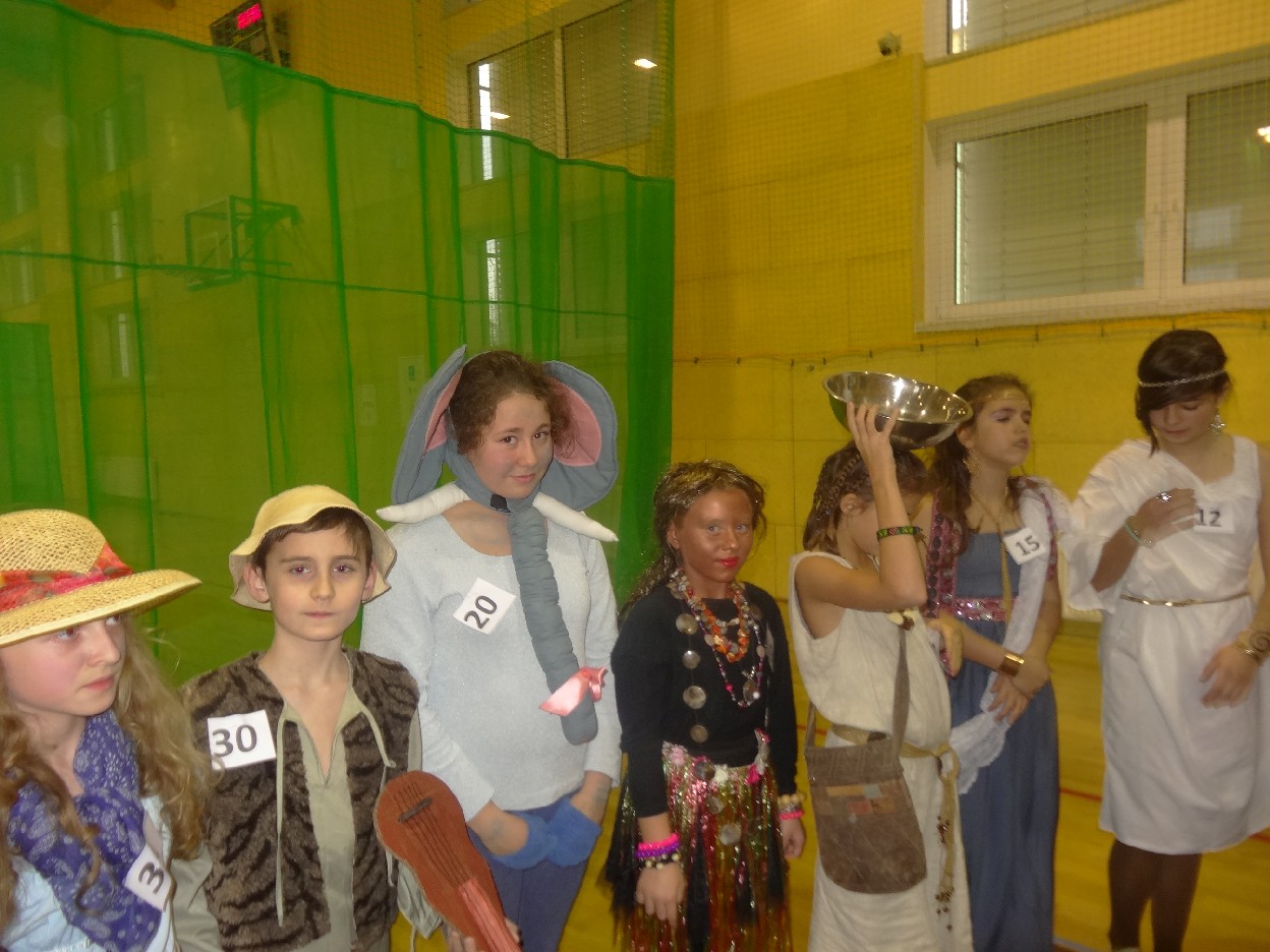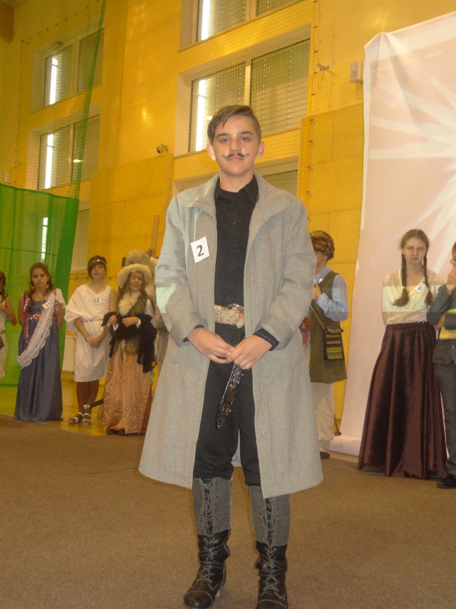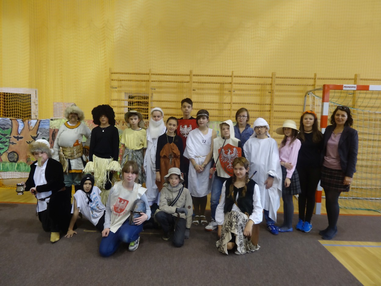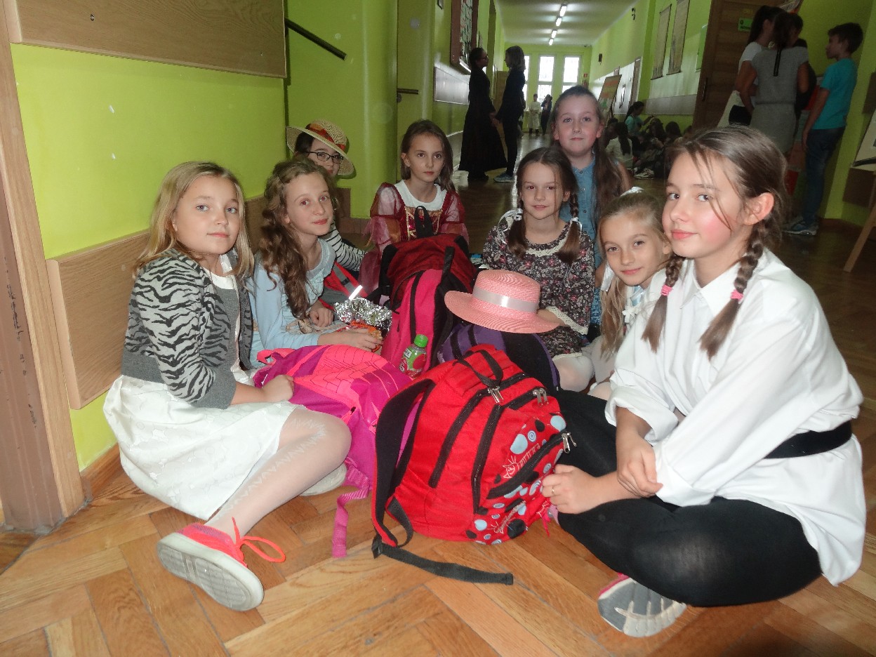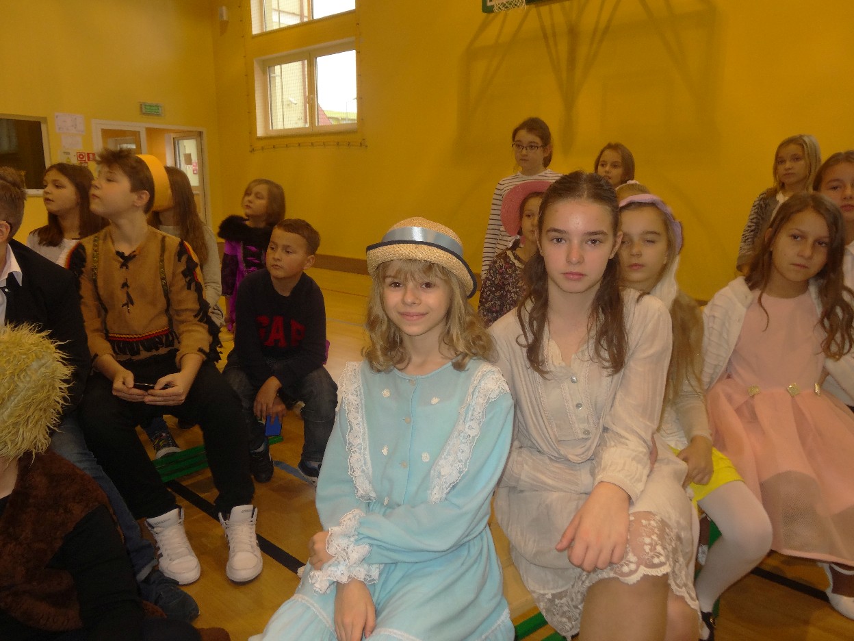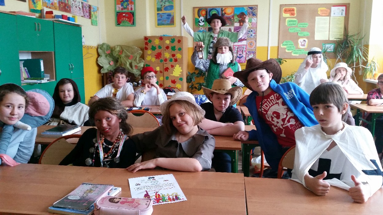 12 listopada było inaczej niż zazwyczaj w szkole. Od samego rana na szkolnych korytarzach można było spotkać bohaterów książek Henryka Sienkiewicza. Tym razem wśród uczniów byli: Staś, Nel, pani Oliwier, Latarnik, Krzyżacy, Murzyni, Oleńka Bilewiczówna, Neron, Ligia, Sachem a nawet pies Saba, słoń King. Póżniej wszyscy spotkali się w sali sportowej. Każda klasa wystawiła swoich reprezentantów do konkursu na najlepszą kreację bohatera. Kryteria oceny były surowe, jednak komisja konkursowa nie była w stanie wyłonić zwyciezców. Stwierdzono, że wszystkie postacie doskonale odzwierciedlają bohaterów z książek naszego Patrona. Wszyscy otrzymali zatem najwyższą liczbę punktów. W XIX w. trzeba byo wykazywać się odwagą i zwinnością. Aby to sprawdzić chętni bohaterowie utworów Henryka Sienkiewicza przystapili do konkurencji sportowych pod okiem nauczycieli w - fu. Było wesoło, okazało się, że nie jest łatwo wygrać, mając na sobie różne stroje. Dzień ten był wspaniały, stał sie zachetą do czytania utworów Henryka Sienkiewicza.