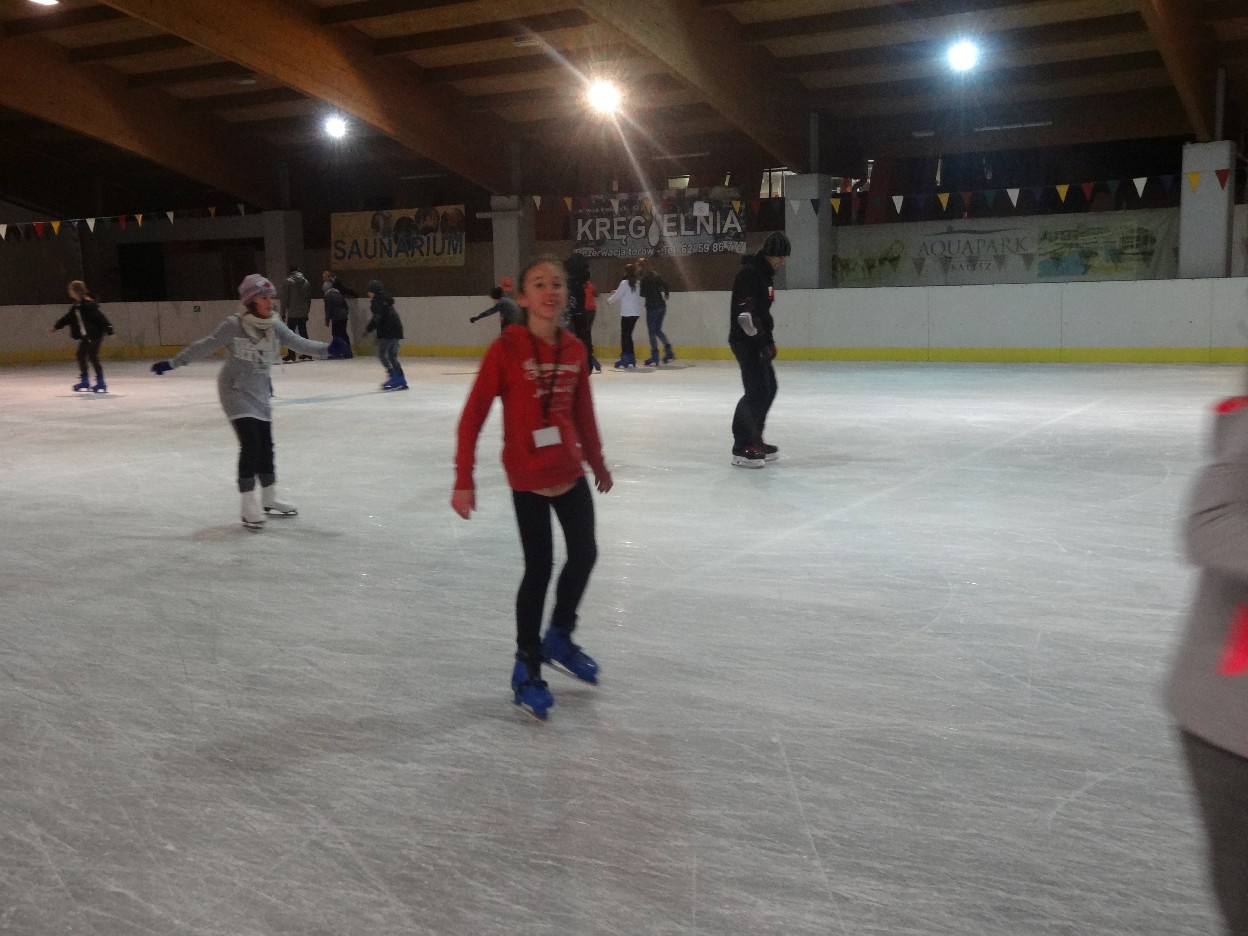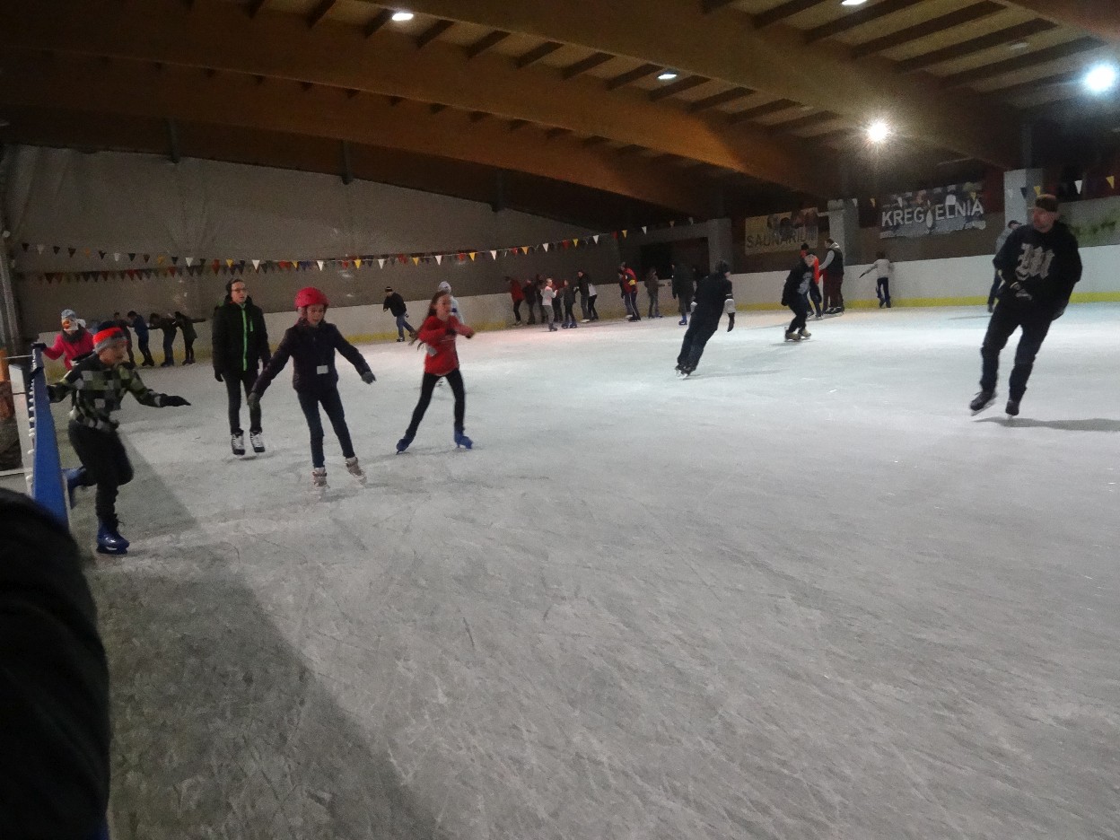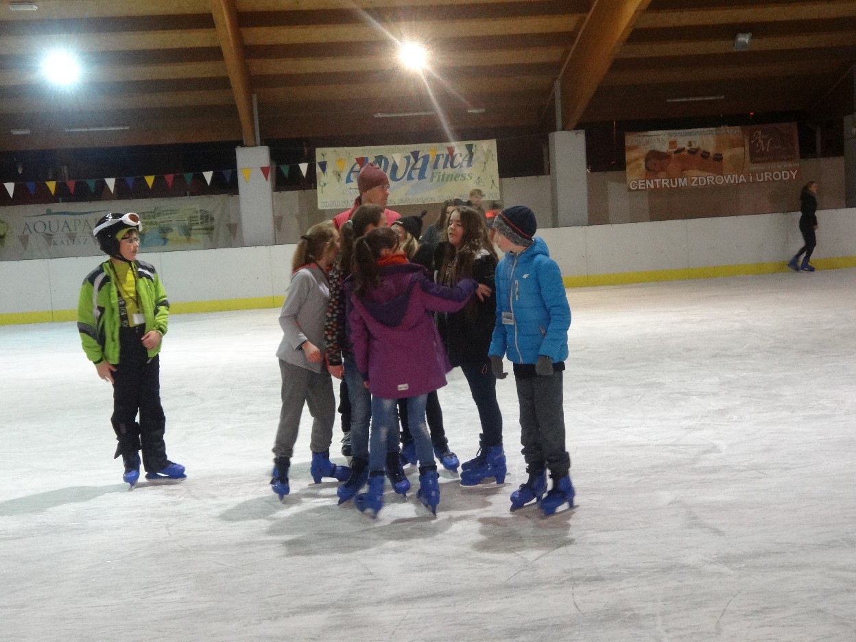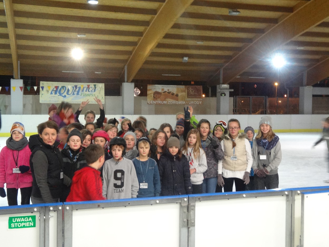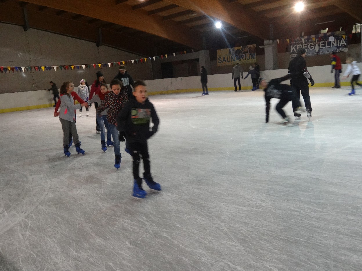 W ostatni poniedziałek listopada 2015 r. klasy czwarte, piąte i szóste udały się na lodowisko do Kalisza. Naszymi opiekunami były panie: Bożena Mielczarek, Agnieszka Koszykowska, Magdalena Sobczak. Sprzed szkoły wyruszyliśmy o godzinie 16.30. Po niespełna godzinie dotarliśmy do obiektu sportowego w którym mieści się lodowisko. Przygotowanie do wyjścia na lód zajęło nam trochę czasu. Wypożyczyliśmy łyżwy i po założeniu ich postanowiliśmy wejść na taflę, oczywiście pod czujnym okiem instruktora. Niektórzy mieli już za sobą pierwszą jazdę na łyżwach i sami postanowili oddać się szaleństwu jazdy. Początkujący łyżwiarze po kilku radach instruktora i niewielkich upadkach zaczęli sobie radzić. Z upływem czasu było coraz lepiej. Po godzinie jazdy musieliśmy schodzić z lodowiska. Wyjazd był bardzo udany. Podczas pobytu na lodowisku wzmocniliśmy naszą sprawność fizyczną. Był to czas wspólnej zabawy i rekreacji. Zrelaksowani i zadowoleni nie możemy doczekać się następnego wyjazdu, który będzie już za tydzień. Wyjazdy na lodowisko organizowane są przez Samorząd Uczniowski naszej szkoły.
