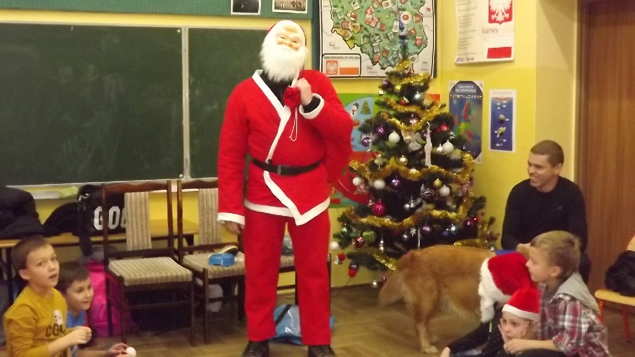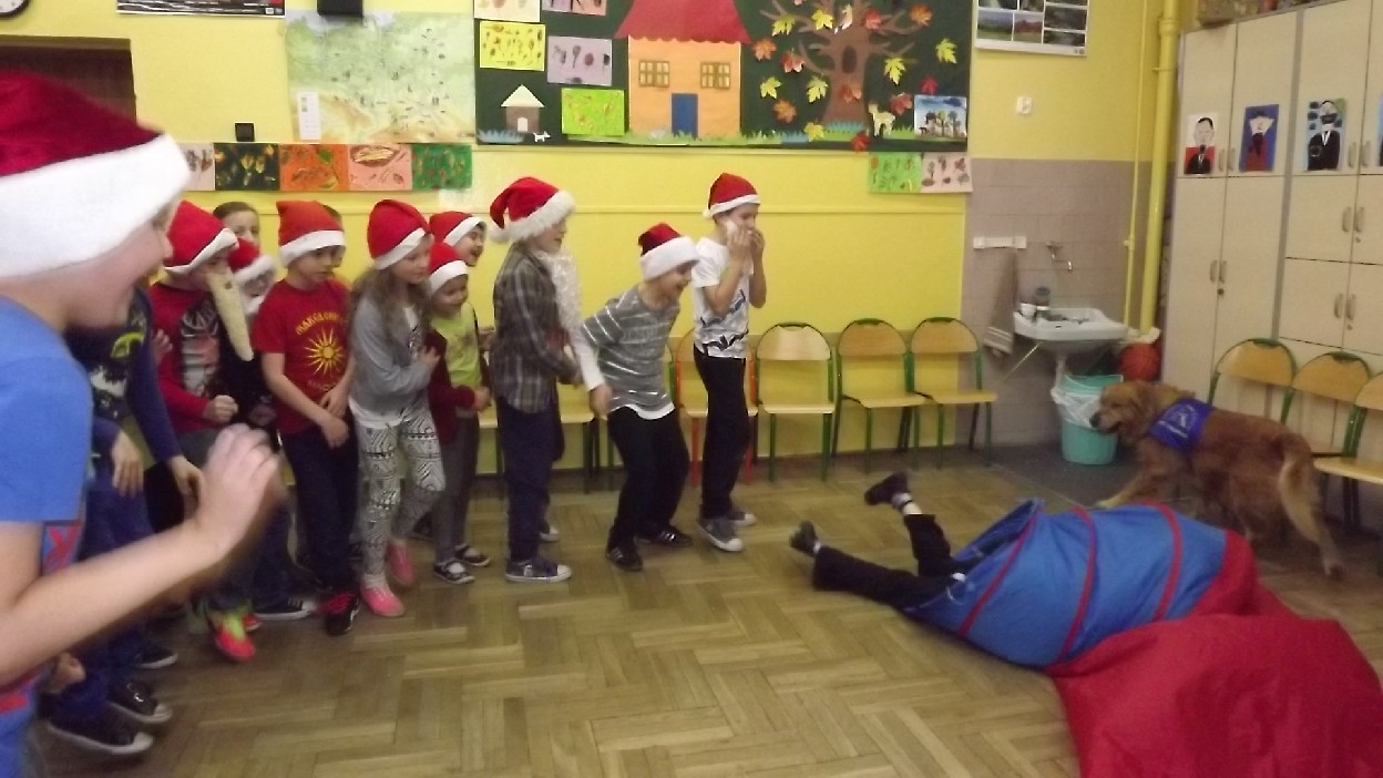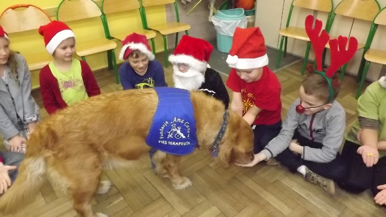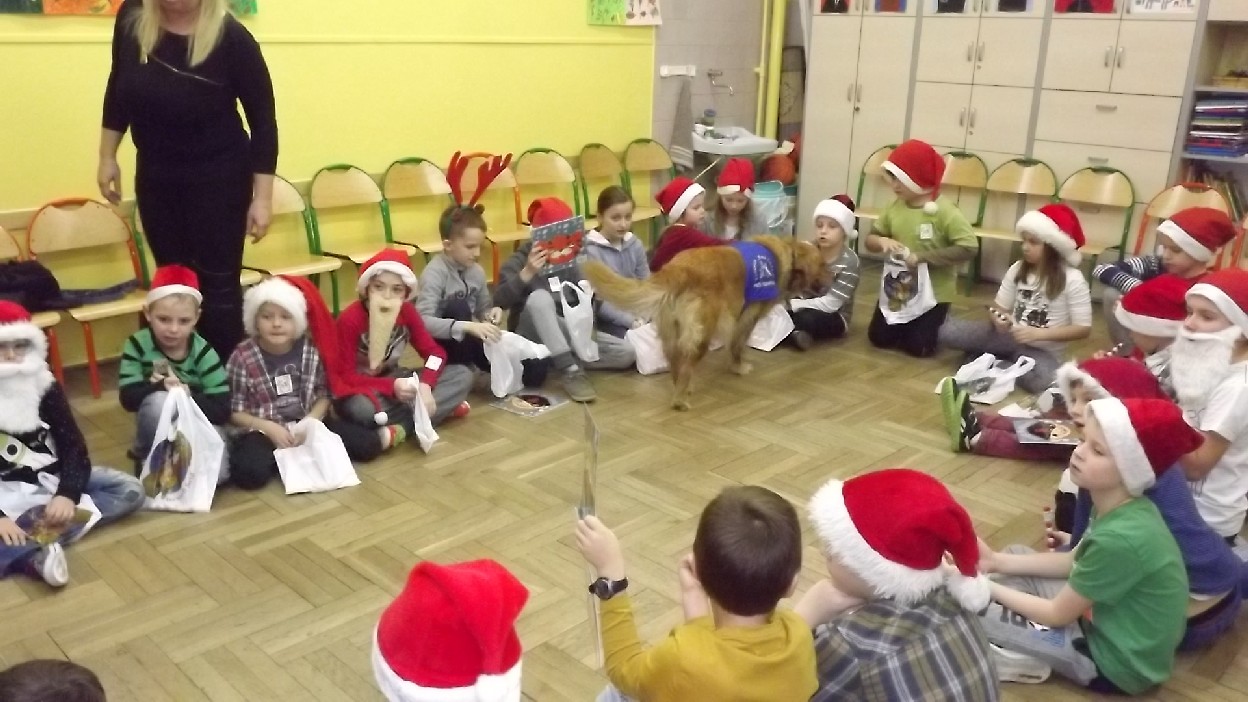 Rodzice dzieci z klasy 2 b przyzwyczaili swoje pociechy do różnych niezwykłości. W ubiegłym roku z okazji Mikołajek do dzieci przyszła pani florystka. W bieżącym roku wizyta była równie niezwykła. Gościem była pani Anna Mikołajczyk nauczyciel dogoterapeuta z suczką Gracją. Gracja jest dyplomowanym psem terapeutą, goldenem retriverem, a przede wszystkim sympatyczną suczką przyjaciółką dzieci.