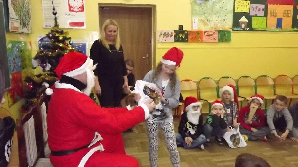 Samo jej pojawienie się w klasie wywołało uśmiech na wszystkich twarzach. Pani Ania razem z Gracją bawiły się z dziećmi dostarczając im niezwykłych emocji. Jakby tego było mało, później pojawił się w klasie drugi gość – sam Święty Mikołaj, który wręczał dzieciom upominki. Niezwykłe Mikołajki dobiegły końca, ale na pewno długo pozostaną w pamięci dzieci z klasy 2b.
