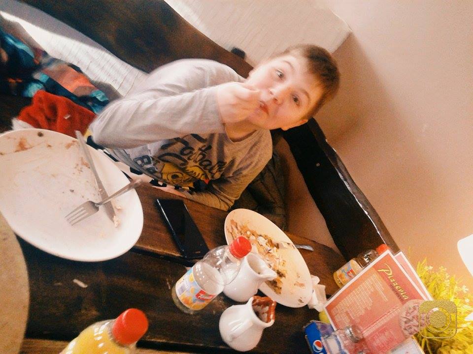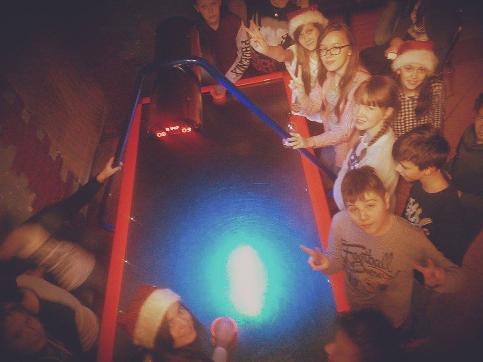 O godzinie 10:35 zebraliśmy się w szatni, a następnie udaliśmy się do naszego celu. Dumnie spacerowaliśmy po ulicach miasta ubrani w czerwone czapki św. Mikołaja. Rozmawialiśmy o prezentach, które dostaliśmy oraz o sposobie spędzania świąt Bożego Narodzenia. Po przybyciu usiedliśmy przy stołach. Wreszcie podano nam pizze i zabraliśmy się za jedzenie ich. Wszystko nam bardzo smakowało. Z pełnymi brzuchami zeszliśmy do piwnicy, a tam graliśmy w cymbergaja oraz wspólnie się śmialiśmy. Smutni wracaliśmy na lekcje rozpamiętując spędzone na rozmowach prawie dwie godziny. Zawitaliśmy jeszcze do muzeum w Turku, aby obejrzeć wystawę o naszej szkole. Zadziwiły nas stare zeszyty, pomoce, a najbardziej zdjęcia. Z trudem rozpoznawaliśmy na nich poszczególne pomieszczenia. Mimo to, miło wspominamy wizytę.