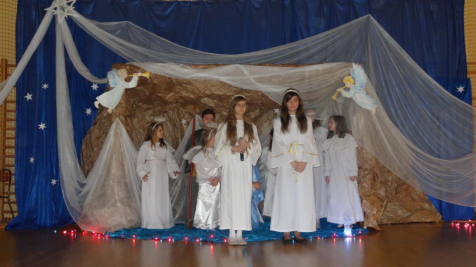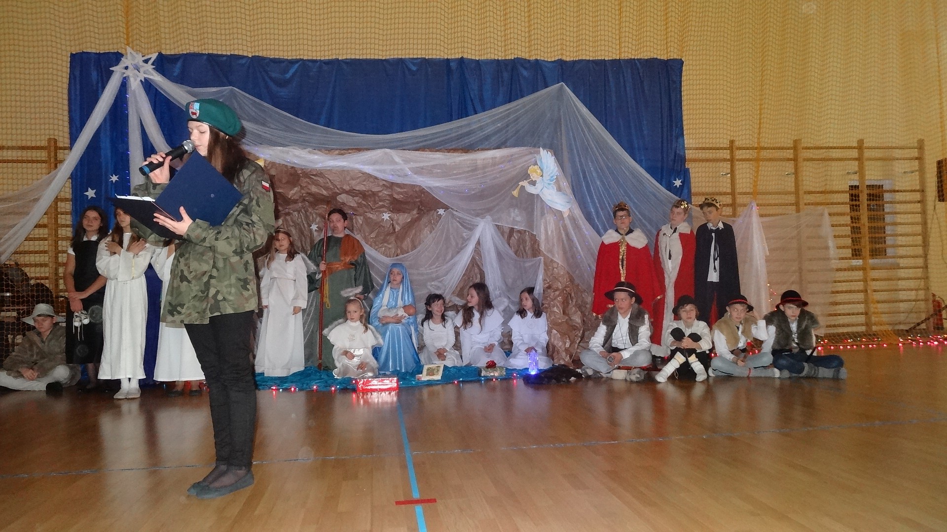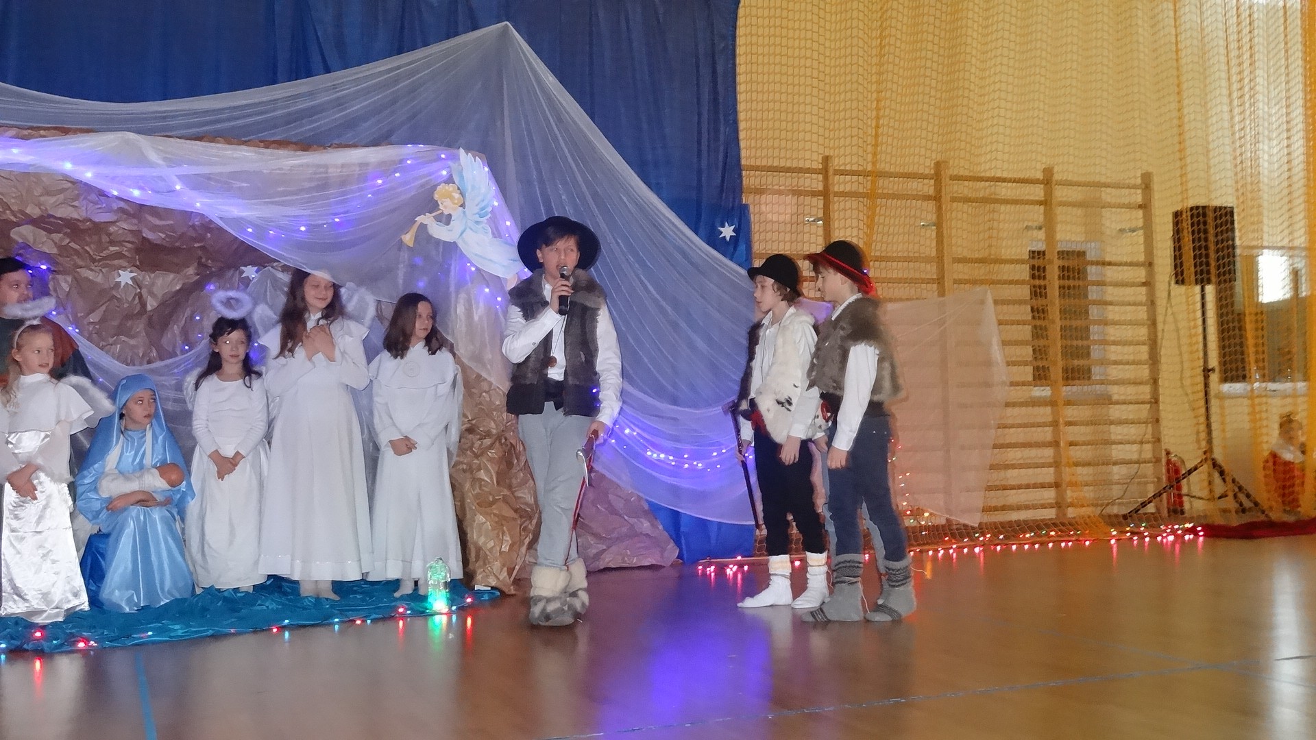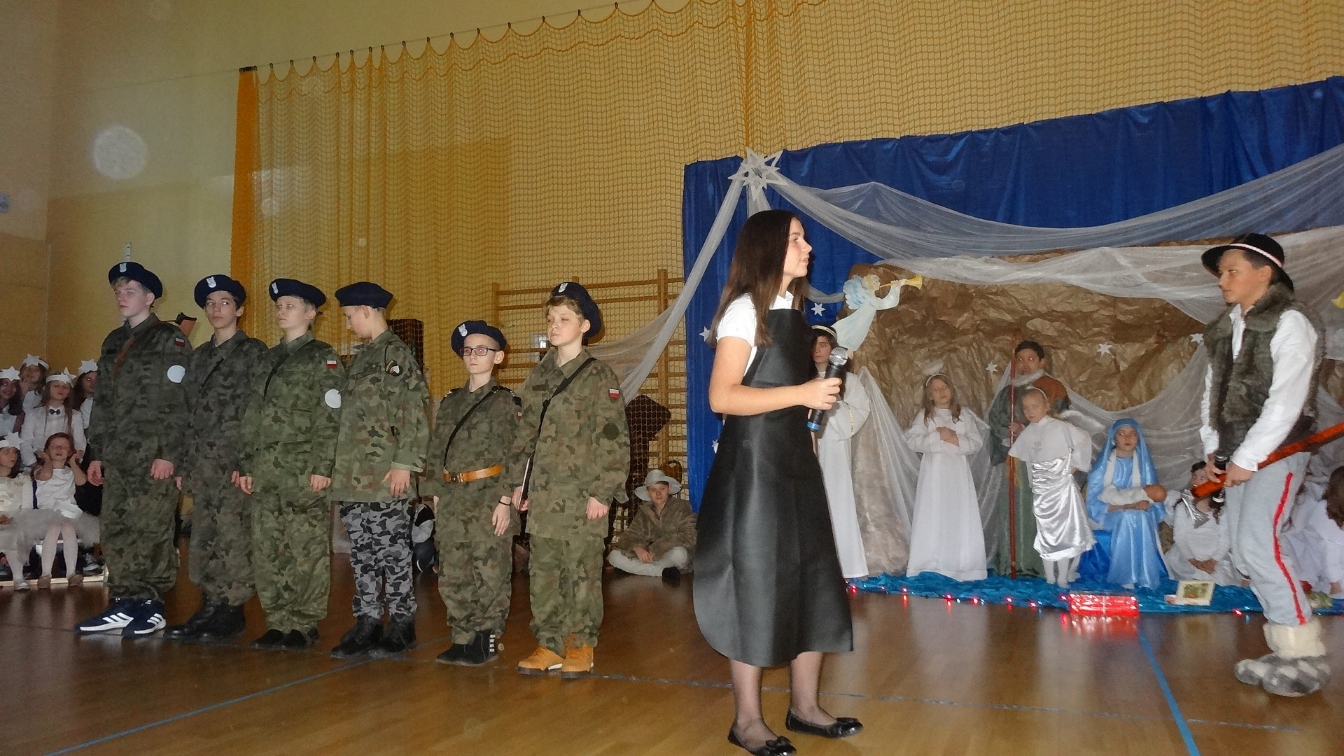 Po zebraniu się na hali gimnastycznej, Weronika Dziamara pięknie zagrała kolędę ,,Cicha noc na wiolonczeli. Następnie na scenę wyszedł anioł i ślicznie zaśpiewał pastorałkę. Później zobaczyliśmy niebiańską istotę przemawiającą do zgromadzonych. Ujrzeliśmy zmęczoną Maryję wraz z Józefem, którzy szukali noclegu, a ponieważ nigdzie go nie znaleźli, zatrzymali się w zubożałej stajence. Niedługo po tym, Matka kołysała już malutkiego Jezuska w swych ramionach pośród milczących aniołków. Jako pierwsi do szopy przybyli pastuszkowie, a po nich przybiegli weseli górale, zatańczyli charakterystyczny taniec z ciupagami oraz zaśpiewali. Do Świętej Rodziny zmierzali również szewcy i szwaczki, aby podarować trzewiki. Następnie ujrzeliśmy trzech królów, którzy nieśli skarby - kadzidło, mirrę oraz złoto. Po chwili na scenie pojawili się żołnierze. Uczennica klasy VIe - Klaudia Michalak, przeczytała wiersz o Bożym Narodzeniu, a Agata Drabina odmówiła ,,Modlitwę za Ojczyznę. Narrator złożył wszystkim życzenia. Cały występ pełen był kolęd oraz pastorałek. Śpiewaliśmy m. in. ,, Cichą noc, ,,Przybieżeli do Betlejem, ,,Wśród nocnej ciszy. Całe przedstawienie urok zawdzięczało również przepięknej scenerii. Białe lampeczki i gwiazdki przenosiły nas w niebiański świat, a błękitne tkaniny sprawiały wrażenie pobytu w mistycznym miejscu. Niezwykłe kostiumy zabierały zgromadzonych do Betlejem, abyśmy mogli ujrzeć cud, który zdarzył się przed wiekami, a nadal jest pamiętany i rozgłaszany.