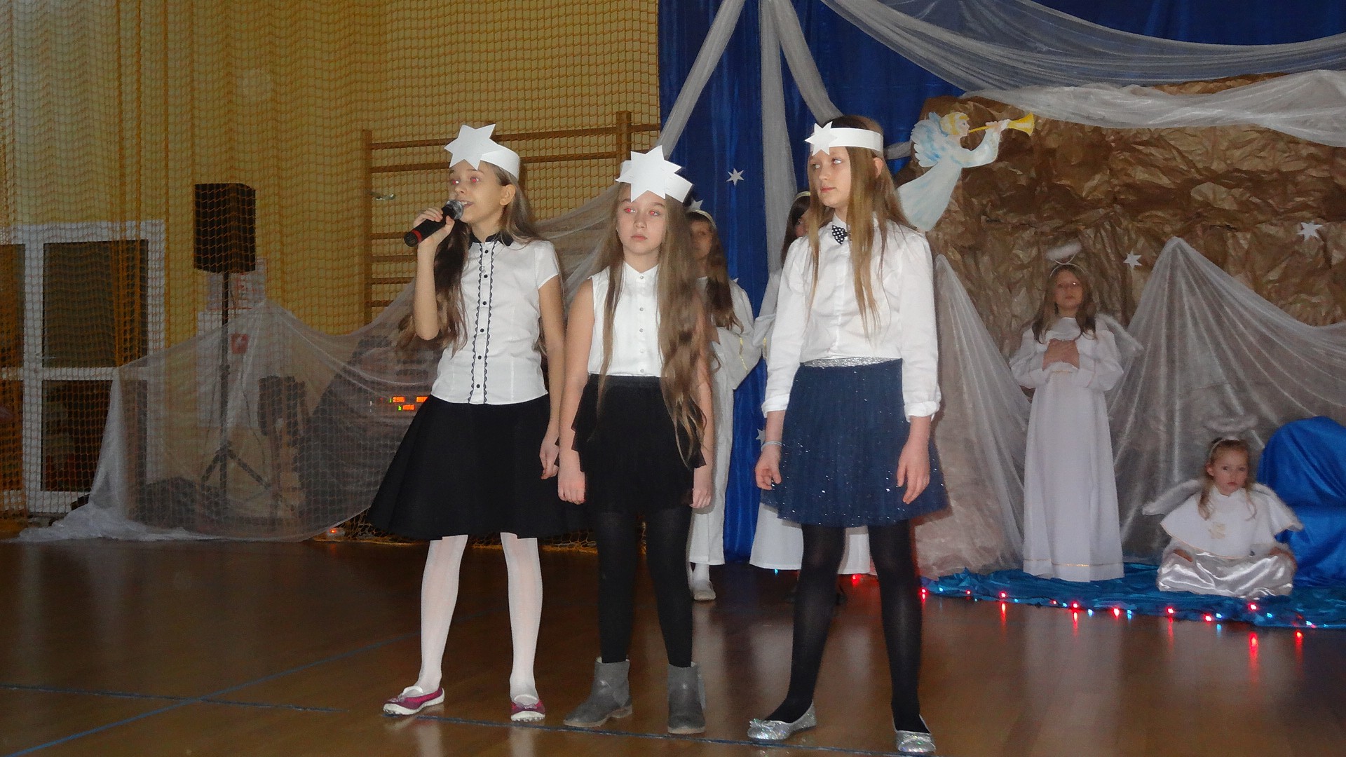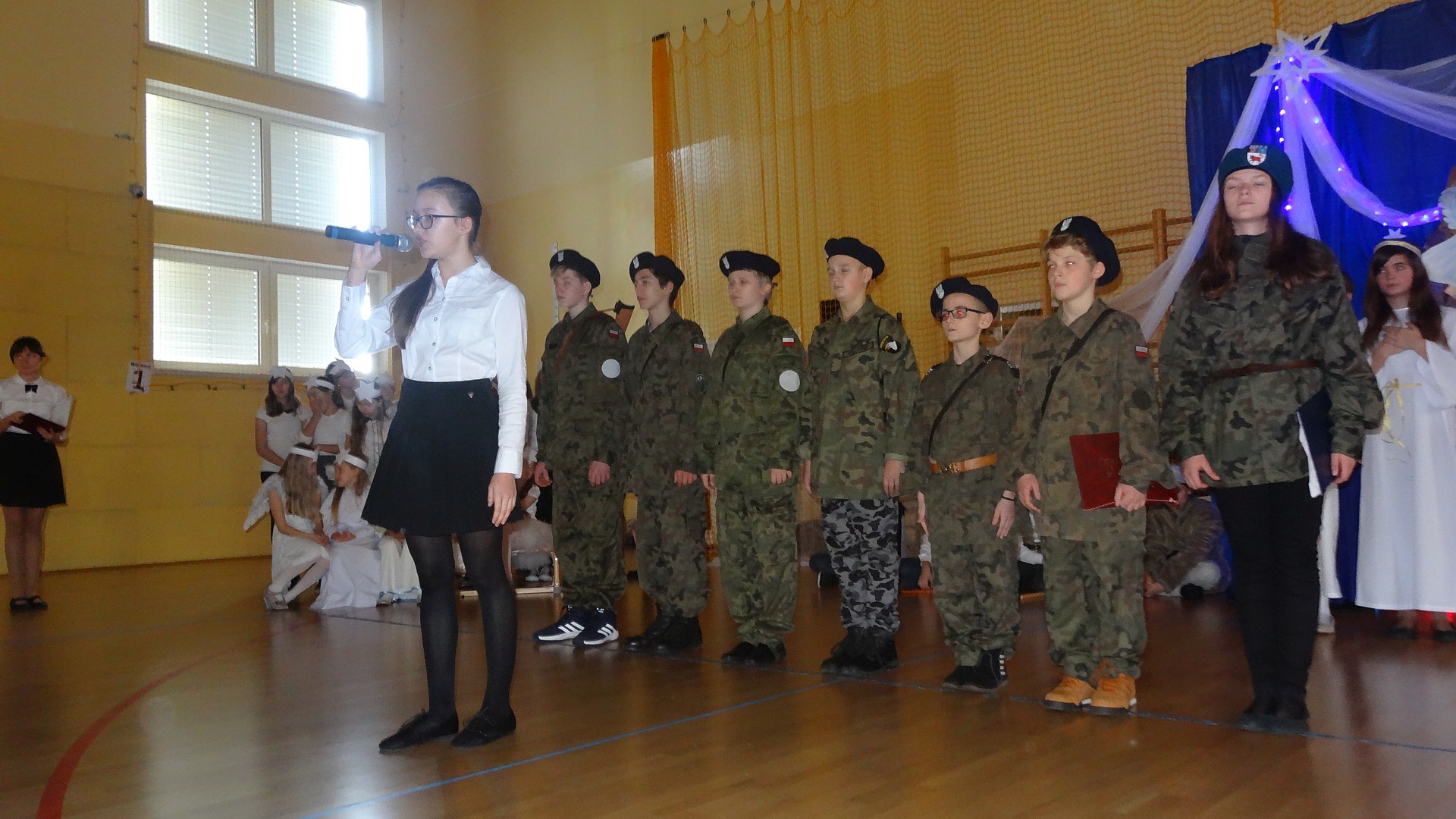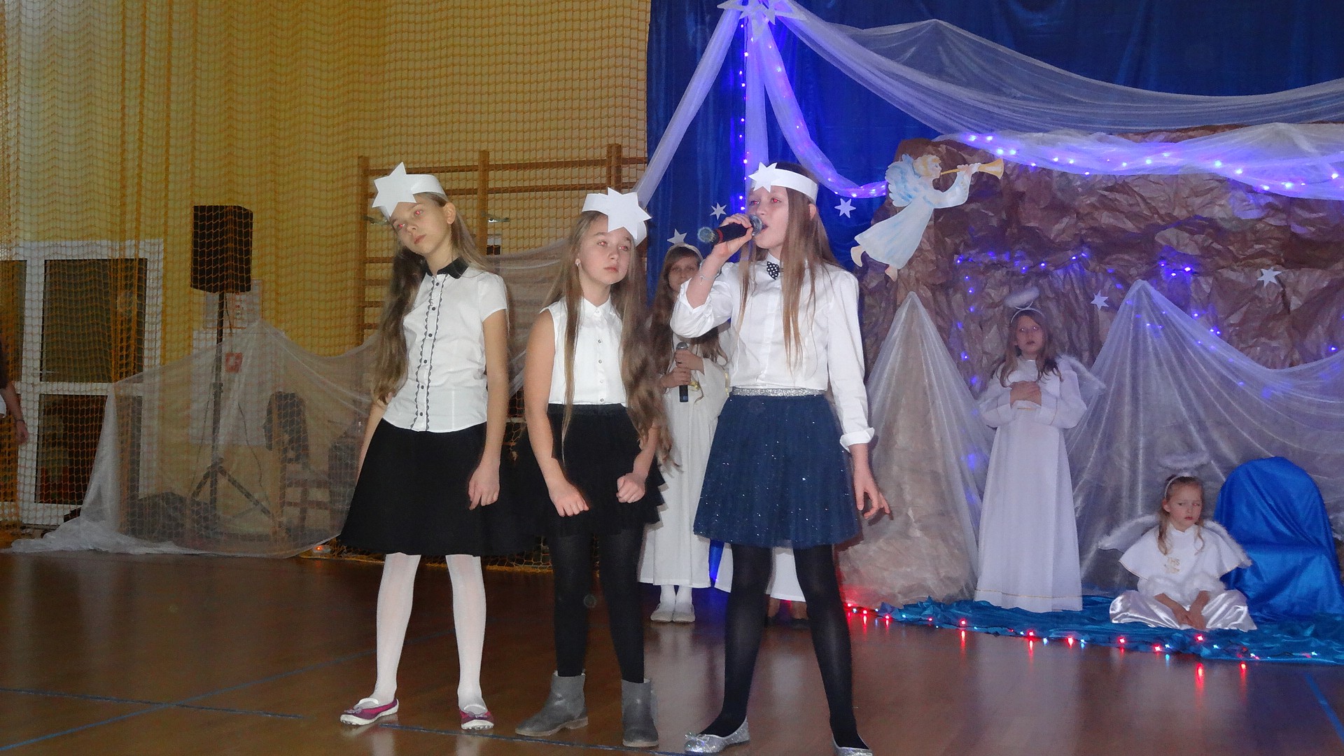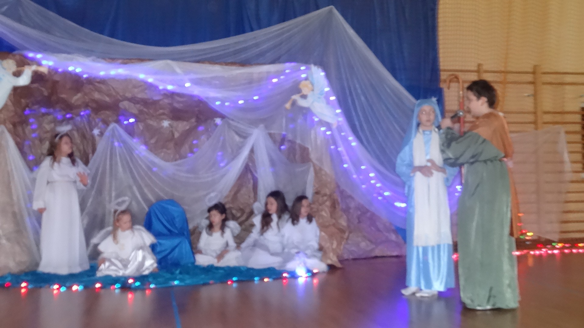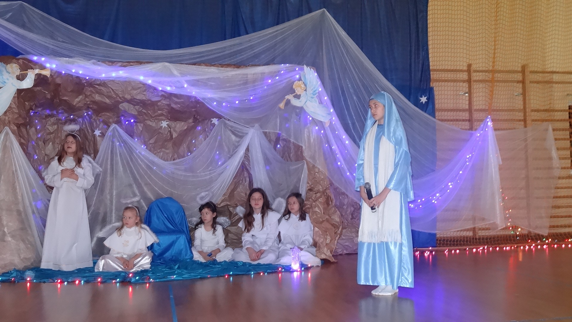 Po zebraniu się na hali gimnastycznej, Weronika Dziamara pięknie zagrała kolędę ,,Cicha noc na wiolonczeli. Następnie na scenę wyszedł anioł i ślicznie zaśpiewał pastorałkę. Później zobaczyliśmy niebiańską istotę przemawiającą do zgromadzonych. Ujrzeliśmy zmęczoną Maryję wraz z Józefem, którzy szukali noclegu, a ponieważ nigdzie go nie znaleźli, zatrzymali się w zubożałej stajence. Niedługo po tym, Matka kołysała już malutkiego Jezuska w swych ramionach pośród milczących aniołków. Jako pierwsi do szopy przybyli pastuszkowie, a po nich przybiegli weseli górale, zatańczyli charakterystyczny taniec z ciupagami oraz zaśpiewali. Do Świętej Rodziny zmierzali również szewcy i szwaczki, aby podarować trzewiki. Następnie ujrzeliśmy trzech królów, którzy nieśli skarby - kadzidło, mirrę oraz złoto. Po chwili na scenie pojawili się żołnierze. Uczennica klasy VIe - Klaudia Michalak, przeczytała wiersz o Bożym Narodzeniu, a Agata Drabina odmówiła ,,Modlitwę za Ojczyznę. Narrator złożył wszystkim życzenia. Cały występ pełen był kolęd oraz pastorałek. Śpiewaliśmy m. in. ,, Cichą noc, ,,Przybieżeli do Betlejem, ,,Wśród nocnej ciszy. Całe przedstawienie urok zawdzięczało również przepięknej scenerii. Białe lampeczki i gwiazdki przenosiły nas w niebiański świat, a błękitne tkaniny sprawiały wrażenie pobytu w mistycznym miejscu. Niezwykłe kostiumy zabierały zgromadzonych do Betlejem, abyśmy mogli ujrzeć cud, który zdarzył się przed wiekami, a nadal jest pamiętany i rozgłaszany.
