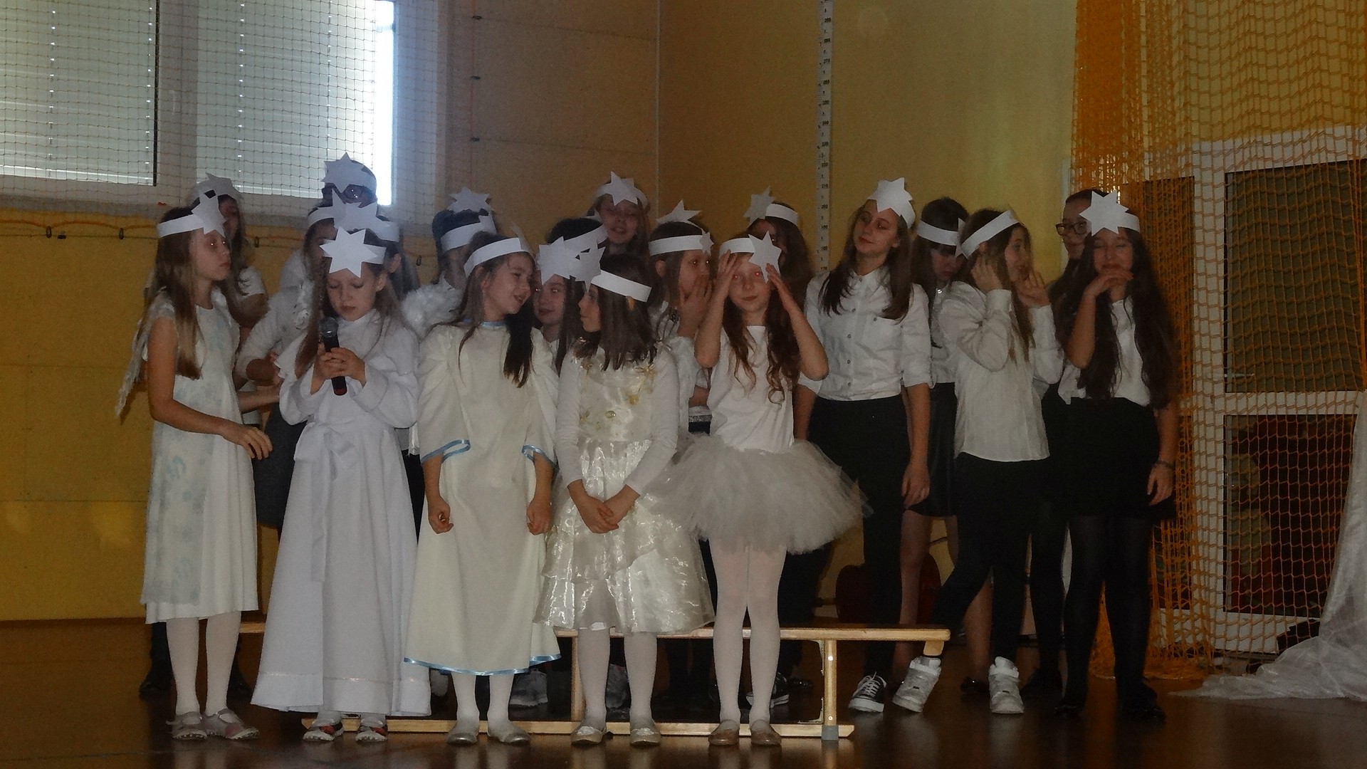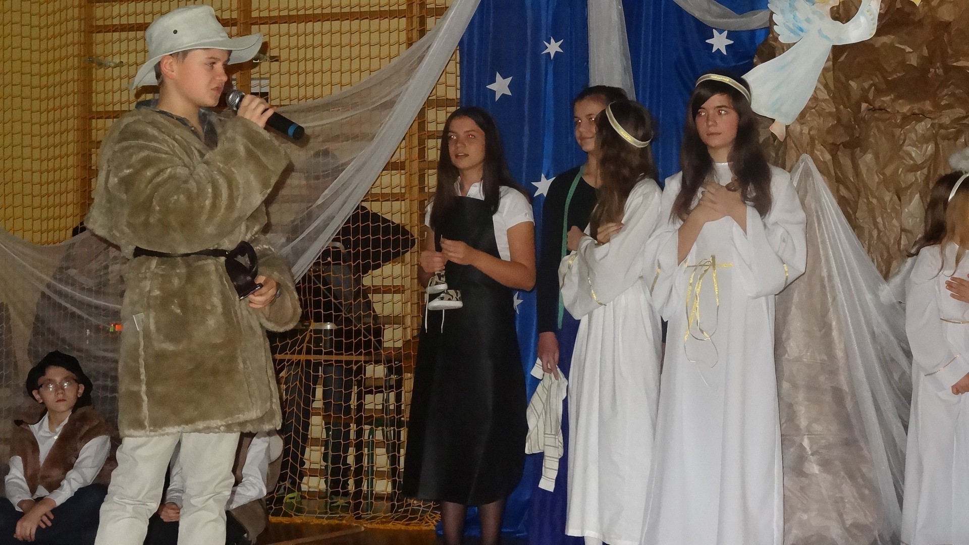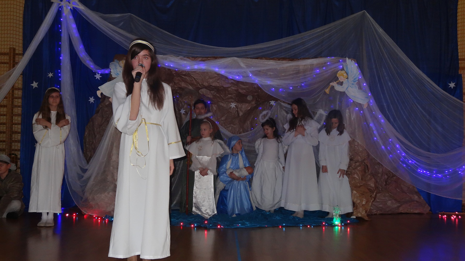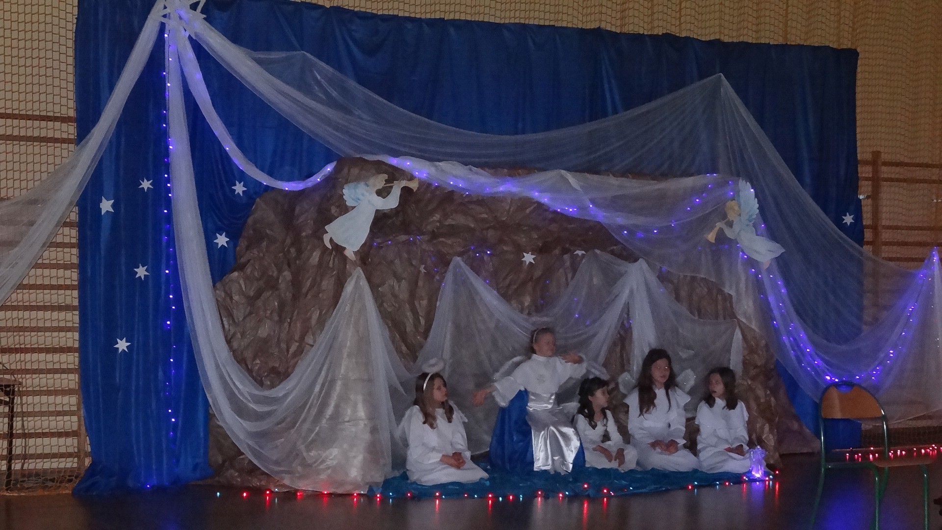 Po zebraniu się na hali gimnastycznej, Weronika Dziamara pięknie zagrała kolędę ,,Cicha noc na wiolonczeli. Następnie na scenę wyszedł anioł i ślicznie zaśpiewał pastorałkę. Później zobaczyliśmy niebiańską istotę przemawiającą do zgromadzonych. Ujrzeliśmy zmęczoną Maryję wraz z Józefem, którzy szukali noclegu, a ponieważ nigdzie go nie znaleźli, zatrzymali się w zubożałej stajence. Niedługo po tym, Matka kołysała już malutkiego Jezuska w swych ramionach pośród milczących aniołków. Jako pierwsi do szopy przybyli pastuszkowie, a po nich przybiegli weseli górale, zatańczyli charakterystyczny taniec z ciupagami oraz zaśpiewali. Do Świętej Rodziny zmierzali również szewcy i szwaczki, aby podarować trzewiki. Następnie ujrzeliśmy trzech królów, którzy nieśli skarby - kadzidło, mirrę oraz złoto. Po chwili na scenie pojawili się żołnierze. Uczennica klasy VIe - Klaudia Michalak, przeczytała wiersz o Bożym Narodzeniu, a Agata Drabina odmówiła ,,Modlitwę za Ojczyznę. Narrator złożył wszystkim życzenia. Cały występ pełen był kolęd oraz pastorałek. Śpiewaliśmy m. in. ,, Cichą noc, ,,Przybieżeli do Betlejem, ,,Wśród nocnej ciszy. Całe przedstawienie urok zawdzięczało również przepięknej scenerii. Białe lampeczki i gwiazdki przenosiły nas w niebiański świat, a błękitne tkaniny sprawiały wrażenie pobytu w mistycznym miejscu. Niezwykłe kostiumy zabierały zgromadzonych do Betlejem, abyśmy mogli ujrzeć cud, który zdarzył się przed wiekami, a nadal jest pamiętany i rozgłaszany.