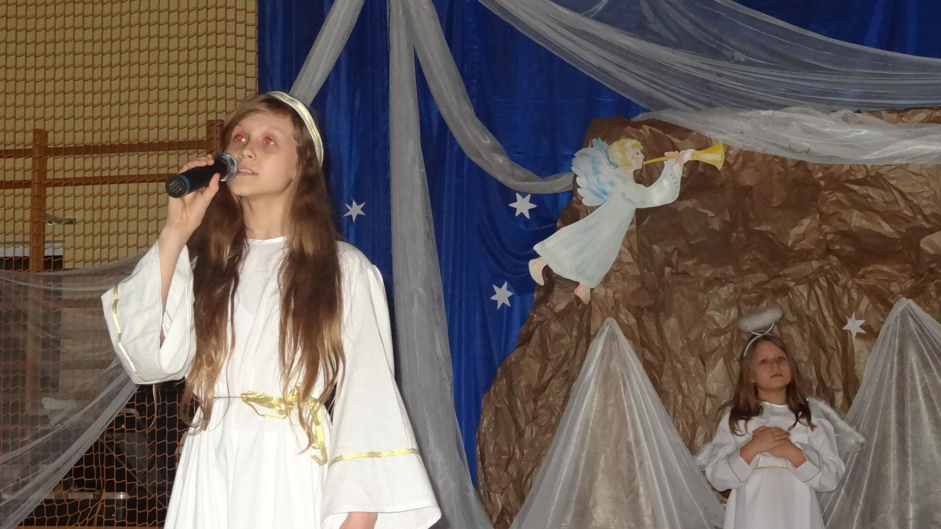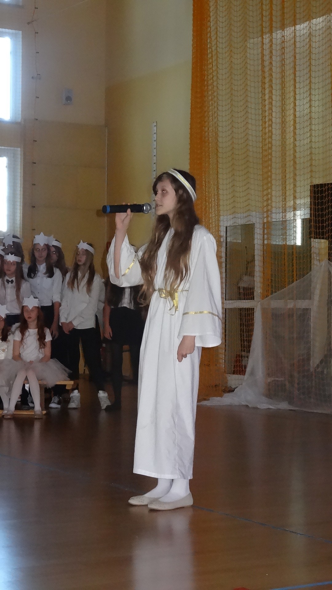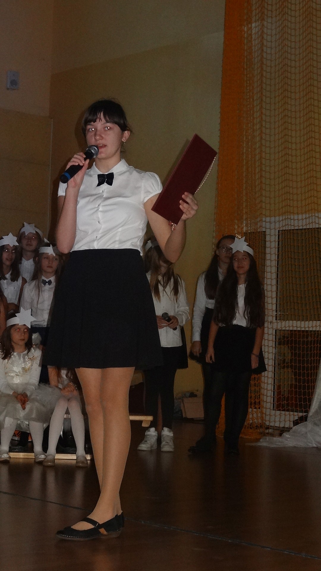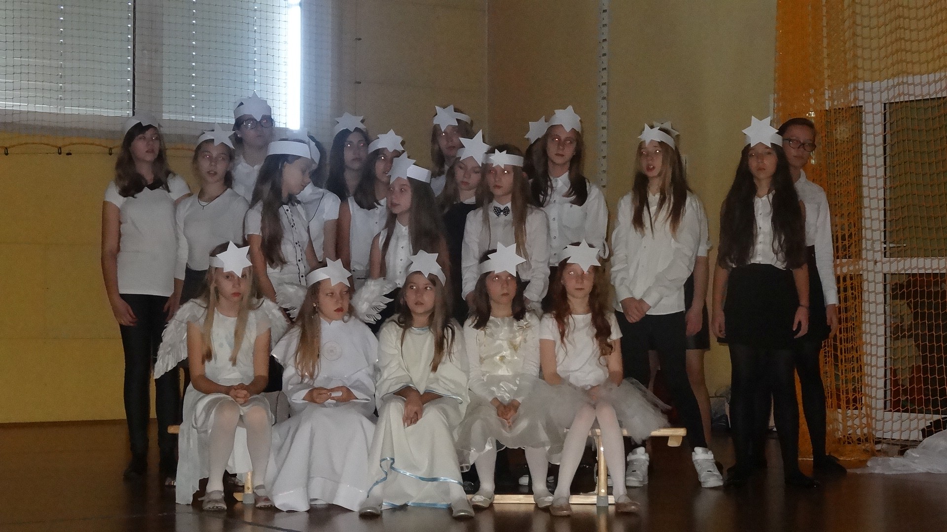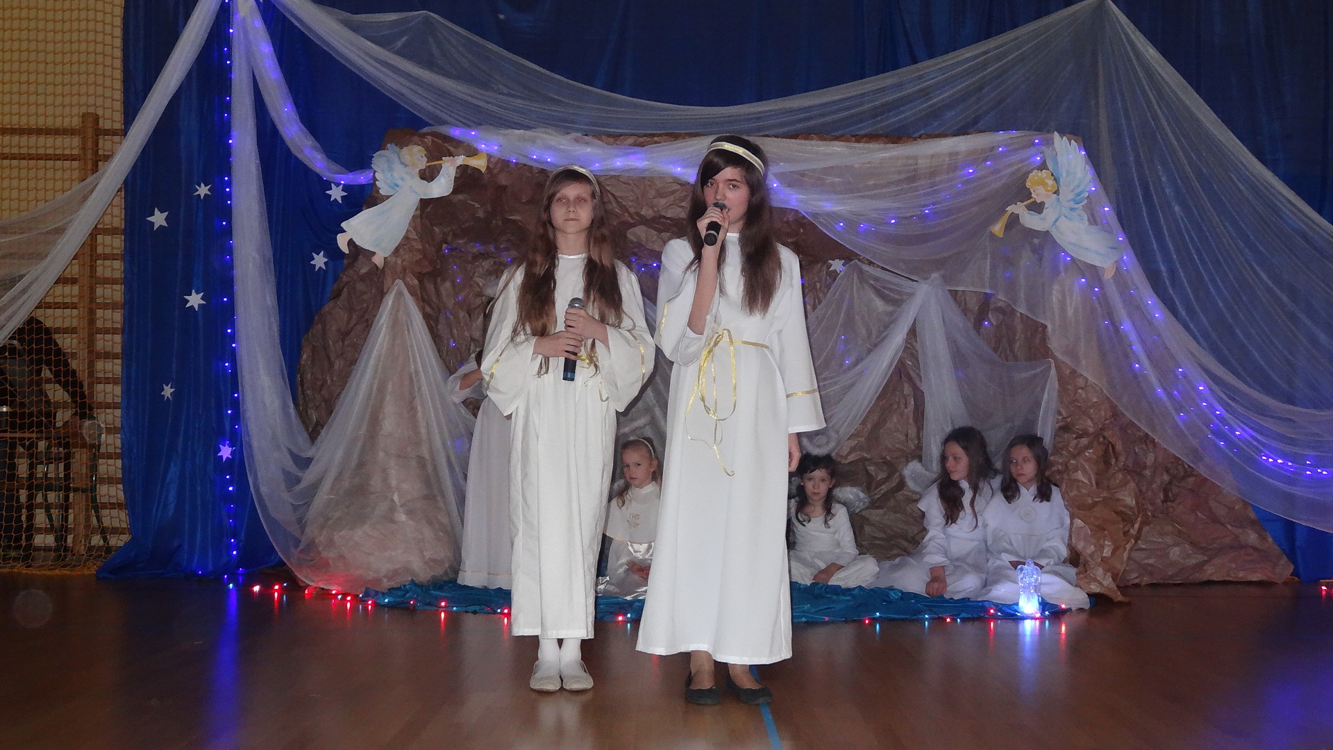 Po zebraniu się na hali gimnastycznej, Weronika Dziamara pięknie zagrała kolędę ,,Cicha noc na wiolonczeli. Następnie na scenę wyszedł anioł i ślicznie zaśpiewał pastorałkę. Później zobaczyliśmy niebiańską istotę przemawiającą do zgromadzonych. Ujrzeliśmy zmęczoną Maryję wraz z Józefem, którzy szukali noclegu, a ponieważ nigdzie go nie znaleźli, zatrzymali się w zubożałej stajence. Niedługo po tym, Matka kołysała już malutkiego Jezuska w swych ramionach pośród milczących aniołków. Jako pierwsi do szopy przybyli pastuszkowie, a po nich przybiegli weseli górale, zatańczyli charakterystyczny taniec z ciupagami oraz zaśpiewali. Do Świętej Rodziny zmierzali również szewcy i szwaczki, aby podarować trzewiki. Następnie ujrzeliśmy trzech królów, którzy nieśli skarby - kadzidło, mirrę oraz złoto. Po chwili na scenie pojawili się żołnierze. Uczennica klasy VIe - Klaudia Michalak, przeczytała wiersz o Bożym Narodzeniu, a Agata Drabina odmówiła ,,Modlitwę za Ojczyznę. Narrator złożył wszystkim życzenia. Cały występ pełen był kolęd oraz pastorałek. Śpiewaliśmy m. in. ,, Cichą noc, ,,Przybieżeli do Betlejem, ,,Wśród nocnej ciszy. Całe przedstawienie urok zawdzięczało również przepięknej scenerii. Białe lampeczki i gwiazdki przenosiły nas w niebiański świat, a błękitne tkaniny sprawiały wrażenie pobytu w mistycznym miejscu. Niezwykłe kostiumy zabierały zgromadzonych do Betlejem, abyśmy mogli ujrzeć cud, który zdarzył się przed wiekami, a nadal jest pamiętany i rozgłaszany.