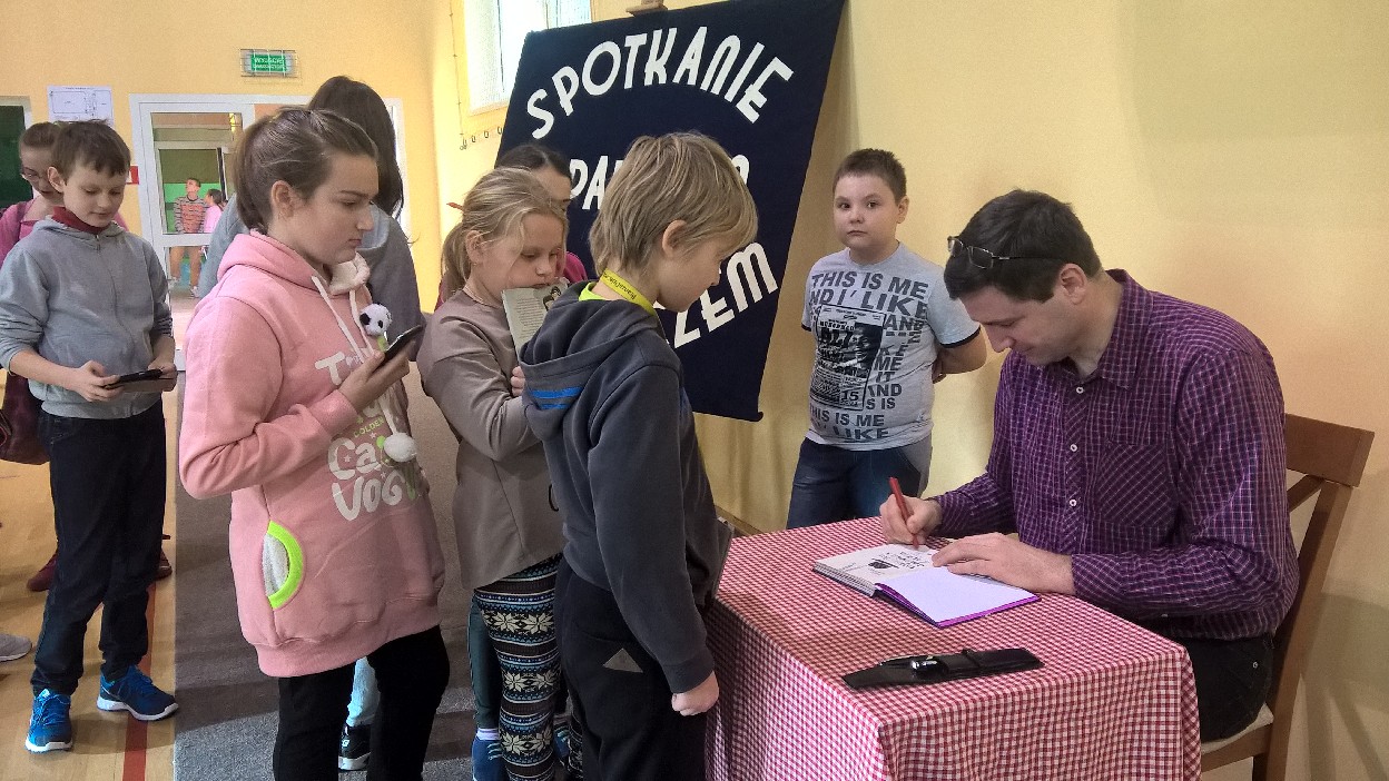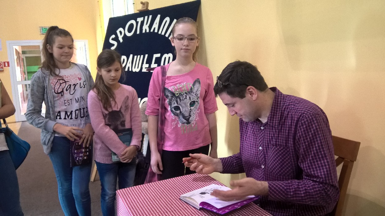 Pan Paweł poprowadził spotkanie dla swoich czytelników w ciekawej formule, zapraszając uczniów do rozmowy o książkach przy herbacie. Z tych rozmów wszyscy mogli dowiedzieć się ciekawych historii o tym, jak np. doszło do powstania książek o rodzinie Ciumków, dlaczego warto przeczytać książkę „Pieniądze czy kasa”. Jednakże największą popularność zyskała „Tajemnica człowieka z blizną”, którą prawie każdy uczeń chciał zdobyć do własnej, domowej biblioteczki.