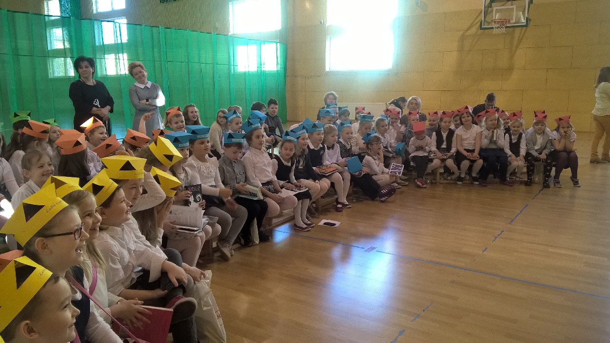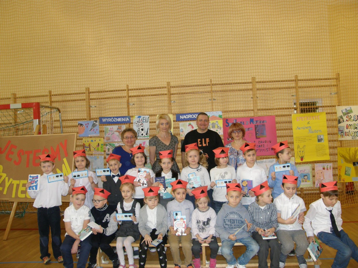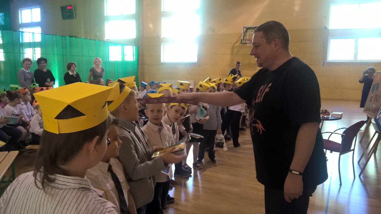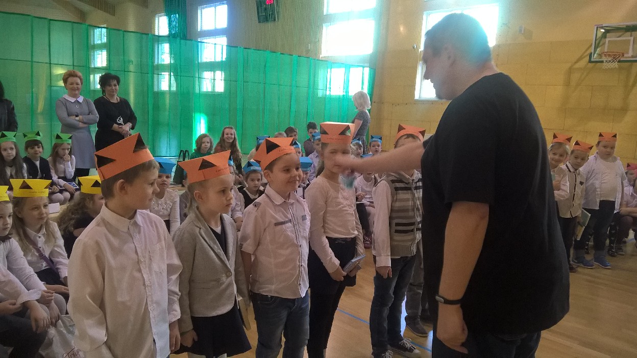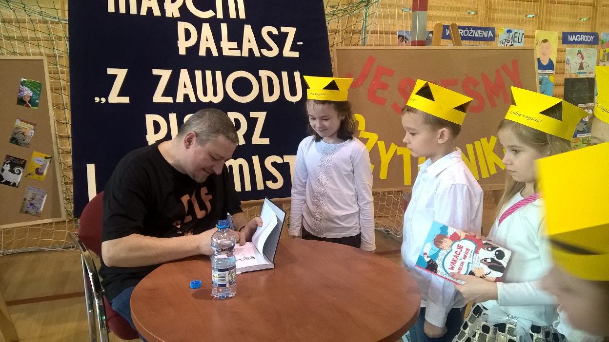 Wizyta specjalnego gościa była niesamowitym przeżyciem dla uczniów klas I, którzy zostali Pasowani na Czytelnika biblioteki szkolnej przez samego Marcina Pałasza. Ten wyjątkowy pisarz, obdarzony ogromnym poczuciem humoru i znajomością dziecięcej psychiki sprawił, że wszyscy zachłannie słuchali jego opowieści, wybuchając co chwilę serdecznym śmiechem.