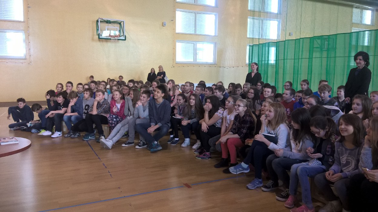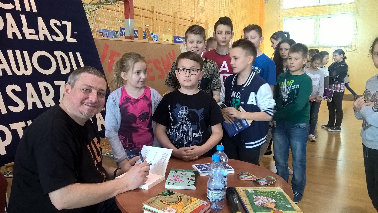 W spotkaniu autorskim z Pisarzem wzięli udział uczniowie klas II – VI. Wszyscy świetnie się bawili, słuchając opowieści naszego Gościa o tym, jak powstają Jego książki, sąd się biorą pomysły do pisania tekstów, które stają się później bestsellerami. Najważniejszym bohaterem opowieści Pana Marcina był Jego przyjaciel pies, o imieniu Elf. Uczniowie zasypali Pisarza pytaniami, na które Gość odpowiadał z właściwym sobie poczuciem humoru. Na koniec ustawiła się ogromna kolejka po autograf. Obliczyliśmy, że w sumie pisarz udzielił ich około 1000.