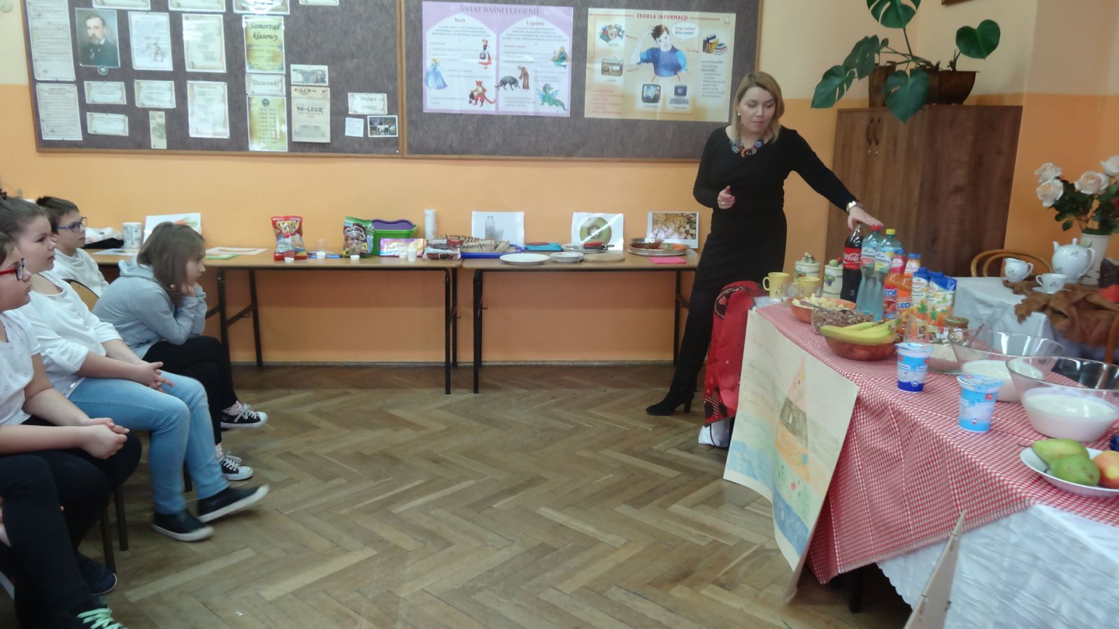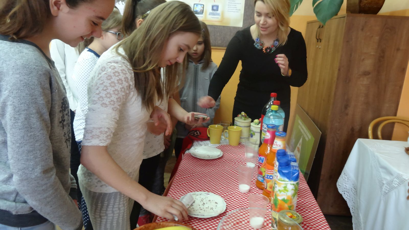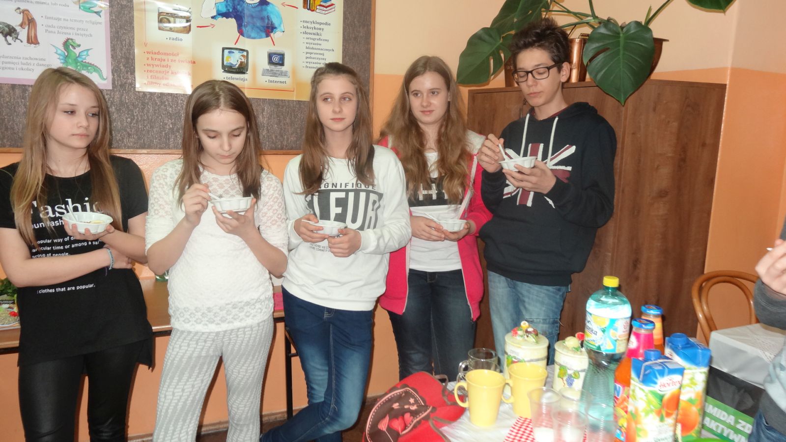22 marca w sali 407 odbyło się spotkanie z dietetykiem, panią Justyną Wodzińską. Wzięli w nim udział uczniowie, rodzice i nauczyciele. Spotkanie to odbyło sie medodą warsztatową. Najpierw pani dietetyk wspólnie z uczniami omówiła zasady odżywiania zgodne z nową Piramidą Zdrowego Odżywiania i Aktywności Fizycznej. Później wszyscy uczestnicy spotkania przekonali się, ile cukru mieści się w różnych napojach typu coca cola, napój owocowy, woda smakowa itp. Następnym etapem było eliminowanie ze stołu produktów kalorycznych, a zastępowanie zdrowymi. Pani dietetyk swierdził, że coś słodkiego człowiek również musi zjadać aby odżywić mózg, więc zaproponowała przygotowanie słodkiego deseru. Deser okazał się wyśmienity. Warto zapamiętać składniki: jogurt naturalny, banan, płatki kukurydziane, miód, orzechy włoskie.