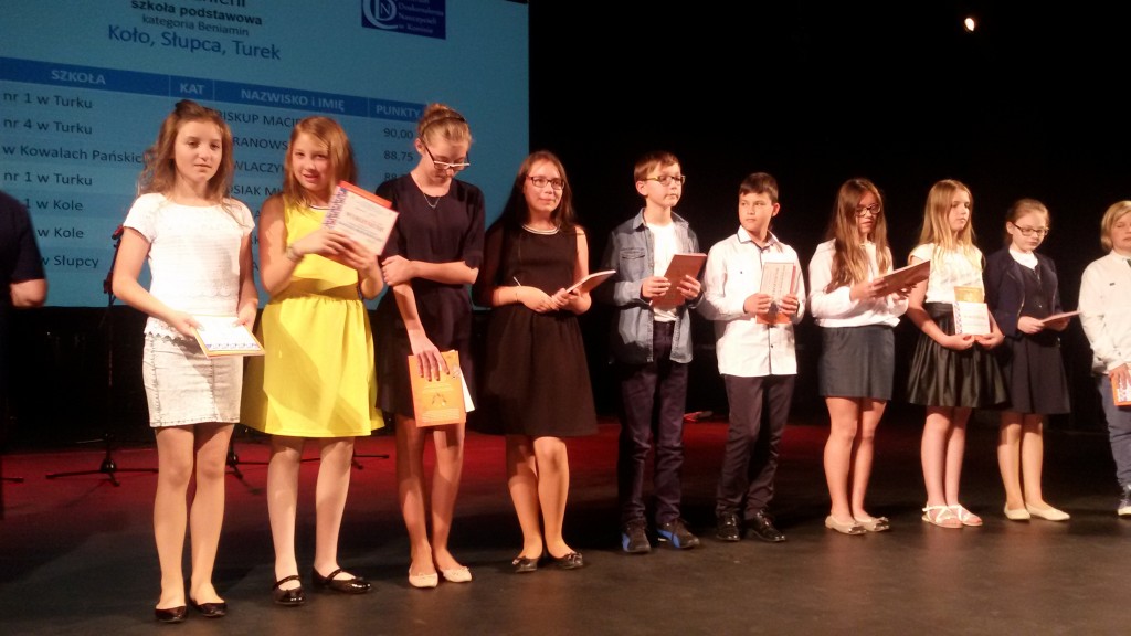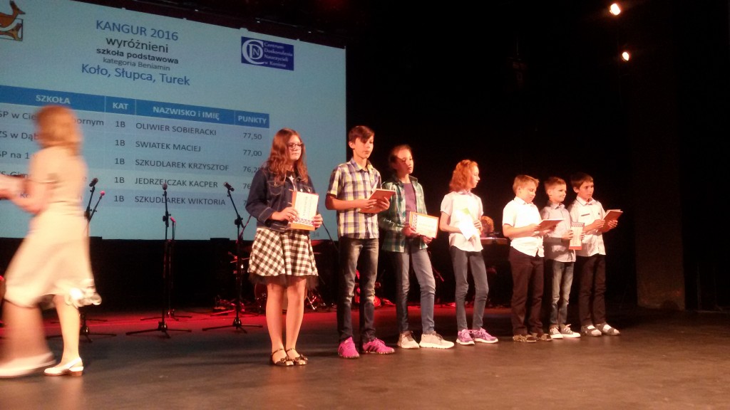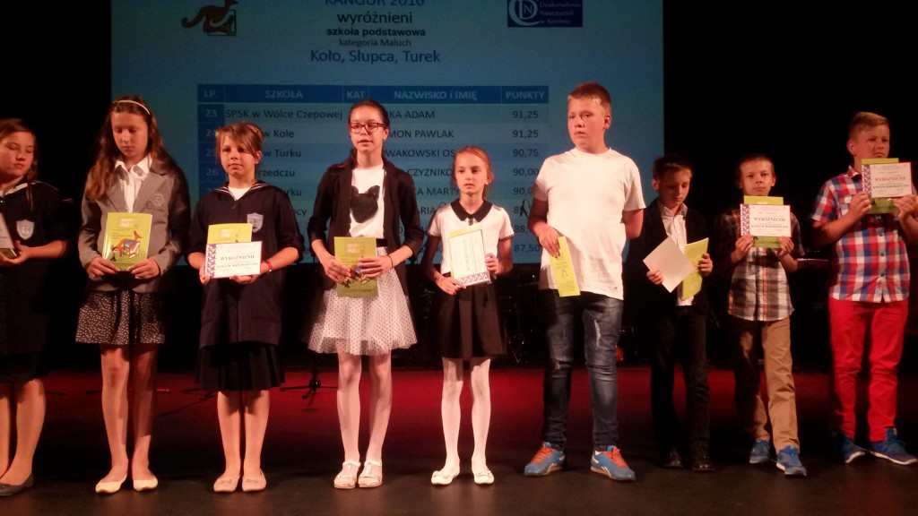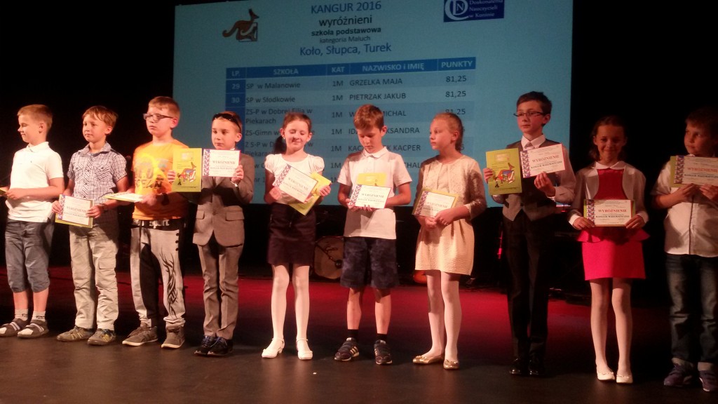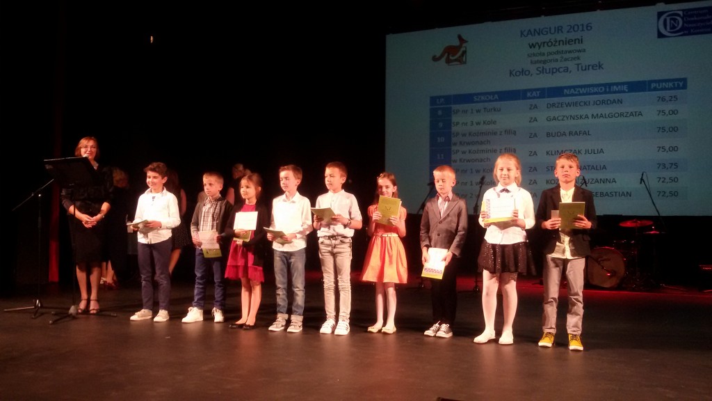Wszyscy wiemy, że w naszej szkole jest bardzo dużo dzieci uzdolnionych matematycznie.Potwierdzeniem tego są nagrody zdobywane corocznie w różnego rodzaju konkursach matematycznych. Szczególnym konkursem jest Międzynarodowy Konkurs Matematyczny KANGUR. Szczególny, bo jest nietypowy i trudny. Każdego roku mamy kilkunastu nagrodzonych uczniów z klas 2 – 6. Jak trudne są zadania Kangura wiedzą dokładnie dzieci biorące udział w konkursie oraz nauczyciele przygotowujący dzieci. Zadania wymagają talentu, logicznego myślenia oraz dużo pracy i dobrego przygotowania, gdyż są zupełnie inne od tych rozwiązywanych na lekcjach matematyki. Potwierdzeniem prestiżu i wyjątkowości Kangura jest również odbywająca się w Koninie uroczystość wręczania nagród, przebiegająca w niezwykłej oprawie artystycznej. Tak było i w tym roku. 13 czerwca zwycięzcy odbierali dyplomy i nagrody z rąk konińskiego koordynatora konkursu Kangur. Miłym i ważnym momentem uroczystości było podkreślenie przez prowadzących , że w tym roku zdecydowanie triumfuje SP 1 z Turku. Mieliśmy bowiem aż 20 nagrodzonych uczniów. Oto oni: Klasy drugie – wyróżnienia – 2b: W. Zygoń, J. Drzewiecki, P.Potyralski, I. Stasiak, 2 d: N. Sidorowicz, 2 e: P. Majewski. Klasy trzecie – wyróżnienia – 3b: M. Adamski, 3c: N. Misiek. Klasy czwarte – bardzo dobry – 4 b: M. Buda, - wyróżnienia - 4b: J. Paszak, 4d: M. Ryczyński, Sz. Kurzawa. Klasy piąte – laureat – 5d: A.Białas, -wyróżnienia - 5d: N. Kałużna, Z. Skiba, A. Kukuła, N. Grabara, M. Rosiak, 5b: F.Staszak, 5c: M. Biskup. Nauczycielki, które przygotowały dzieci to panie: A.Koszykowska: 5b, 5c, 4d, A. Majtka: 5d, W. Trocha: 4b, E. Frasunkiewicz: 2e, I.Ochota: 2d, L. Pasturek: 2b, D. Hynas: 3b, A. Perlińska: 3c.