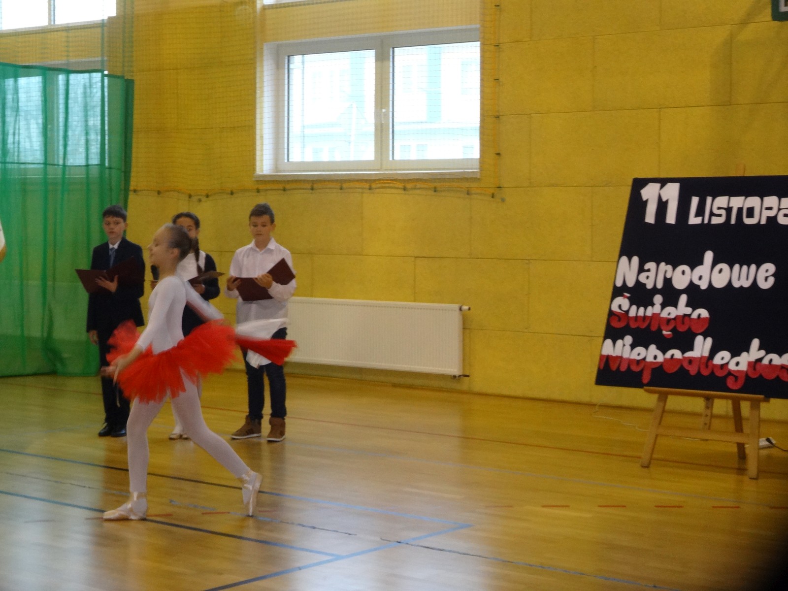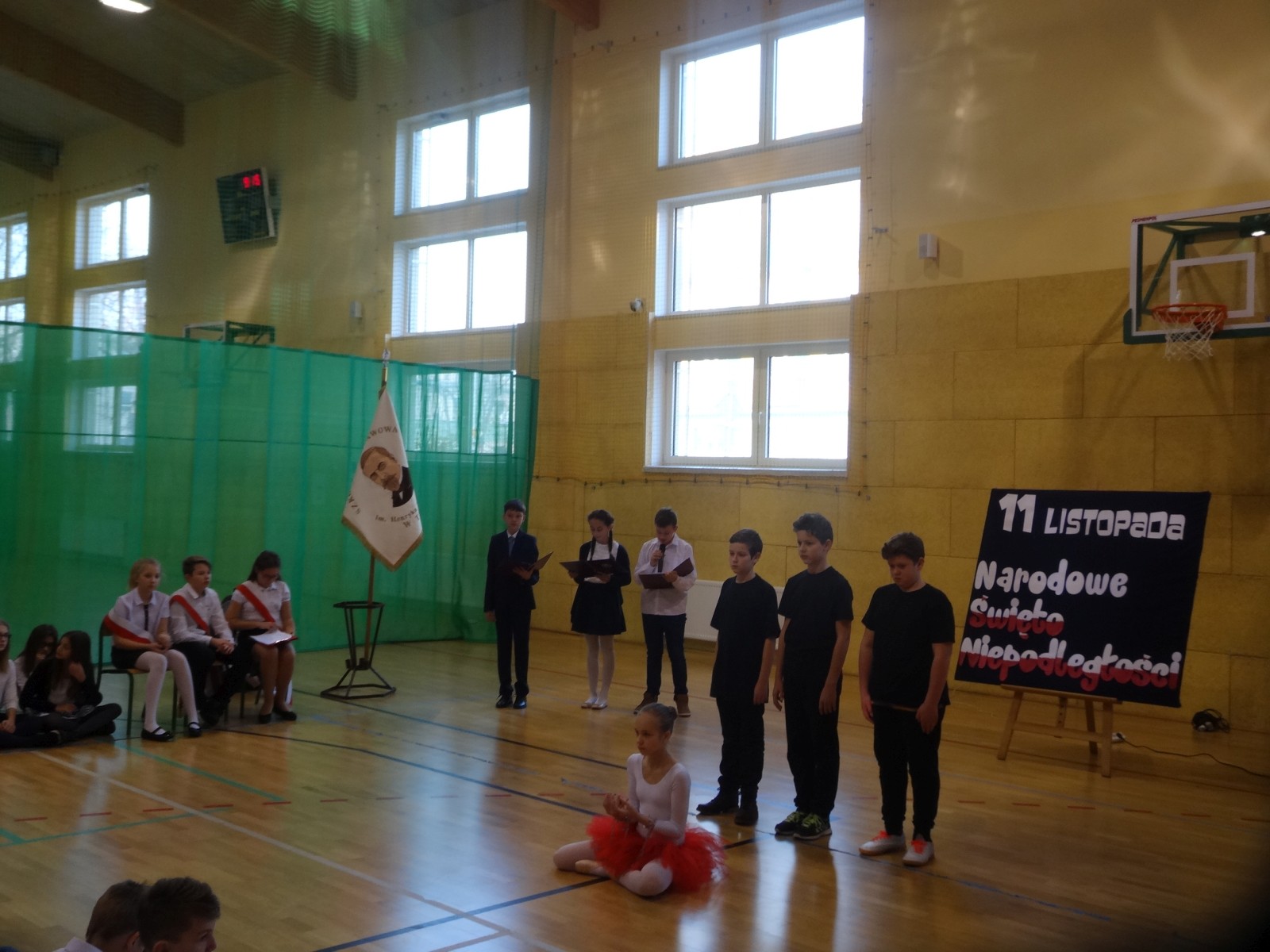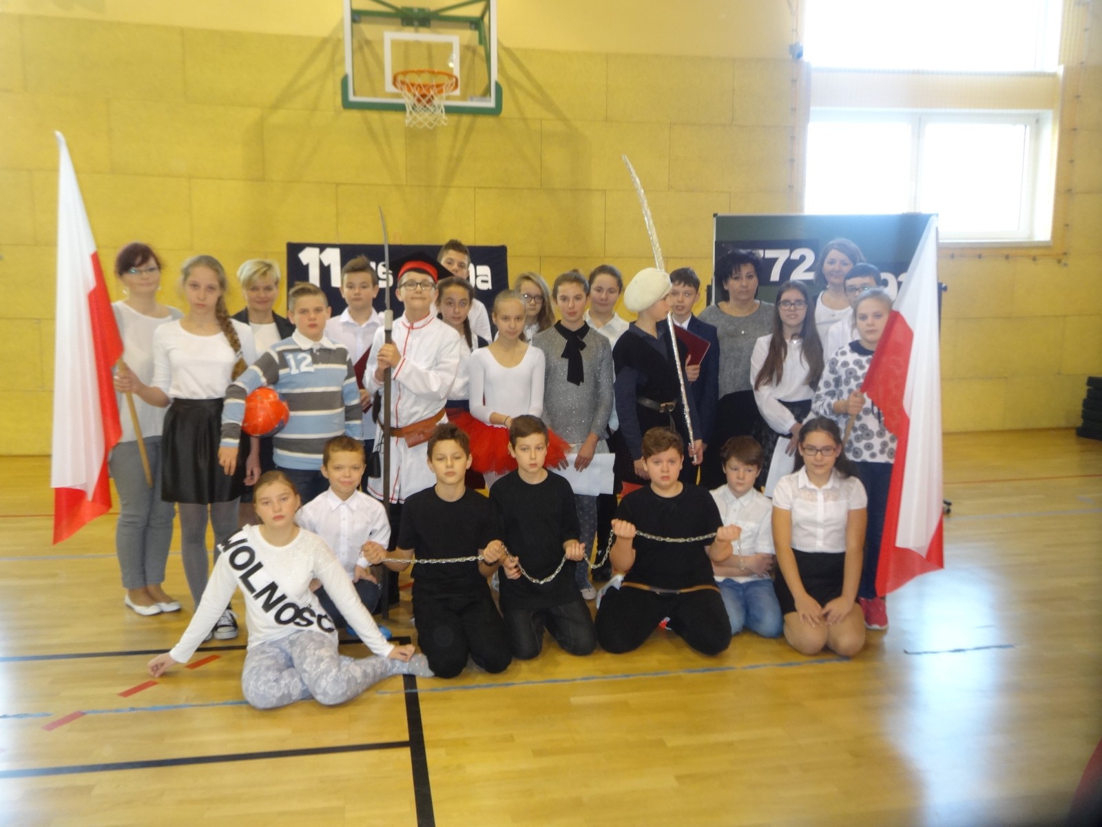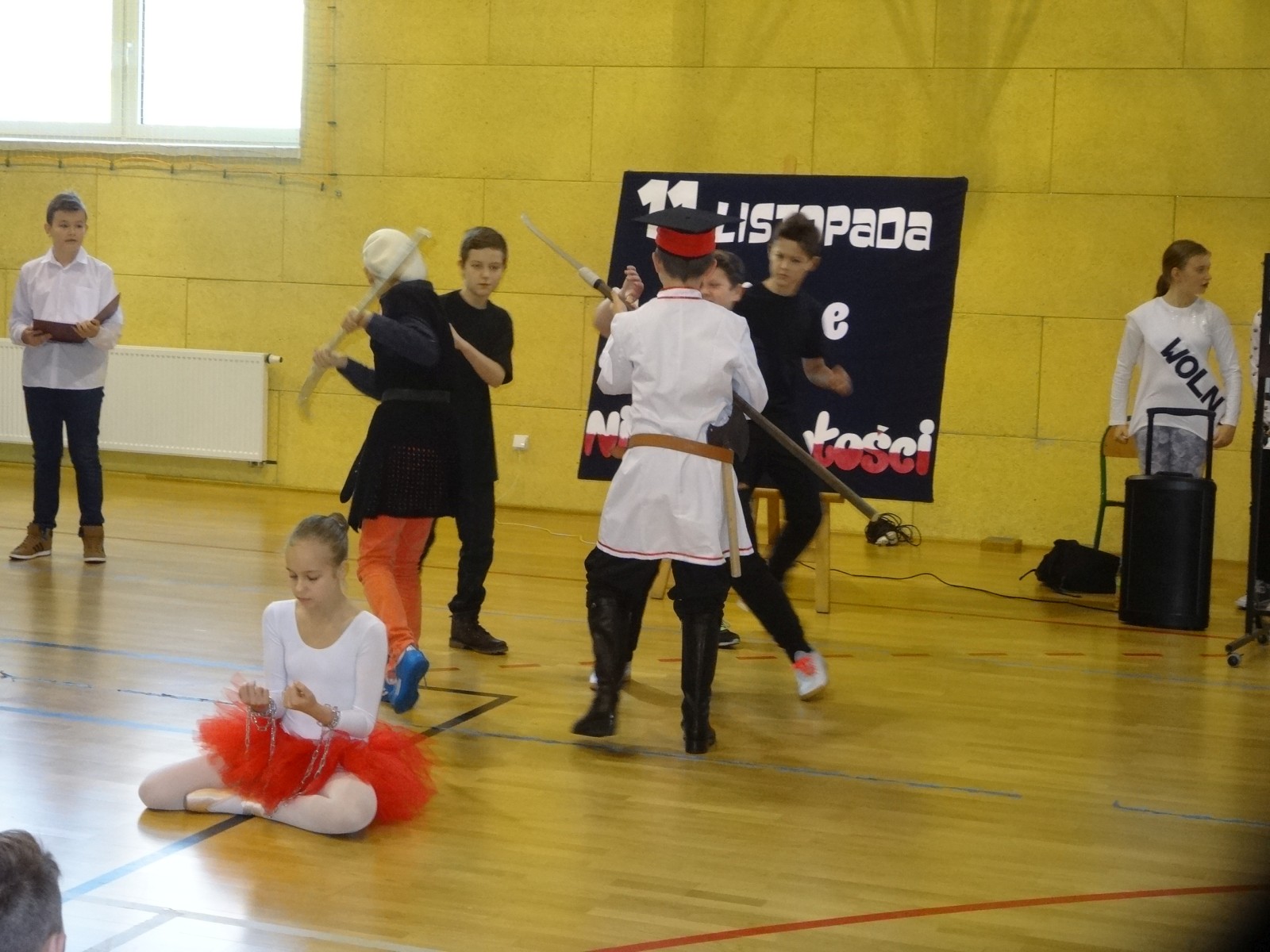 Na scenie można było zobaczyć upersonifikowaną Polskę. W tę rolę wcieliła się jedna z uczennic naszej szkoły Oliwia Bartosik. Głównym punktem przedstawienia był taniec klasyczny(balet) w wykonaniu tej uczennicy. Uczniowie odgrywali także rolę kosynierów i zaborców. W całym przedstawieniu nie zabrakło wierszy i popularnych pieśni patriotycznych.Apel miał uświadomić uczniom, jak ważnym i upragnionym przez naszych przodków wydarzeniem było odzyskanie przez Polskę niepodległości. Dzień 11 listopada stał się dla nas symbolem miłości do ojczyzny, walki o wolność, symbolem wiary i zwycięstwa.Apel przygotowali uczniowie klas VIc i kółka historycznego pod okiem nauczycielek p. Małgorzaty Pakuły i p. Bożeny Mielczarek.