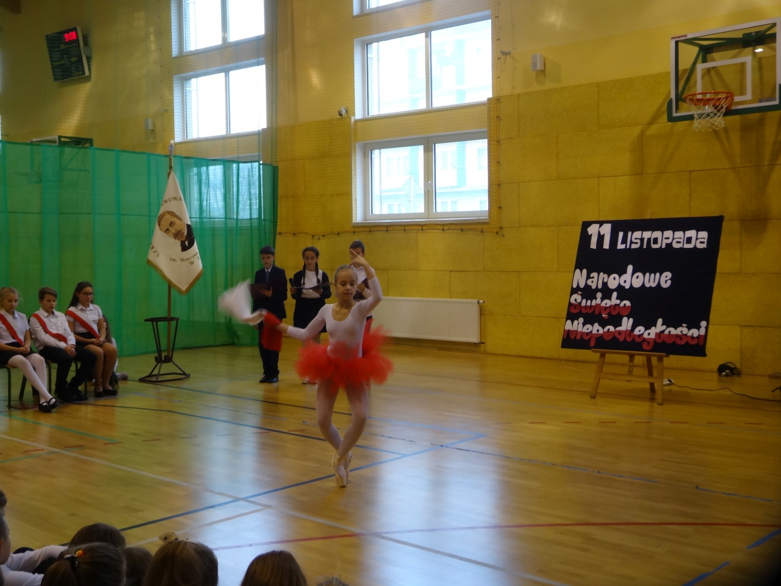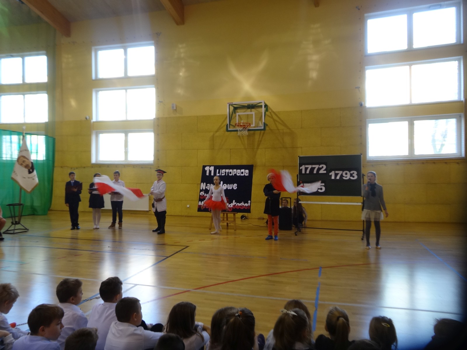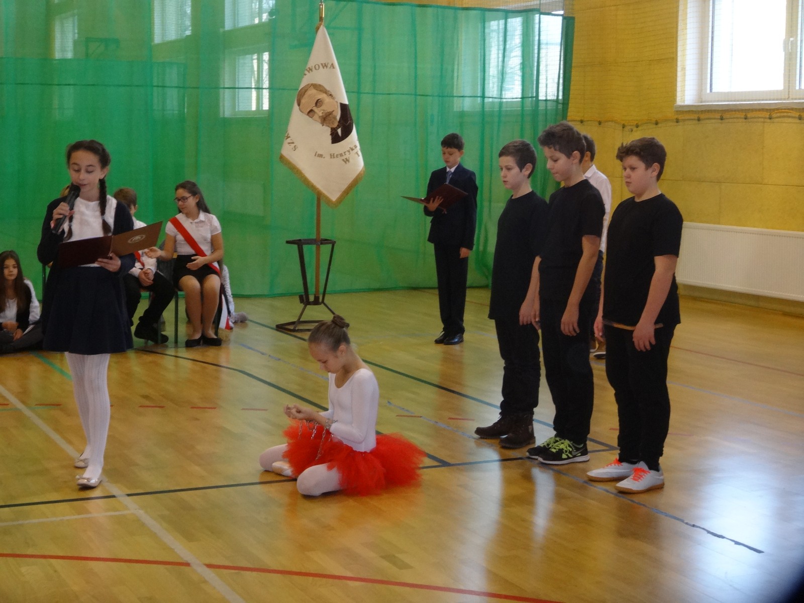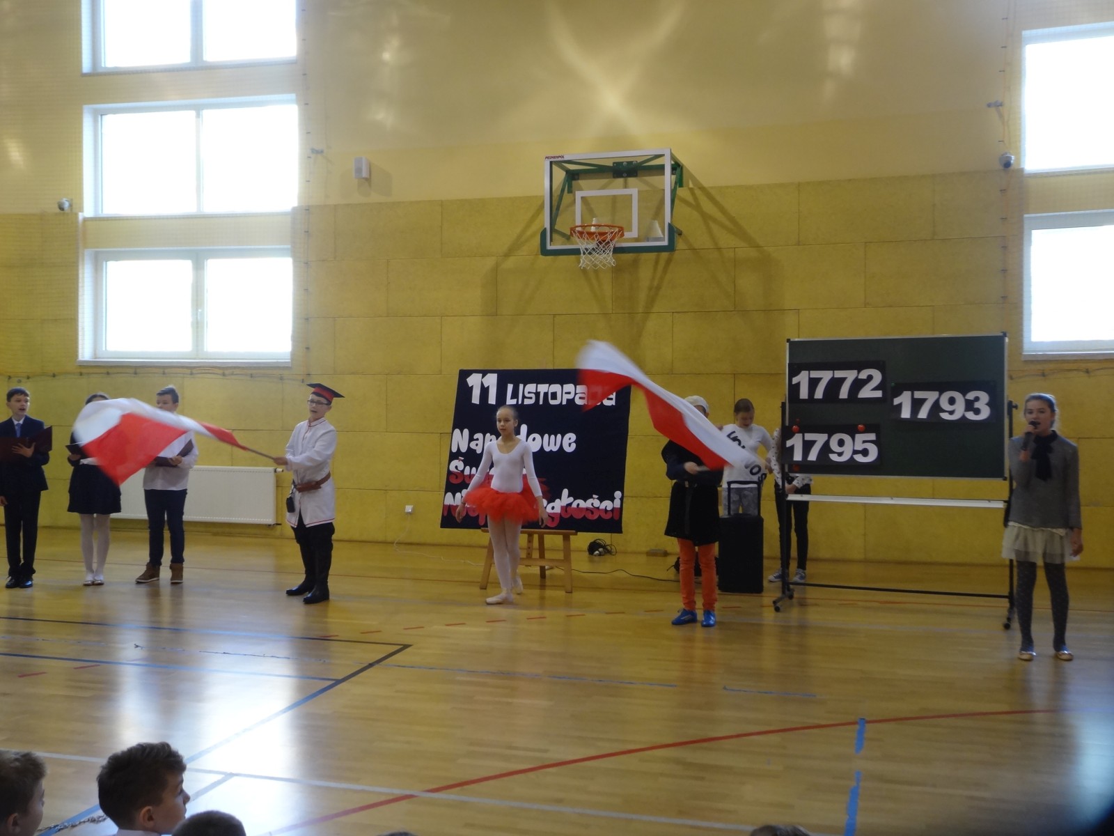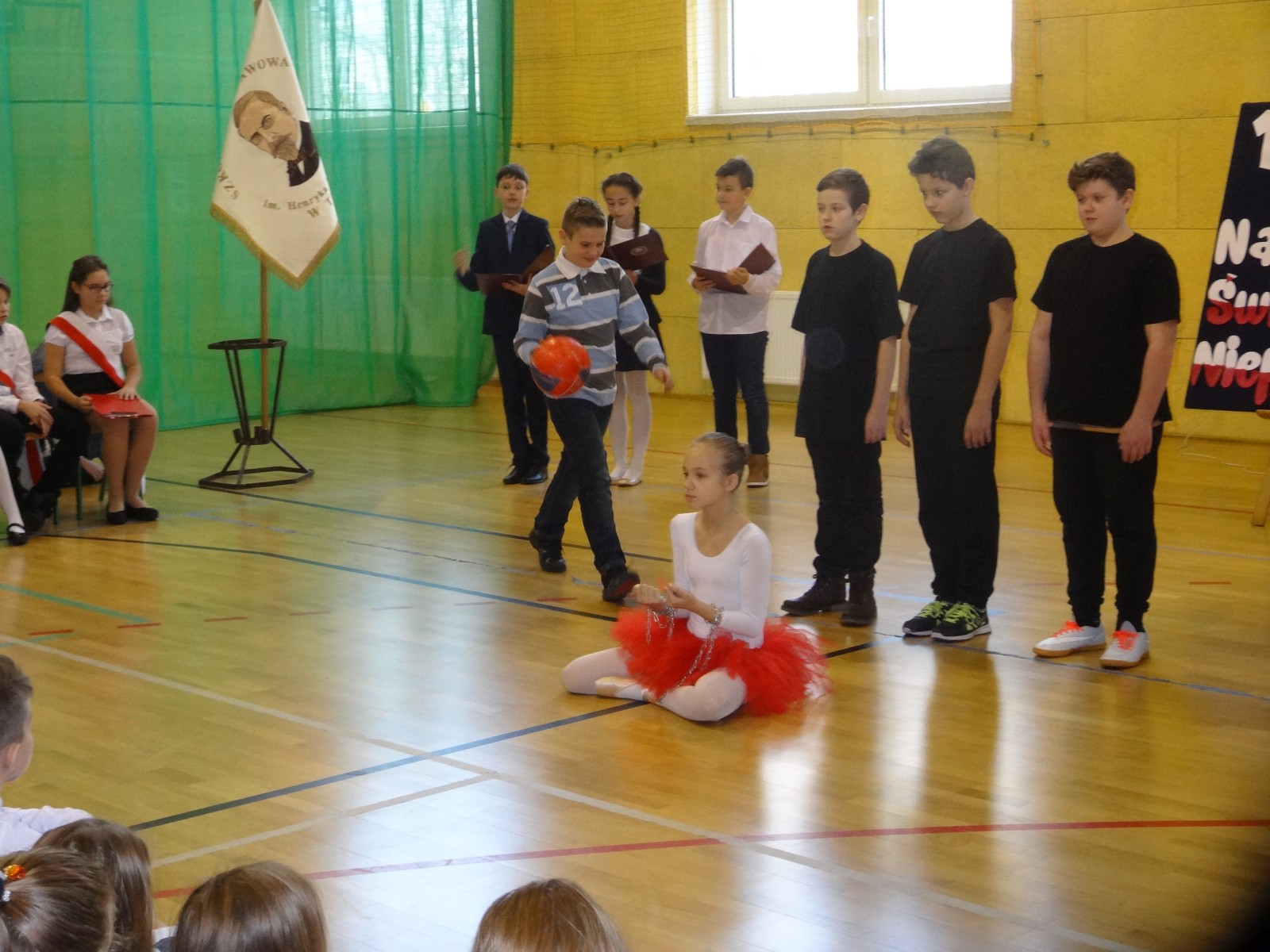 Na scenie można było zobaczyć upersonifikowaną Polskę. W tę rolę wcieliła się jedna z uczennic naszej szkoły Oliwia Bartosik. Głównym punktem przedstawienia był taniec klasyczny(balet) w wykonaniu tej uczennicy. Uczniowie odgrywali także rolę kosynierów i zaborców. W całym przedstawieniu nie zabrakło wierszy i popularnych pieśni patriotycznych.Apel miał uświadomić uczniom, jak ważnym i upragnionym przez naszych przodków wydarzeniem było odzyskanie przez Polskę niepodległości. Dzień 11 listopada stał się dla nas symbolem miłości do ojczyzny, walki o wolność, symbolem wiary i zwycięstwa.Apel przygotowali uczniowie klas VIc i kółka historycznego pod okiem nauczycielek p. Małgorzaty Pakuły i p. Bożeny Mielczarek.
