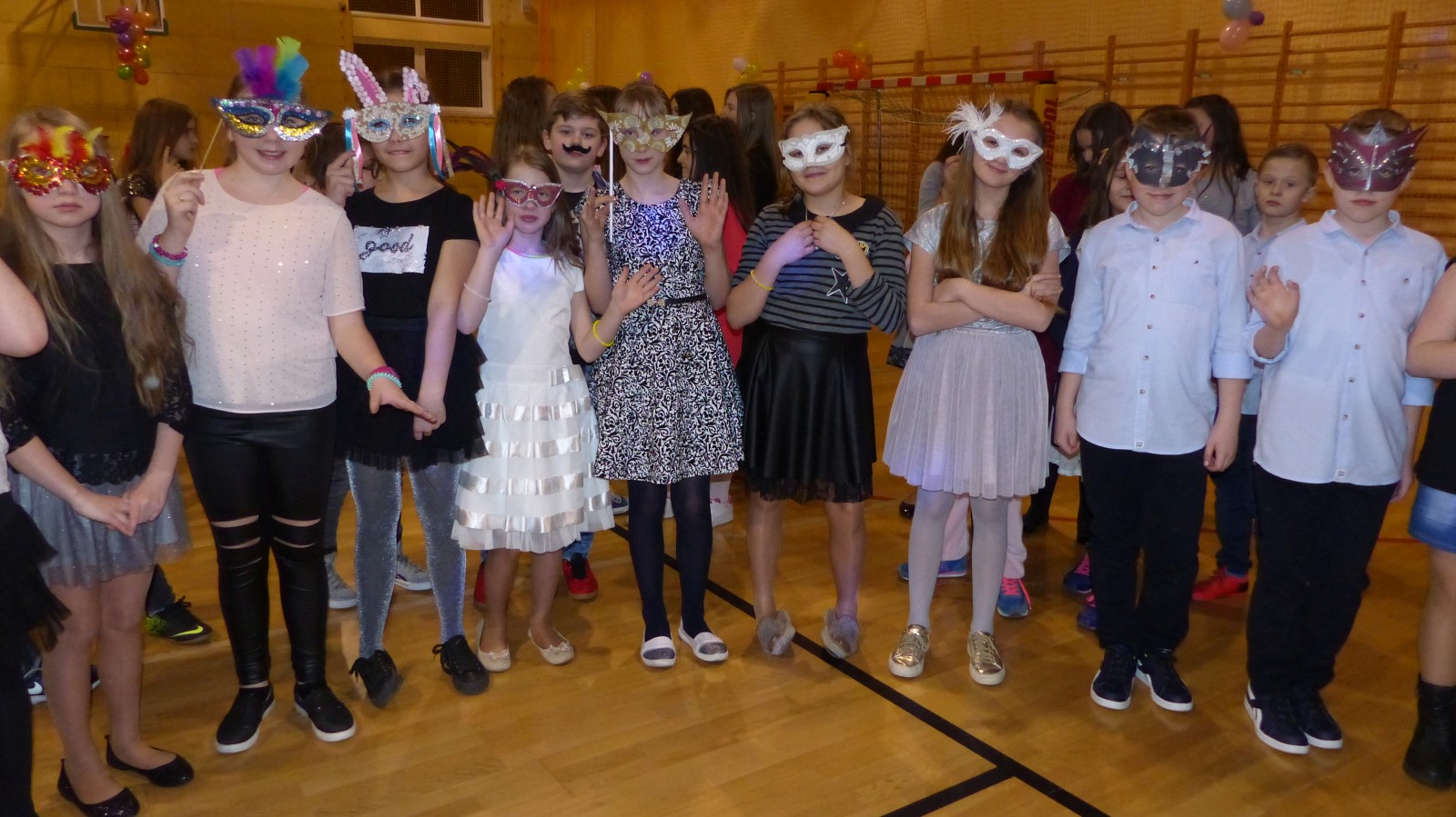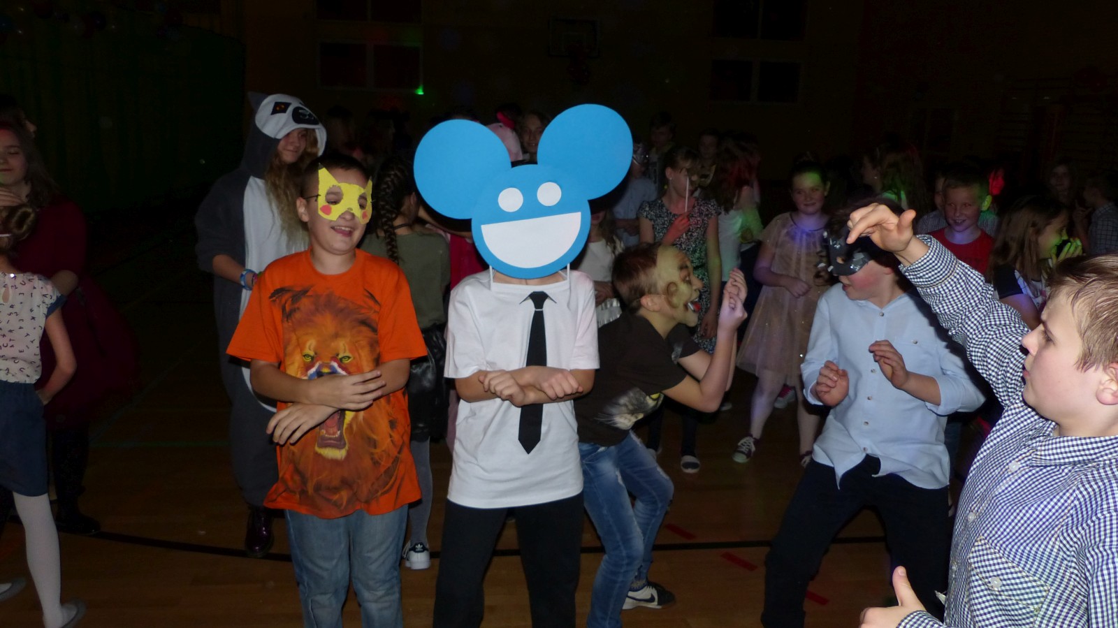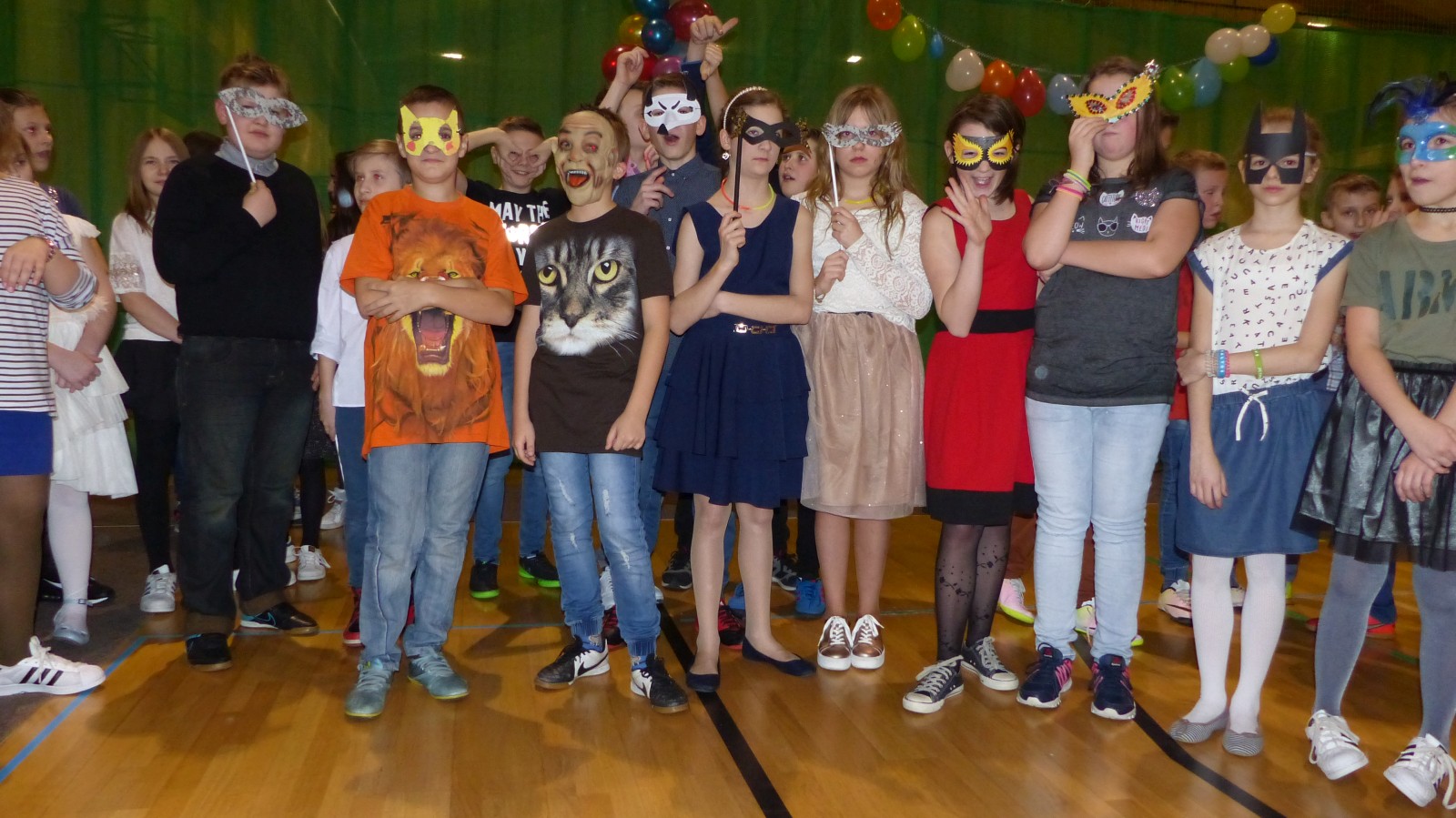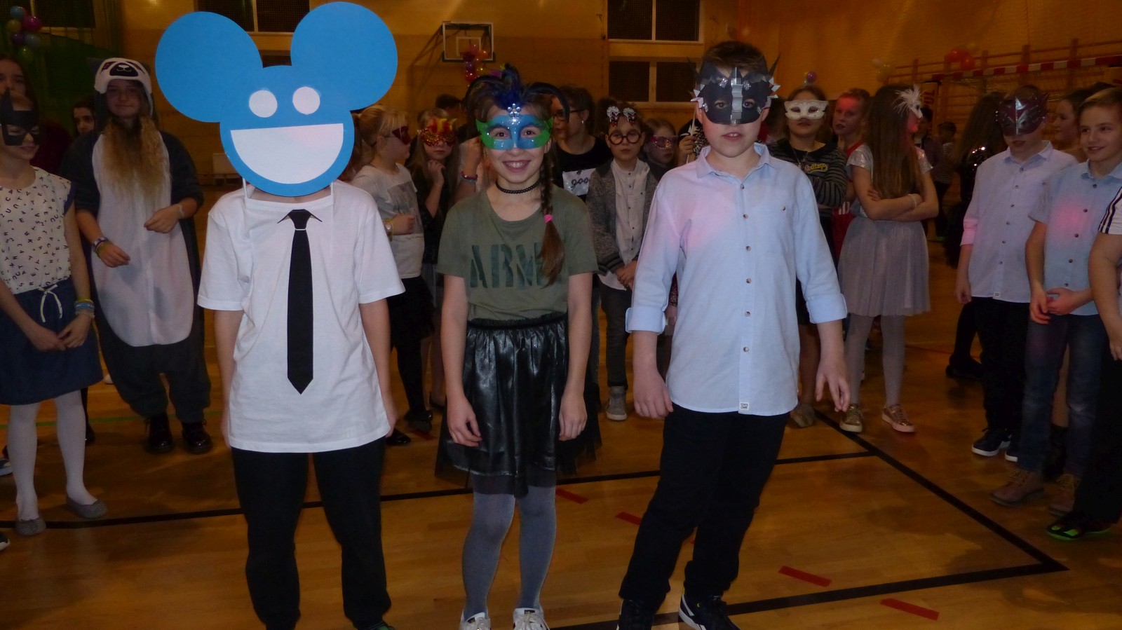 Chętni przystapili do konkursu na najciekawszą maskę. Komisja konkursowa, w skład której wchodzili uczniowie, rodzice i nauczyciele mieli trudny orzech do zgryzienia, ponieważ maski były kolorowe, tajemnicze, naprawdę wspaniałe. Ostatecznie wybrano 3 maski, a ich właściciele otrzymali słodkie upominki. Maski są po to, aby się za nimi ukryć, więc nie znamy nazwisk tajemniczych osób. Komisja zgodnie orzekła, że wyróżniała się myszka Miki, fantastyczna postać z kosmosu oraz dama prosto z Wenecji. Po konkursie DJ Adrian ponownie porwał nas do zabawy przy najnowszych i lubianych hitach muzycznych. Każda klasa o umówionej godzinie znikała z sali na choinkowy poczęstunek. Dominowała pizza, ale nie brakowało innych zdrowych przekąsek. Starań w przygotowaniu choinki dołożyli rodzice naszych uczniów, którym dziękujemy za opiekę, aktywny udział i przygotowanie choikowych paczek, które zawsze miło otrzymać. W naszej szkole bardzo lubimy takie wspólne imprezy. W tym roku bal maskowy był super! Szkoda, że wielu uczniów było nieobecnych ze względu na sezonowe zachorowania. Do zobaczenia za rok!