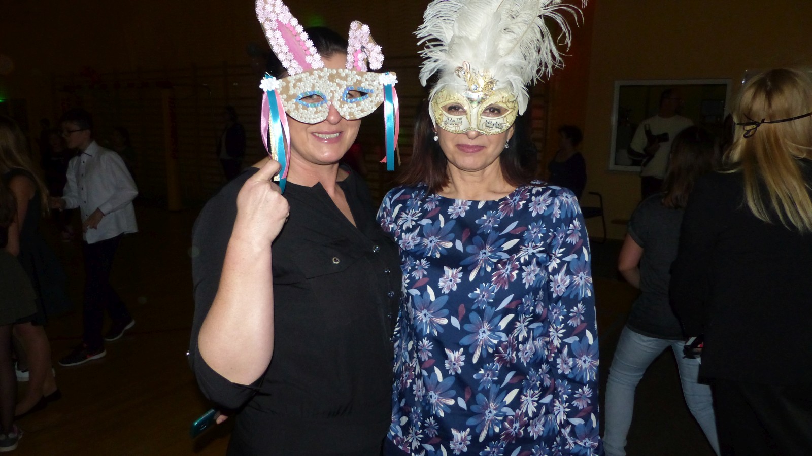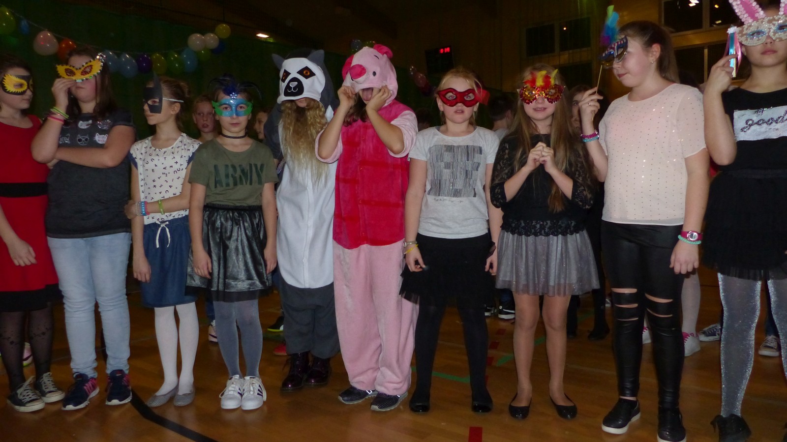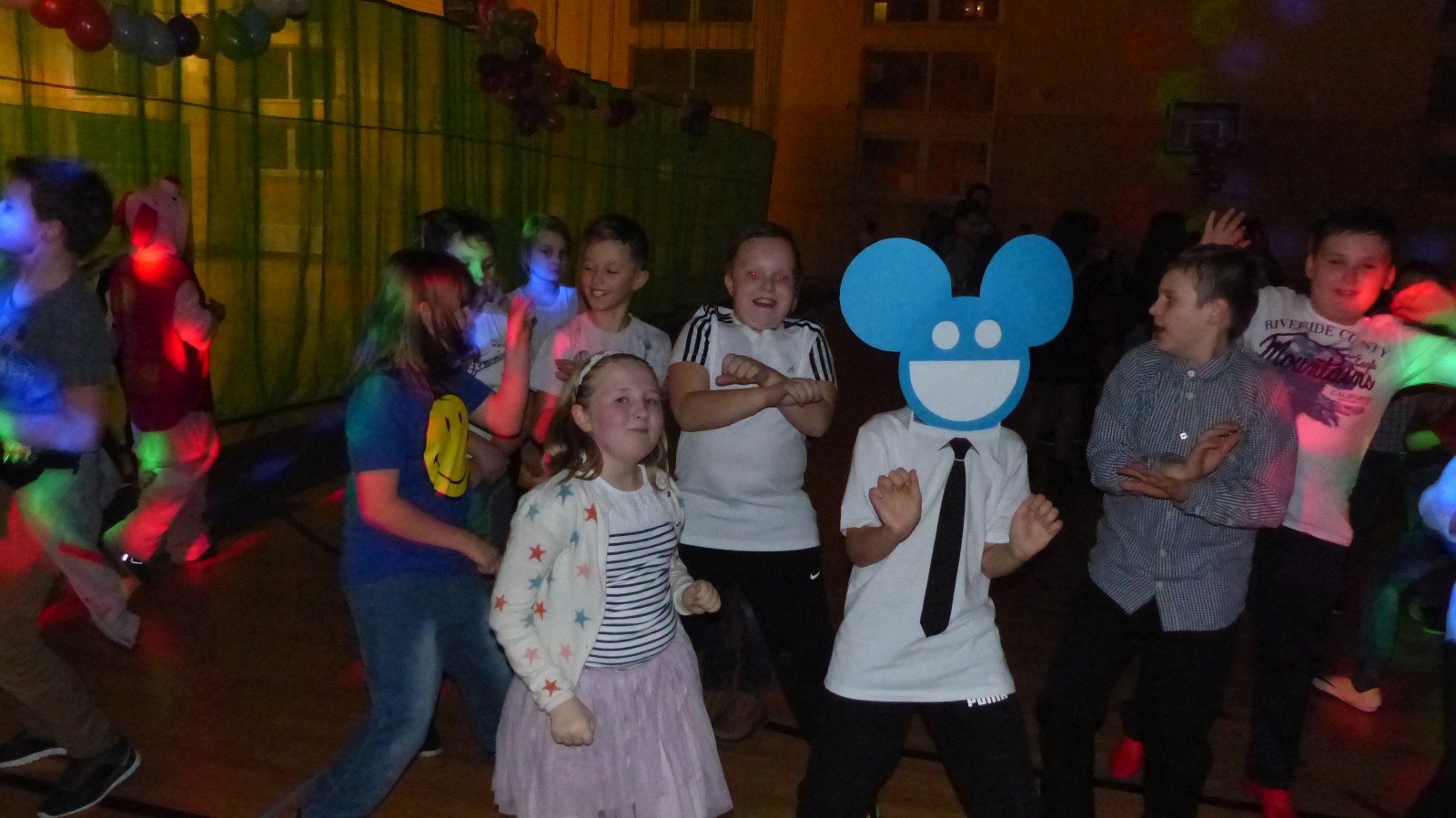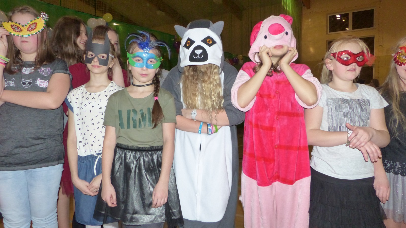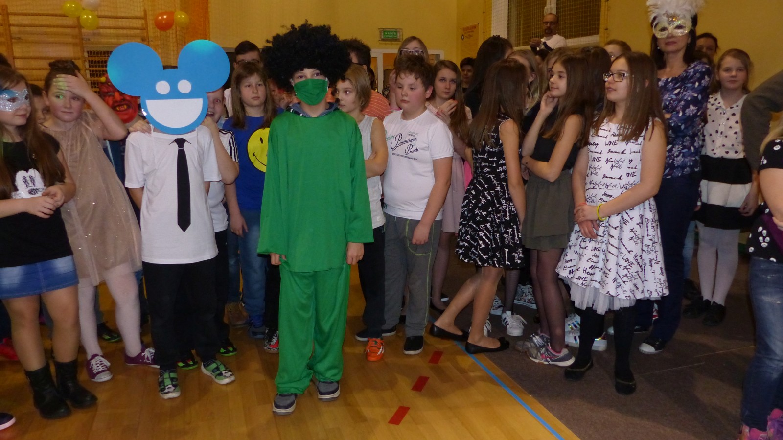 Chętni przystapili do konkursu na najciekawszą maskę. Komisja konkursowa, w skład której wchodzili uczniowie, rodzice i nauczyciele mieli trudny orzech do zgryzienia, ponieważ maski były kolorowe, tajemnicze, naprawdę wspaniałe. Ostatecznie wybrano 3 maski, a ich właściciele otrzymali słodkie upominki. Maski są po to, aby się za nimi ukryć, więc nie znamy nazwisk tajemniczych osób. Komisja zgodnie orzekła, że wyróżniała się myszka Miki, fantastyczna postać z kosmosu oraz dama prosto z Wenecji. Po konkursie DJ Adrian ponownie porwał nas do zabawy przy najnowszych i lubianych hitach muzycznych. Każda klasa o umówionej godzinie znikała z sali na choinkowy poczęstunek. Dominowała pizza, ale nie brakowało innych zdrowych przekąsek. Starań w przygotowaniu choinki dołożyli rodzice naszych uczniów, którym dziękujemy za opiekę, aktywny udział i przygotowanie choikowych paczek, które zawsze miło otrzymać. W naszej szkole bardzo lubimy takie wspólne imprezy. W tym roku bal maskowy był super! Szkoda, że wielu uczniów było nieobecnych ze względu na sezonowe zachorowania. Do zobaczenia za rok!