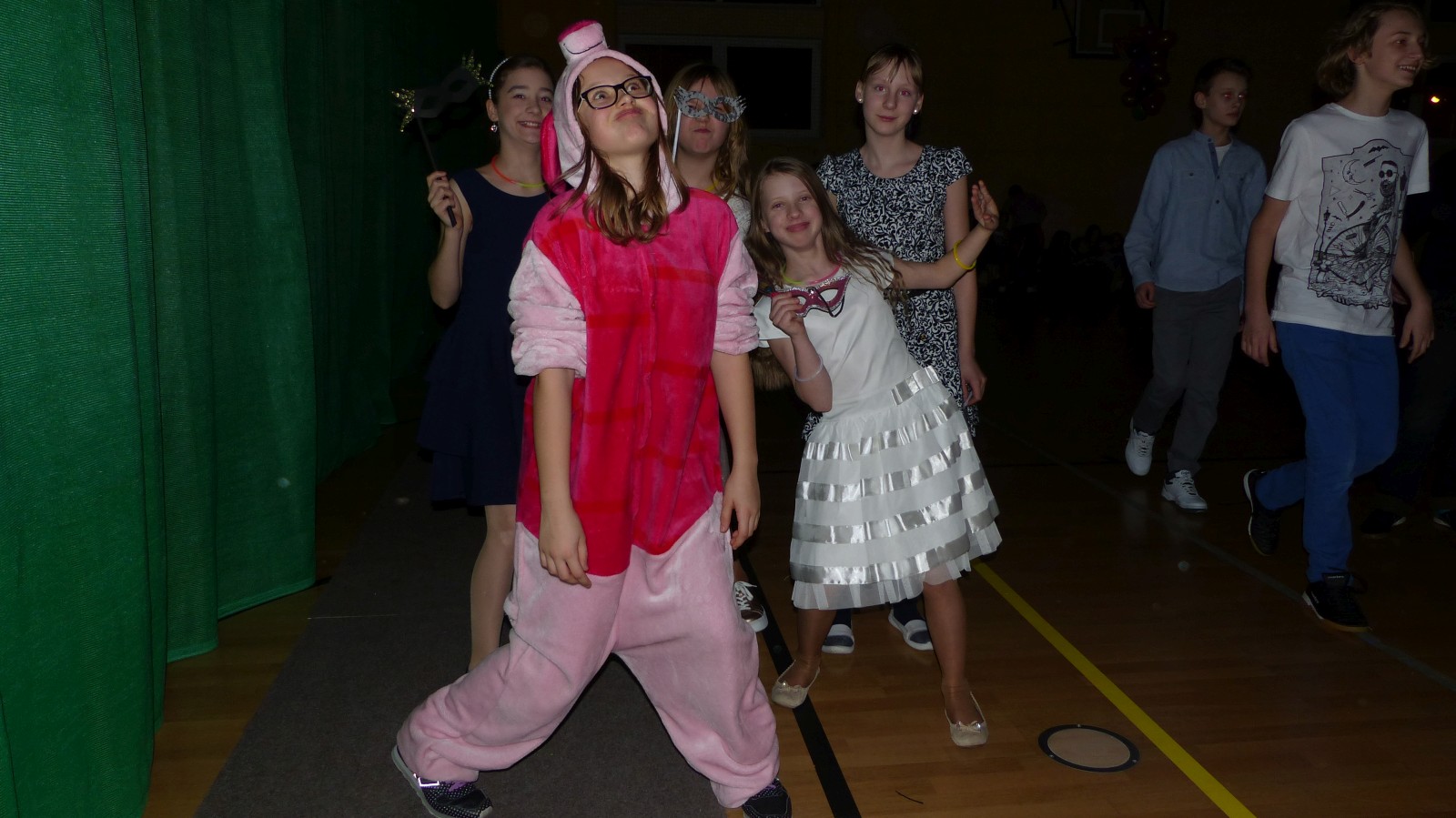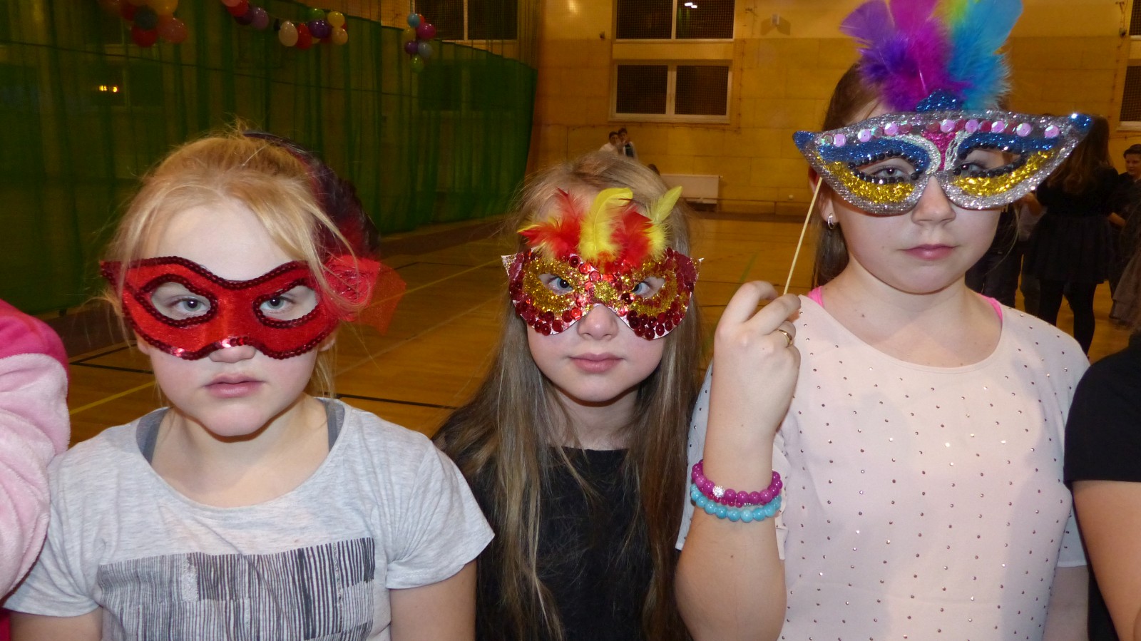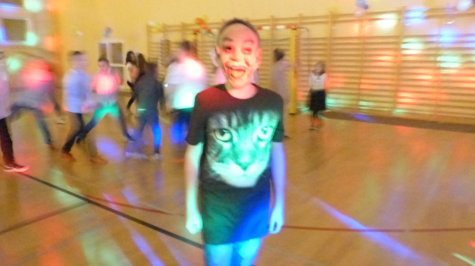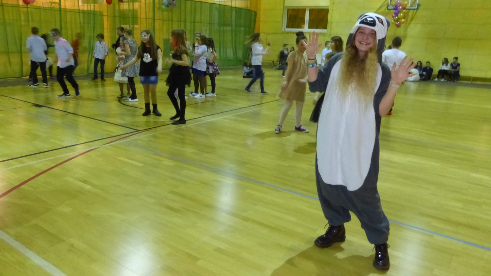 Chętni przystapili do konkursu na najciekawszą maskę. Komisja konkursowa, w skład której wchodzili uczniowie, rodzice i nauczyciele mieli trudny orzech do zgryzienia, ponieważ maski były kolorowe, tajemnicze, naprawdę wspaniałe. Ostatecznie wybrano 3 maski, a ich właściciele otrzymali słodkie upominki. Maski są po to, aby się za nimi ukryć, więc nie znamy nazwisk tajemniczych osób. Komisja zgodnie orzekła, że wyróżniała się myszka Miki, fantastyczna postać z kosmosu oraz dama prosto z Wenecji. Po konkursie DJ Adrian ponownie porwał nas do zabawy przy najnowszych i lubianych hitach muzycznych. Każda klasa o umówionej godzinie znikała z sali na choinkowy poczęstunek. Dominowała pizza, ale nie brakowało innych zdrowych przekąsek. Starań w przygotowaniu choinki dołożyli rodzice naszych uczniów, którym dziękujemy za opiekę, aktywny udział i przygotowanie choikowych paczek, które zawsze miło otrzymać. W naszej szkole bardzo lubimy takie wspólne imprezy. W tym roku bal maskowy był super! Szkoda, że wielu uczniów było nieobecnych ze względu na sezonowe zachorowania. Do zobaczenia za rok!