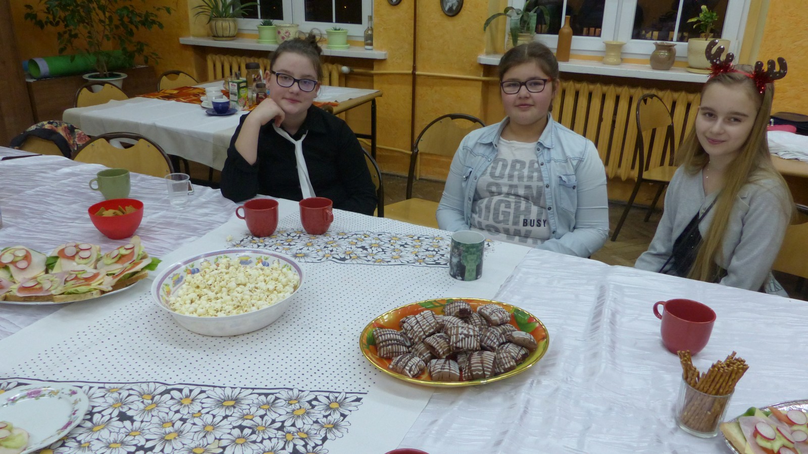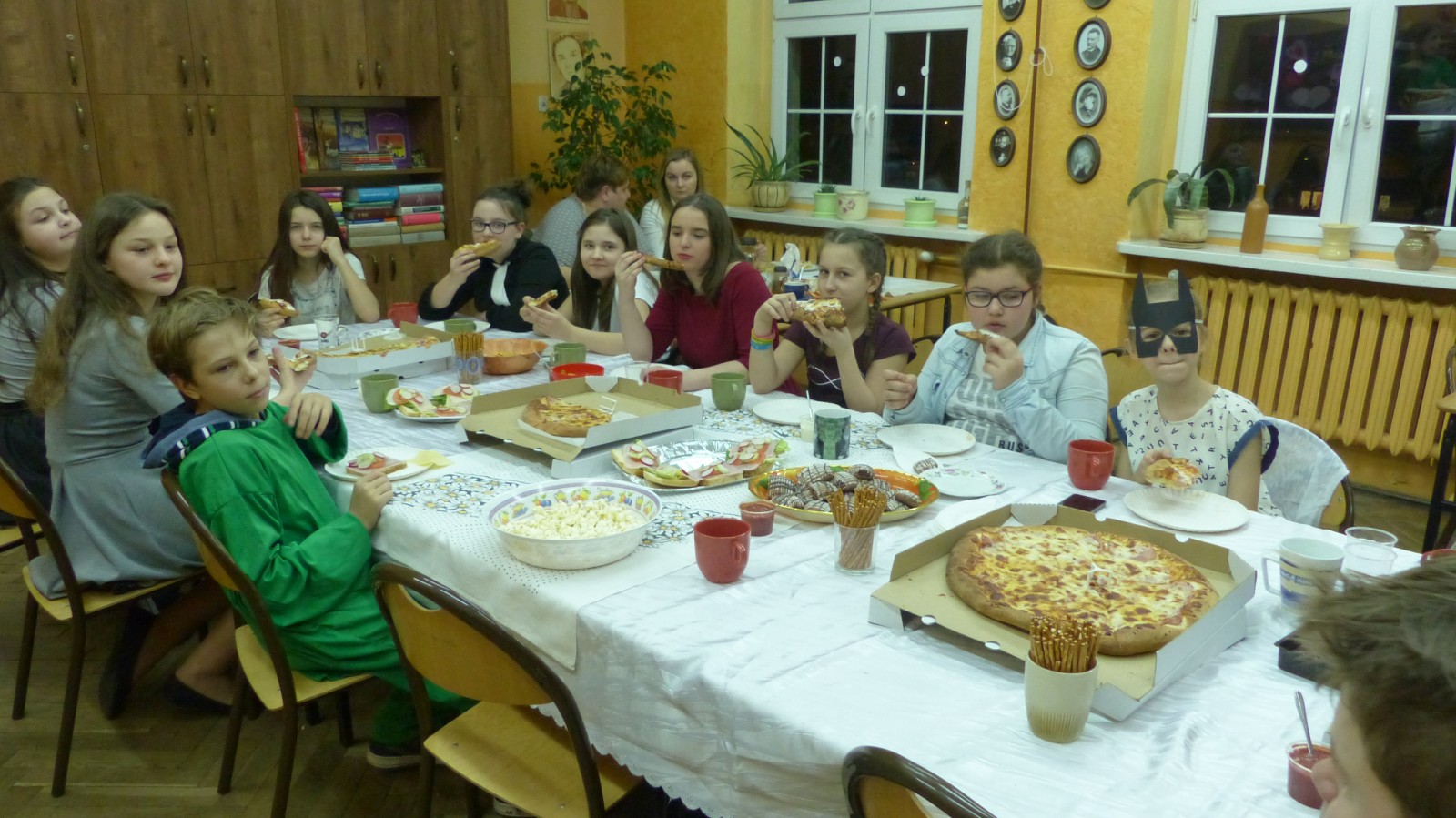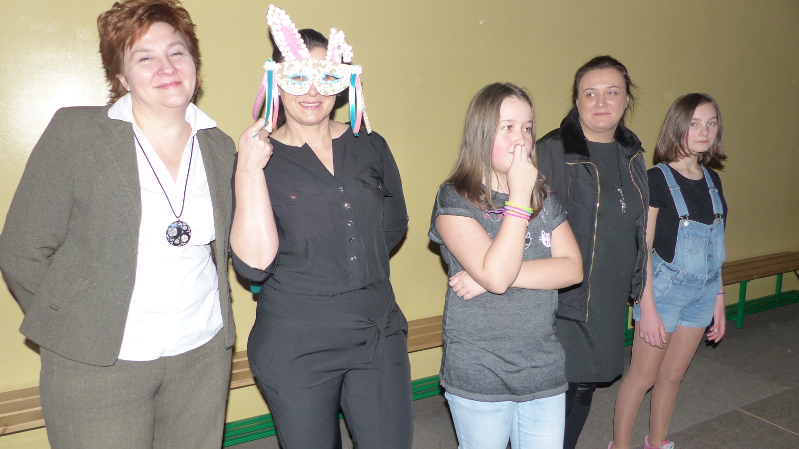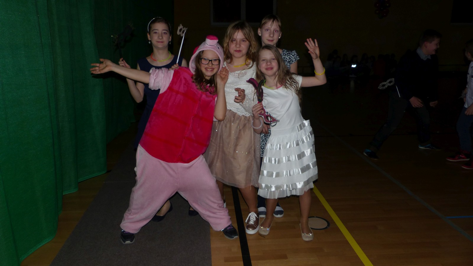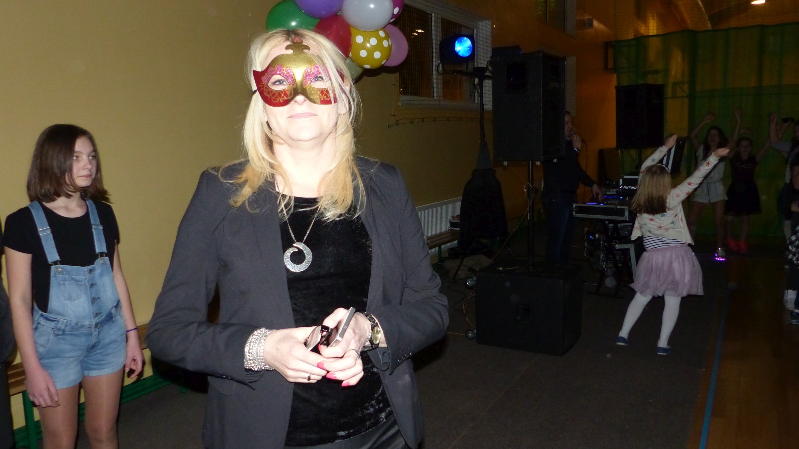 Chętni przystapili do konkursu na najciekawszą maskę. Komisja konkursowa, w skład której wchodzili uczniowie, rodzice i nauczyciele mieli trudny orzech do zgryzienia, ponieważ maski były kolorowe, tajemnicze, naprawdę wspaniałe. Ostatecznie wybrano 3 maski, a ich właściciele otrzymali słodkie upominki. Maski są po to, aby się za nimi ukryć, więc nie znamy nazwisk tajemniczych osób. Komisja zgodnie orzekła, że wyróżniała się myszka Miki, fantastyczna postać z kosmosu oraz dama prosto z Wenecji. Po konkursie DJ Adrian ponownie porwał nas do zabawy przy najnowszych i lubianych hitach muzycznych. Każda klasa o umówionej godzinie znikała z sali na choinkowy poczęstunek. Dominowała pizza, ale nie brakowało innych zdrowych przekąsek. Starań w przygotowaniu choinki dołożyli rodzice naszych uczniów, którym dziękujemy za opiekę, aktywny udział i przygotowanie choikowych paczek, które zawsze miło otrzymać. W naszej szkole bardzo lubimy takie wspólne imprezy. W tym roku bal maskowy był super! Szkoda, że wielu uczniów było nieobecnych ze względu na sezonowe zachorowania. Do zobaczenia za rok!