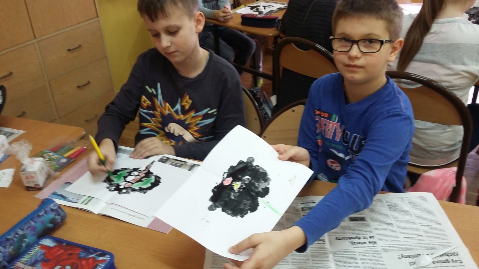 obejrzeli fragment filmu pt. „Akademia pana Kleksa” dotyczący lekcji kleksografii. Następnie opracowano instrukcję, według której pracowano na lekcji. Kiedy malowidła były gotowe, każdy uczeń ułożył rymowankę lub opisał swoje dzieło. Na koniec, w nagrodę za sumienną pracę obdarowano wszystkich kolorowymi piegami. Powstałe z kleksów prace okazały się bardzo ciekawe i zabawne.