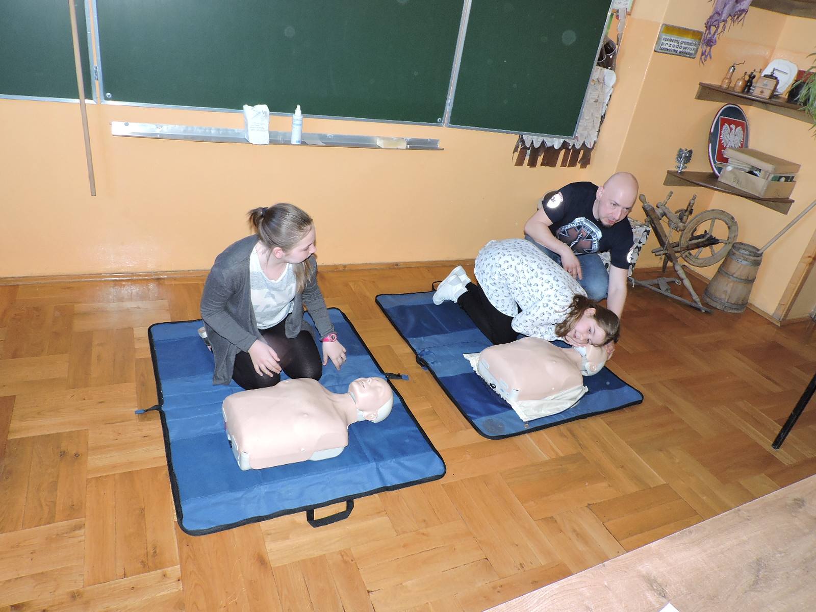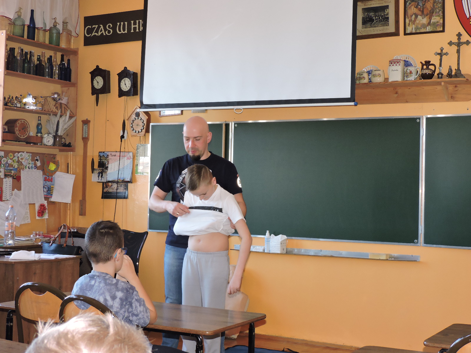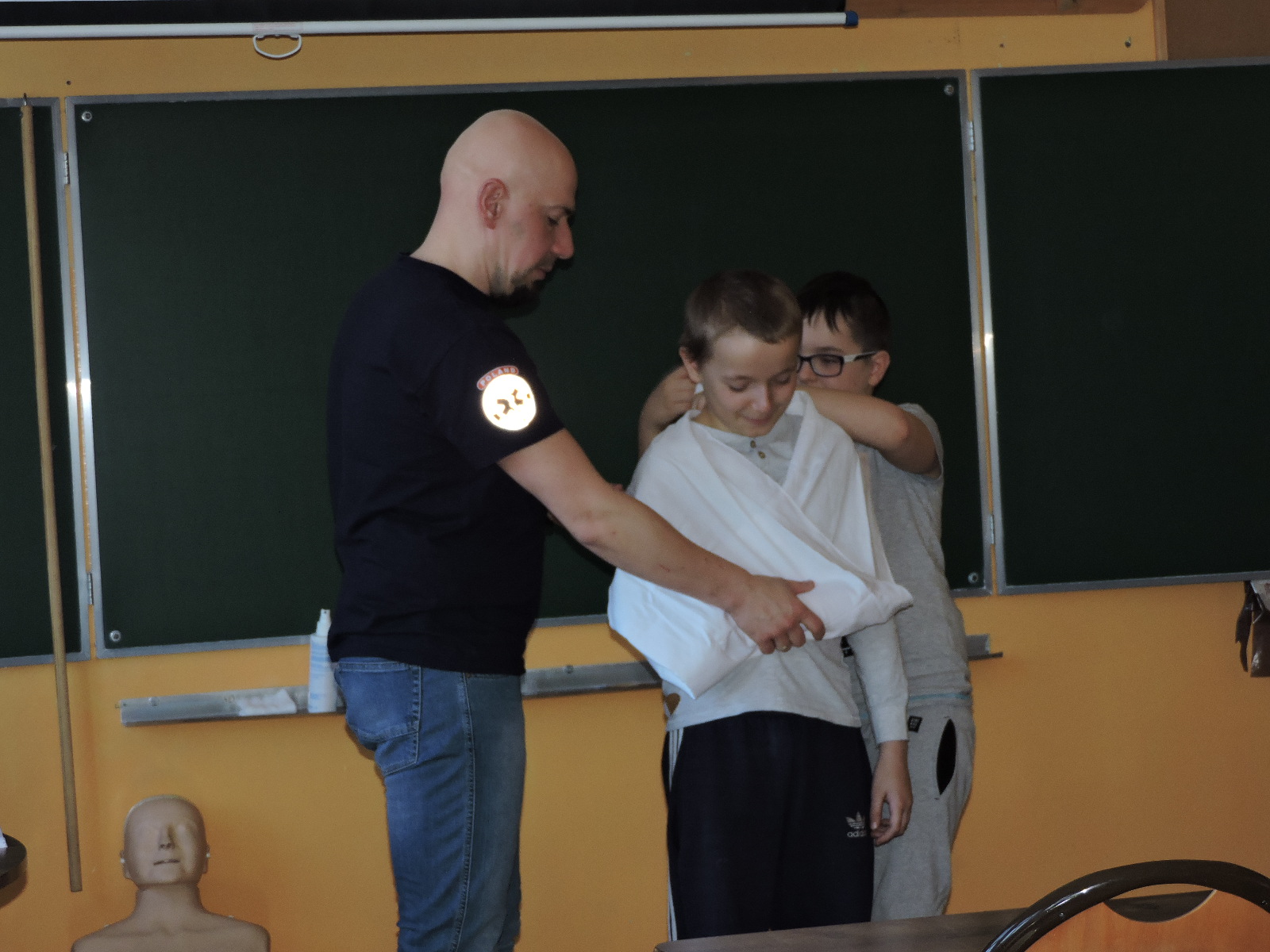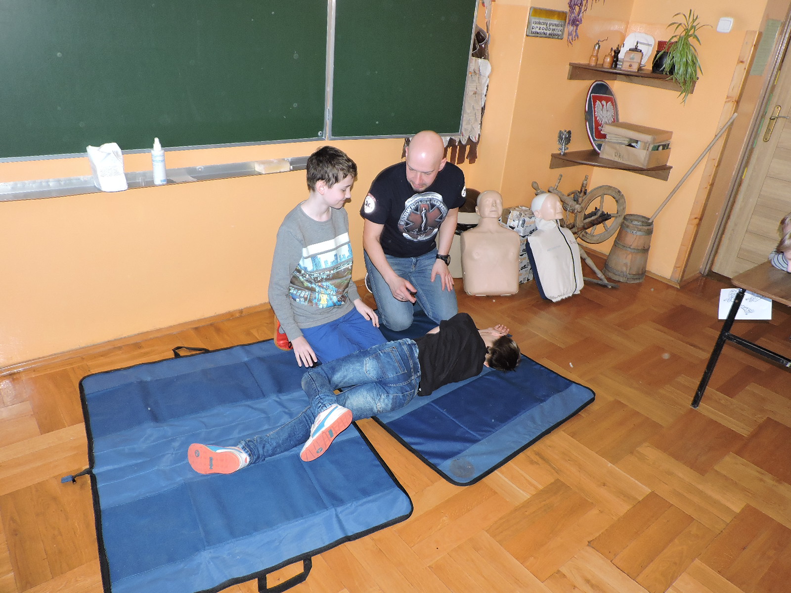 Dowiedzieliśmy się: jak postępować w sytuacji oparzenia, omdlenia, złamania czy zwichnięcia?, jak wygląda pozycja bezpieczna?, jak reanimować osobę nieprzytomną z brakiem oddechu?. Była to lekcja nie tylko teoretyczna, choć mieliśmy wiele pytań, ale również praktyczna. Wiemy już jak zachować się podczas wypadku oraz jak udzielić pierwszej pomocy osobie poszkodowanej.