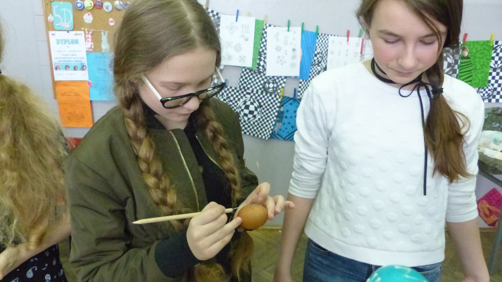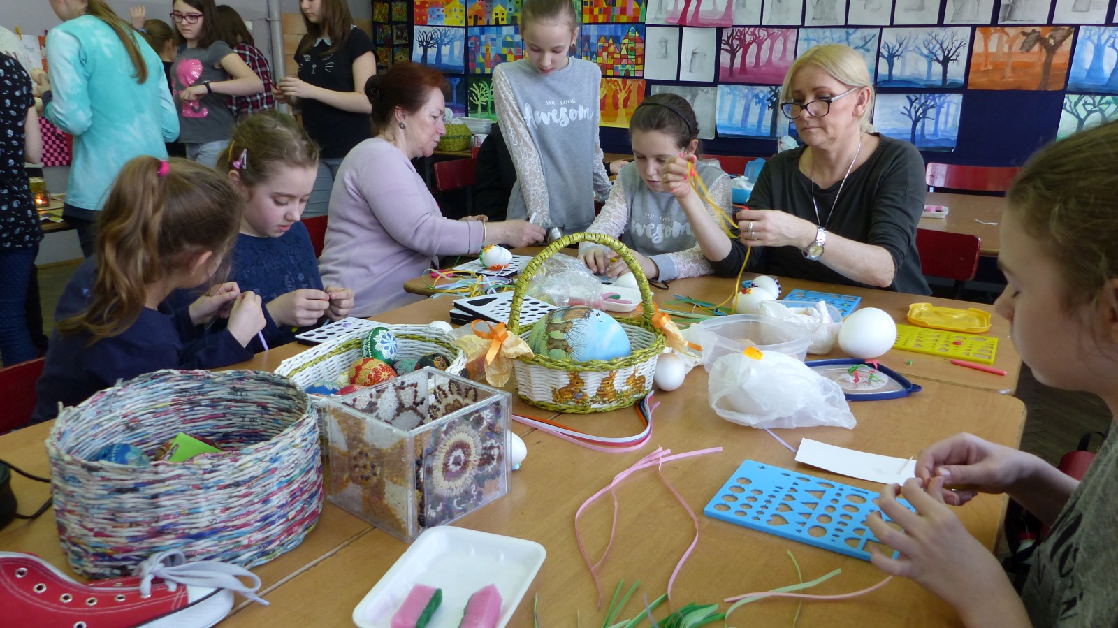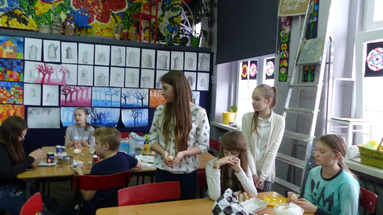 Dzieci poznały tradycje zdobienia pisanek na naszym terenie. Jedną z tradycyjnych technik było pisanie woskiem pszczelim, stąd sama nazwa pisanki. Dziś istnieje wiele technik plastycznych , które można wykorzystać do ozdobienia jajka. Na warsztatach dzieci mogły zapoznać się z techniką qulingu oraz malowania kolorowymi woskami, bardziej współczesną odmianą malowania jajek woskiem pszczelim.