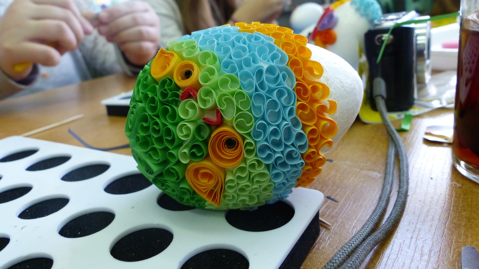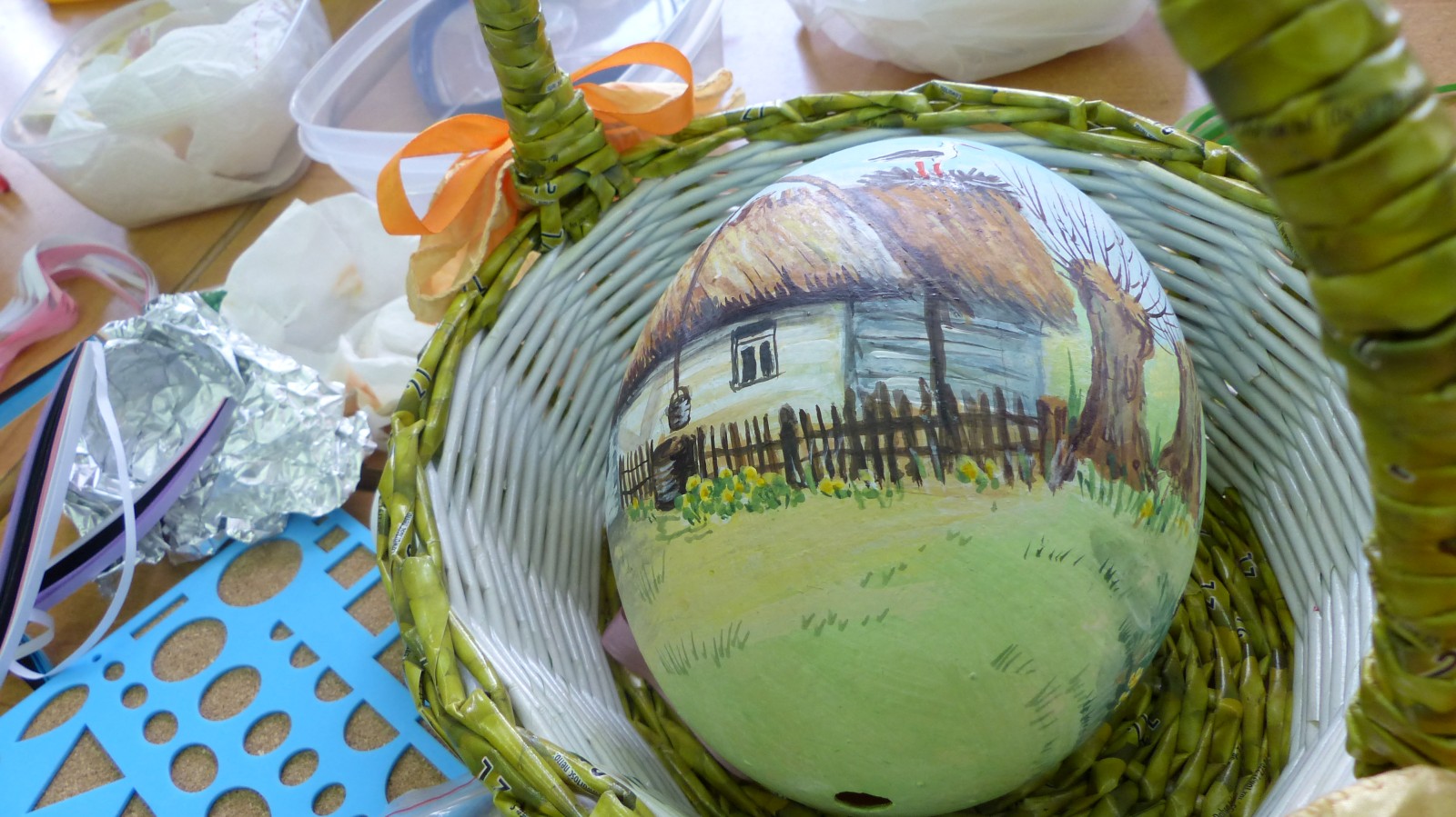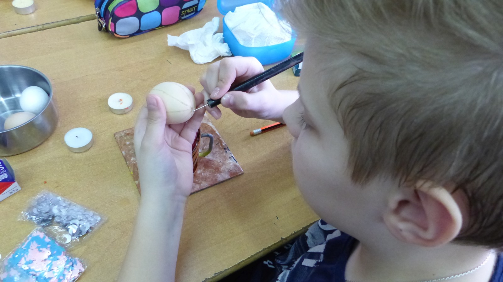 Dzieci poznały tradycje zdobienia pisanek na naszym terenie. Jedną z tradycyjnych technik było pisanie woskiem pszczelim, stąd sama nazwa pisanki. Dziś istnieje wiele technik plastycznych , które można wykorzystać do ozdobienia jajka. Na warsztatach dzieci mogły zapoznać się z techniką qulingu oraz malowania kolorowymi woskami, bardziej współczesną odmianą malowania jajek woskiem pszczelim.