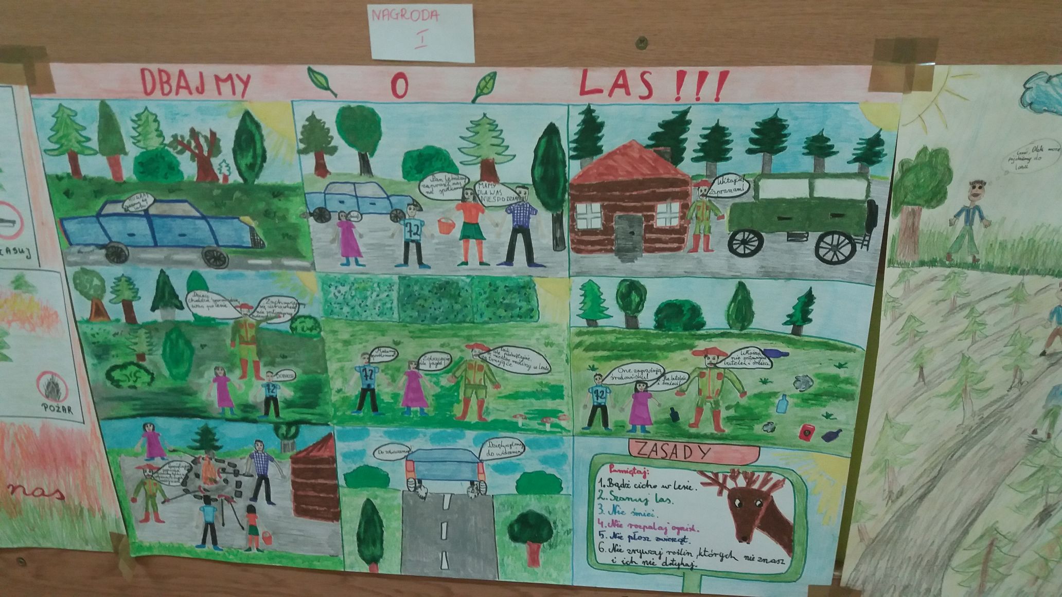 22 kwietnia co roku obchodzimy Międzynarodowy Dzień Ziemi z tej okazji klasy 4-6 wzięły udział w szkolnym konkursie „Las całkiem blisko nas”. Celem konkursu było promowanie postaw ekologicznych wśród uczniów i rodziców oraz zachęcenie do spędzania wolnego czasu w gronie rodziny na świeżym powietrzu i w lesie. Każdy uczestnik konkursu miał do wykonania komiks. Prace były bardzo piękne, wymagające dużego nakładu czasu i poświęcenia. W konkursie wygrali: I miejsce Mateusz Szczesiak z kl. 4a, II miejsce Aleksandra Smolińska z kl.4 a, III miejsce ex aequo zajęli Radosław Kałużny z kl. 6b i Mateusz Bergandy z kl.4a . Wszystkim uczniom serdecznie gratulujemy.