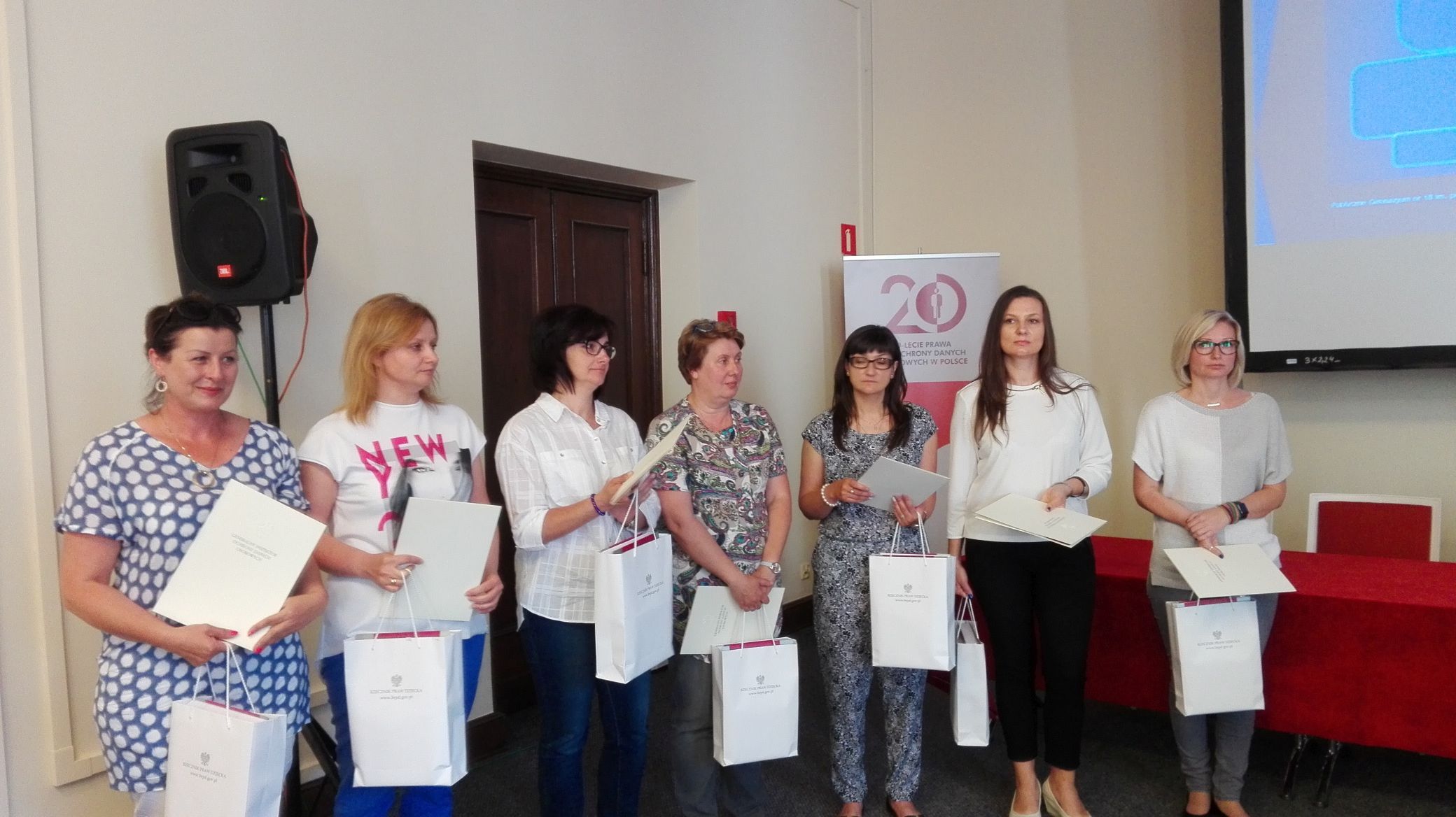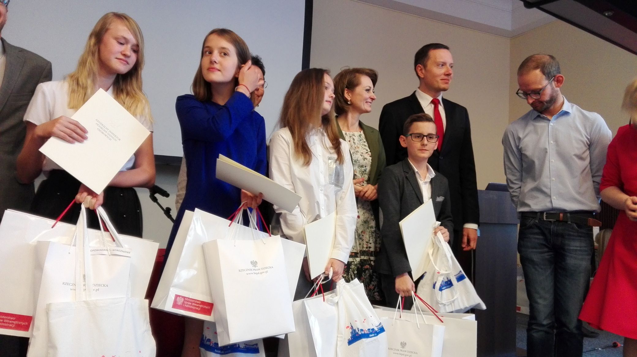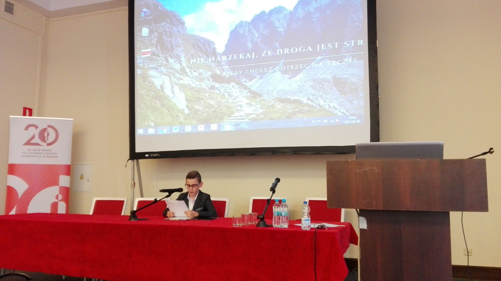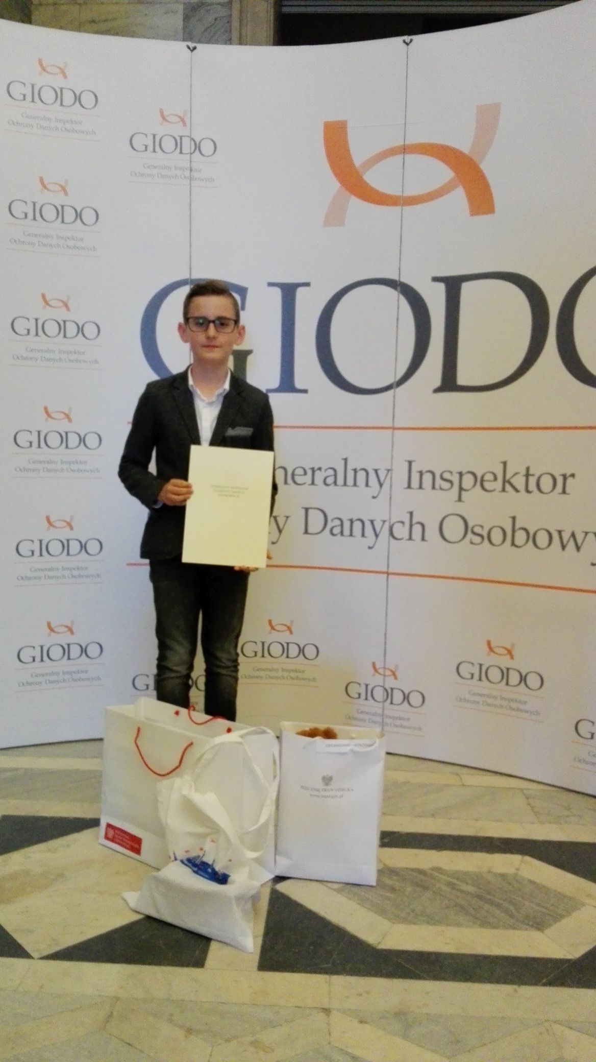 Na podstawie realizowanych w szkole przedsięwzięć, uwrażliwieniu się na temat ochrony danych osobowych, wielu uczniów przystąpiło do konkursu na opowiadanie. Praca Igora Jasnowskiego z klasy 5b okazała się doskonała pod względem literackim. Wyobraźnia i pomysł ukazania tematu sprawił, że Igor zdobył wyróżnienie i był jednym spośród 7 osób wyróżnionych na tle całej Polski na 135 prac, które zostały zakwalifikowane do ostatniego etapu konkursu GIODO. Uroczyste podsumowanie Programu wraz z wręczeniem nagród odbyło się 6 czerwca w Warszawie w Pałacu Kultury i Nauki. Nagrody wręczali: Minister Cyfryzacji GIODO dr Edyta Bielak-Jomaa, Rzecznik Praw Dziecka Marek Michalak oraz Lew Starowicz w imieniu Minister Edukacji Narodowej. Zdobyte wyróżnienie, udział w podsumowaniu całej kampanii, obecność znamienitych osób to dla Igora niezapomniane chwile, tym bardziej że uczniowie nagrodzeni i wyróżnieni czytali swoje prace na głos przed całym audytorium. Praca Igora napisana w sposób bardzo swobodny, ukazująca zwykłe rodzinne zamieszanie, podczas którego okazało się jak ważna jest ochrona danych osobowych, jest dowodem na to, że ochrona danych i wiedza na ten temat ma szanse stać się od najmłodszych lat nawykiem podobnie jak odrabianie lekcji. Igor na wręczenie nagród do Warszawy pojechał pod opieką swojego taty Marcina Jasnowskiego, którym towarzyszyła koordynator kampanii GIODO w SP1 pani Ewa Kulesza. Jeszcze raz gratulujemy Igorowi sukcesu, życzymy dalszych twórczych działań.