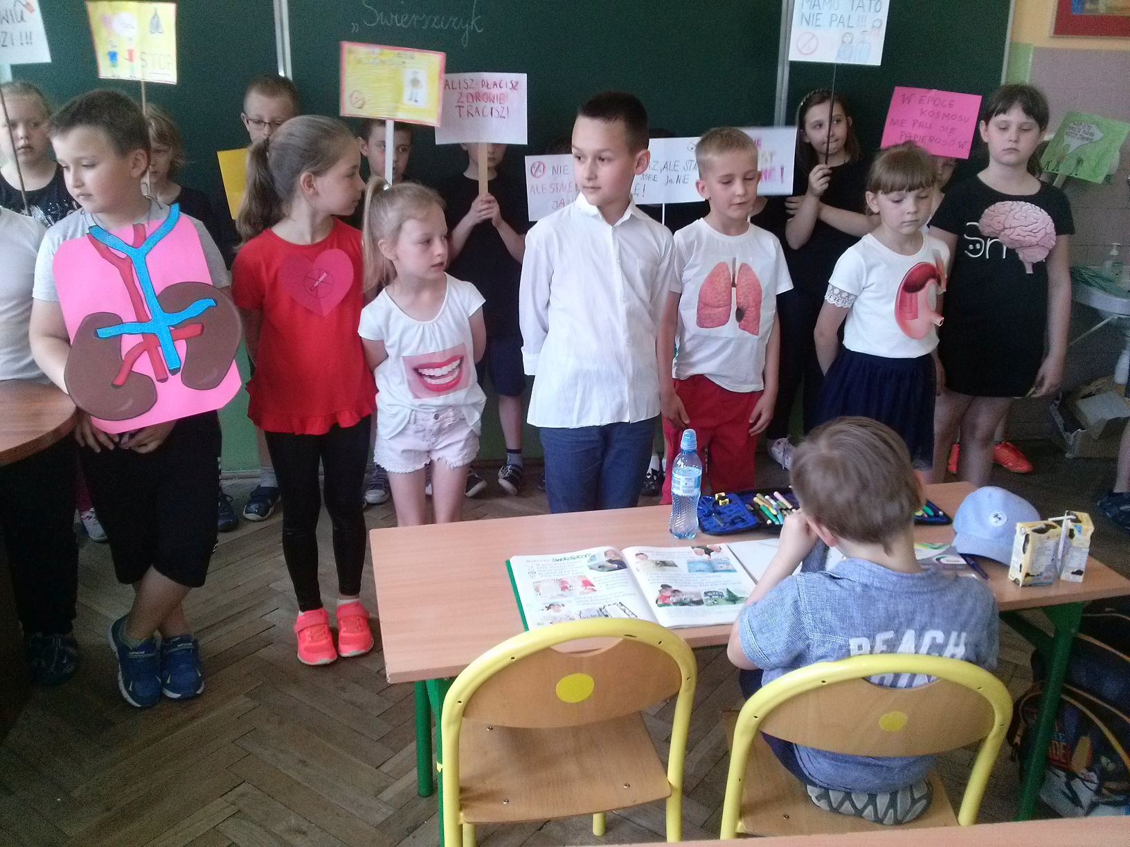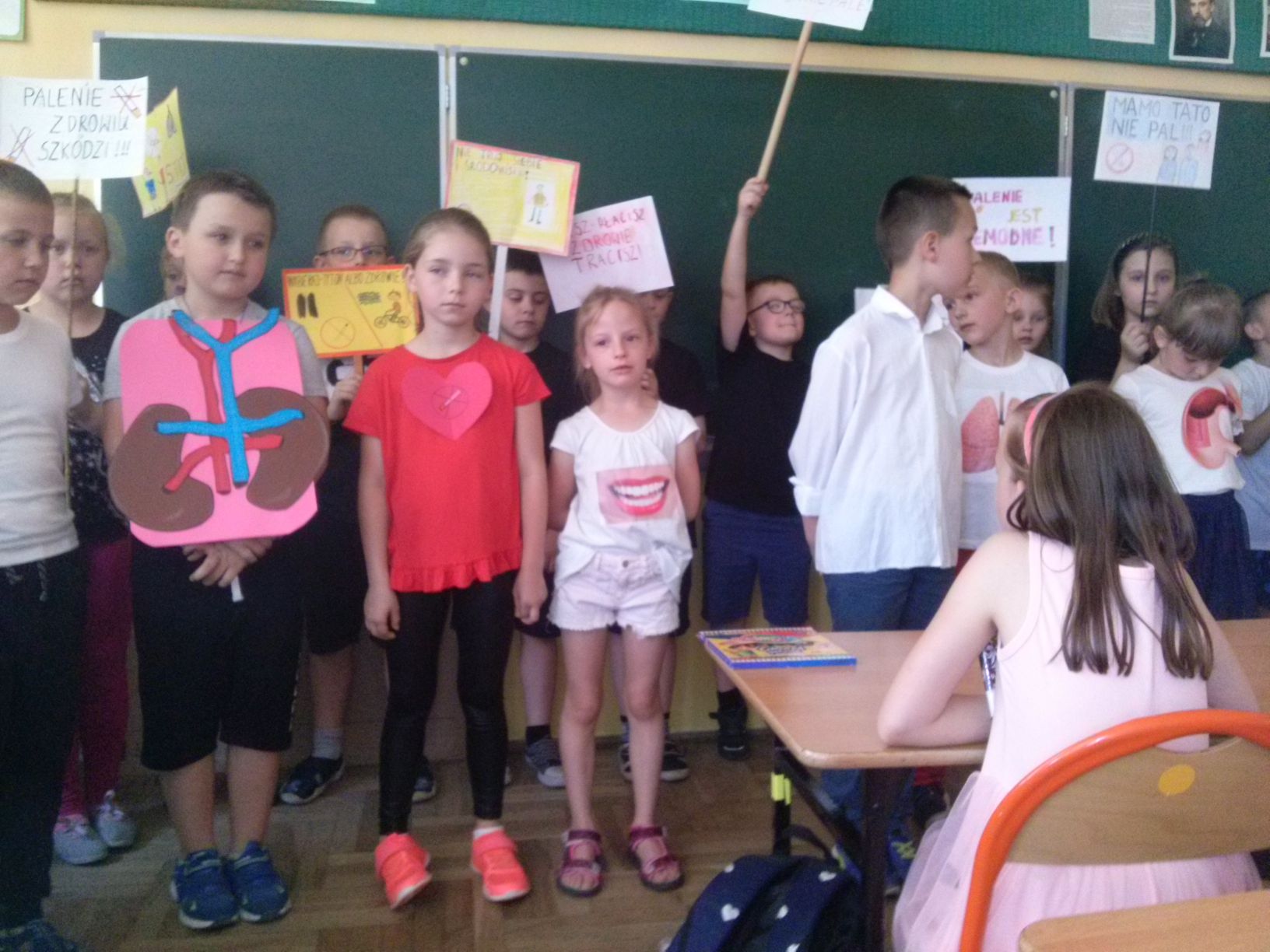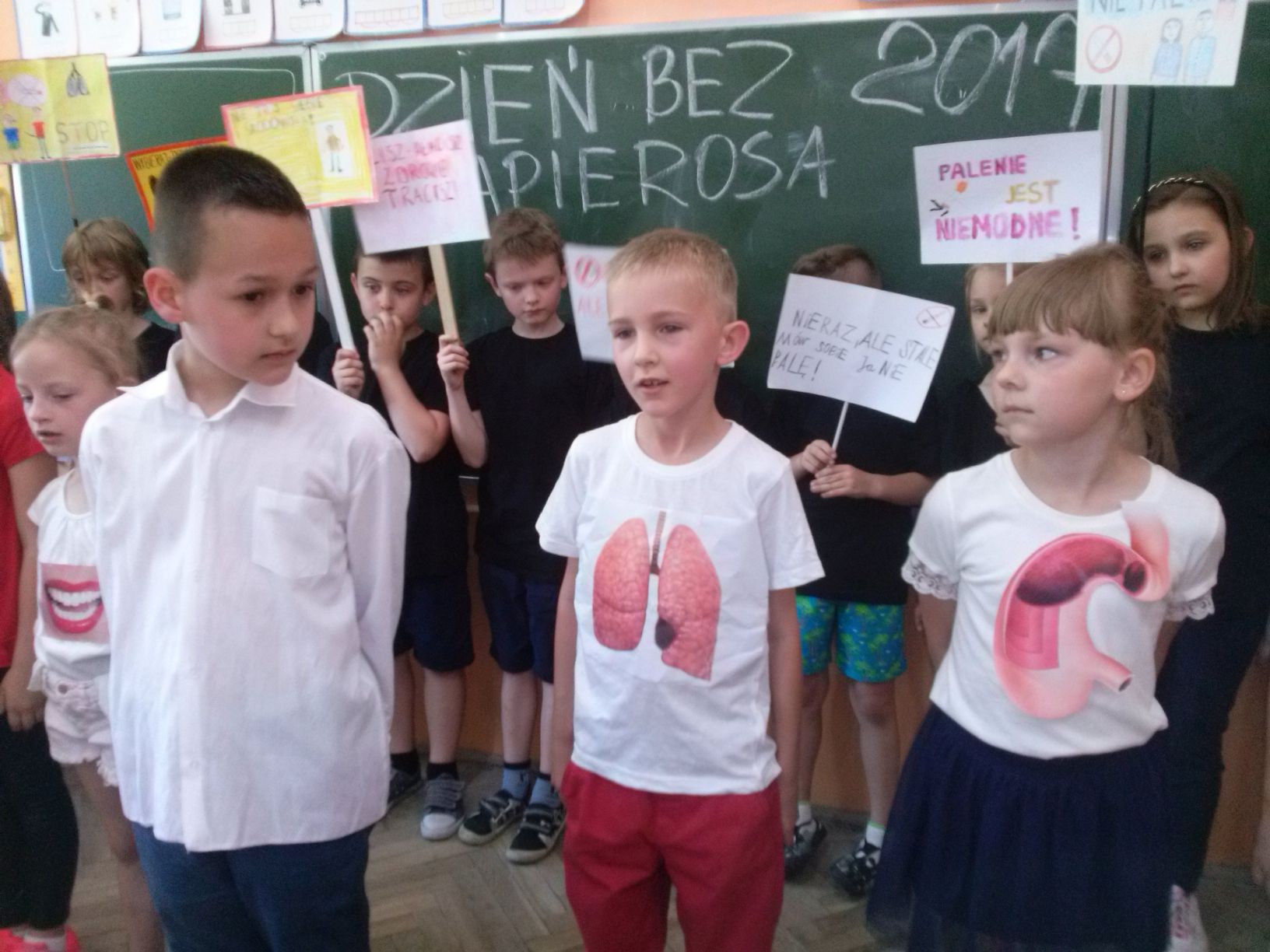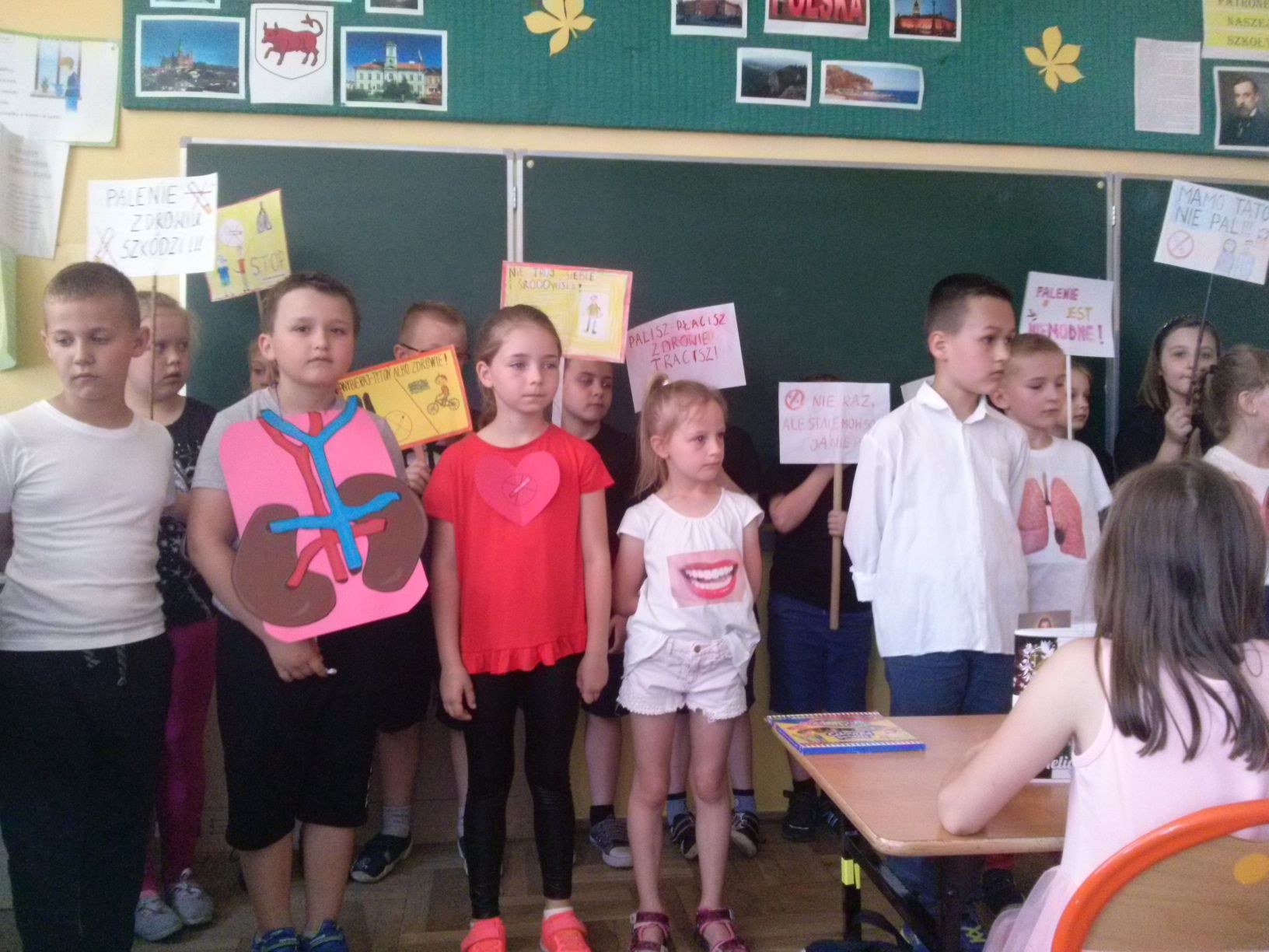 Klasa 2b przygotowała inscenizację, którą zaprezentowała w klasach pierwszych, drugich i trzecich oraz rodzicom. Uczeń Bartłomiej Karwacki wygłosił monolog pt. ,,Nigdy nie będę palił papierosów, ponieważ…”, a jego koledzy przedstawili wpływ skutków palenia na zdrowie.