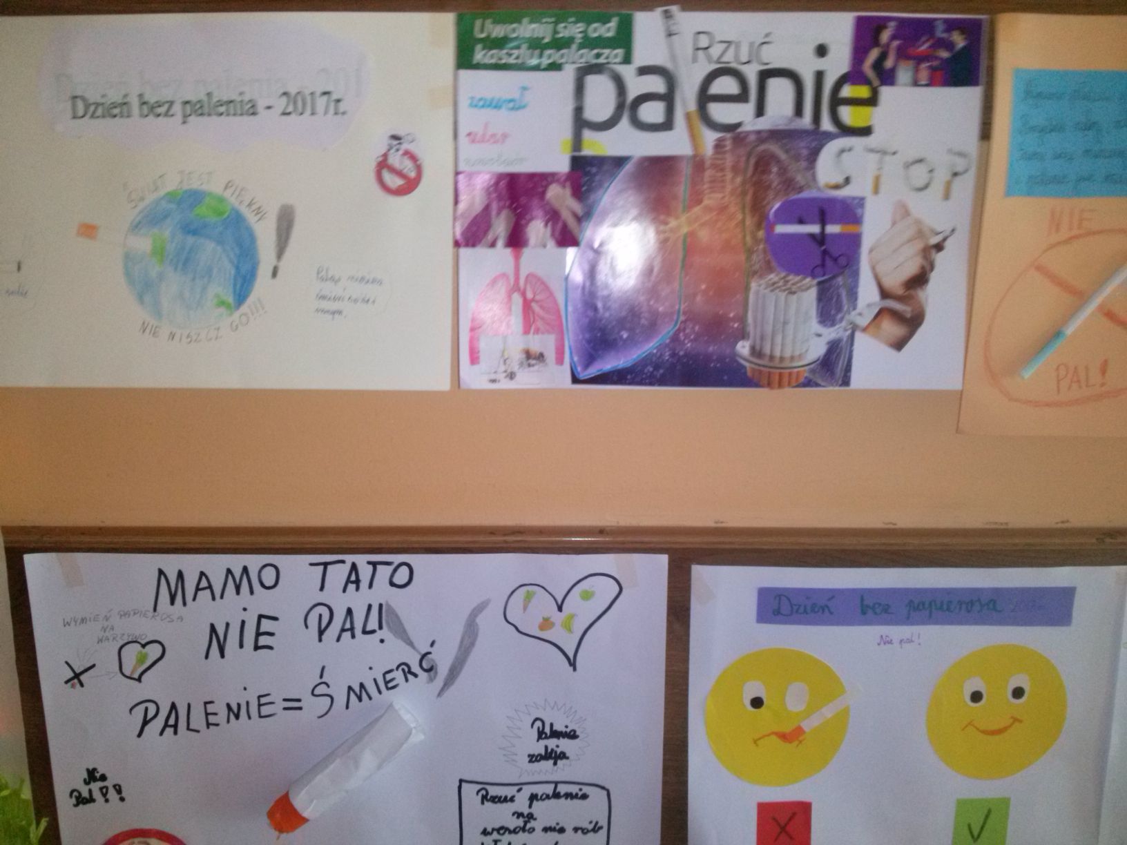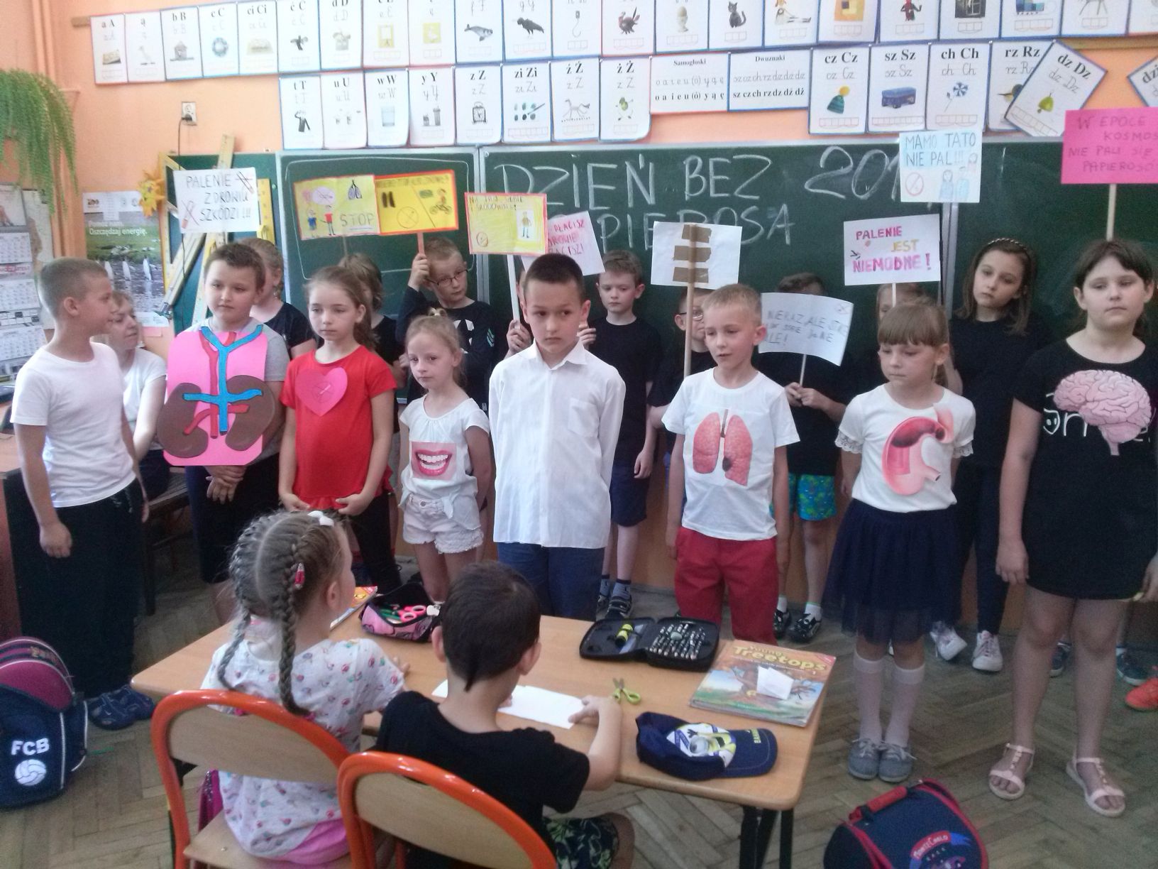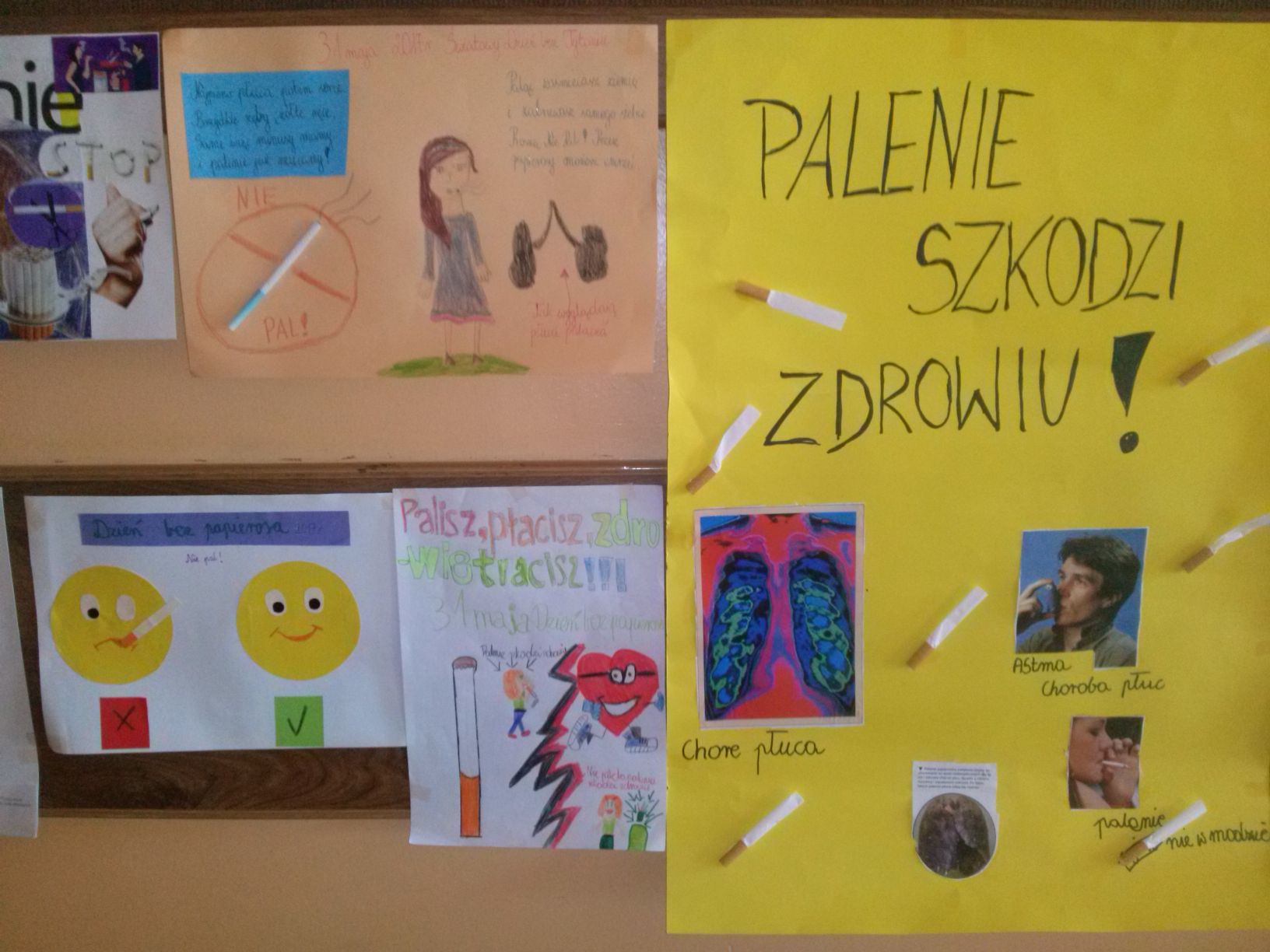 2 czerwca obchodziliśmy w naszej szkole Dzień bez Papierosa. Celem akcji było poszerzenie świadomości uczniów na temat zagrożeń związanych z paleniem papierosów. W klasach 1-3 odbyły się zajęcia, podczas których czytano wiersze, przeprowadzono pogadanki i rozdano ulotki tematyczne. Uczniowie aktywnie dzielili się spostrzeżeniami, a ich przemyślenia na temat szkodliwości palenia znalazły swój wyraz w interesujących pracach plastycznych, które zostały wyeksponowane na korytarzach. Każdy rodzic, odwiedzający naszą szkołę, może podziwiać prace i zastanowić się nad potrzebą rzucenia palenia.