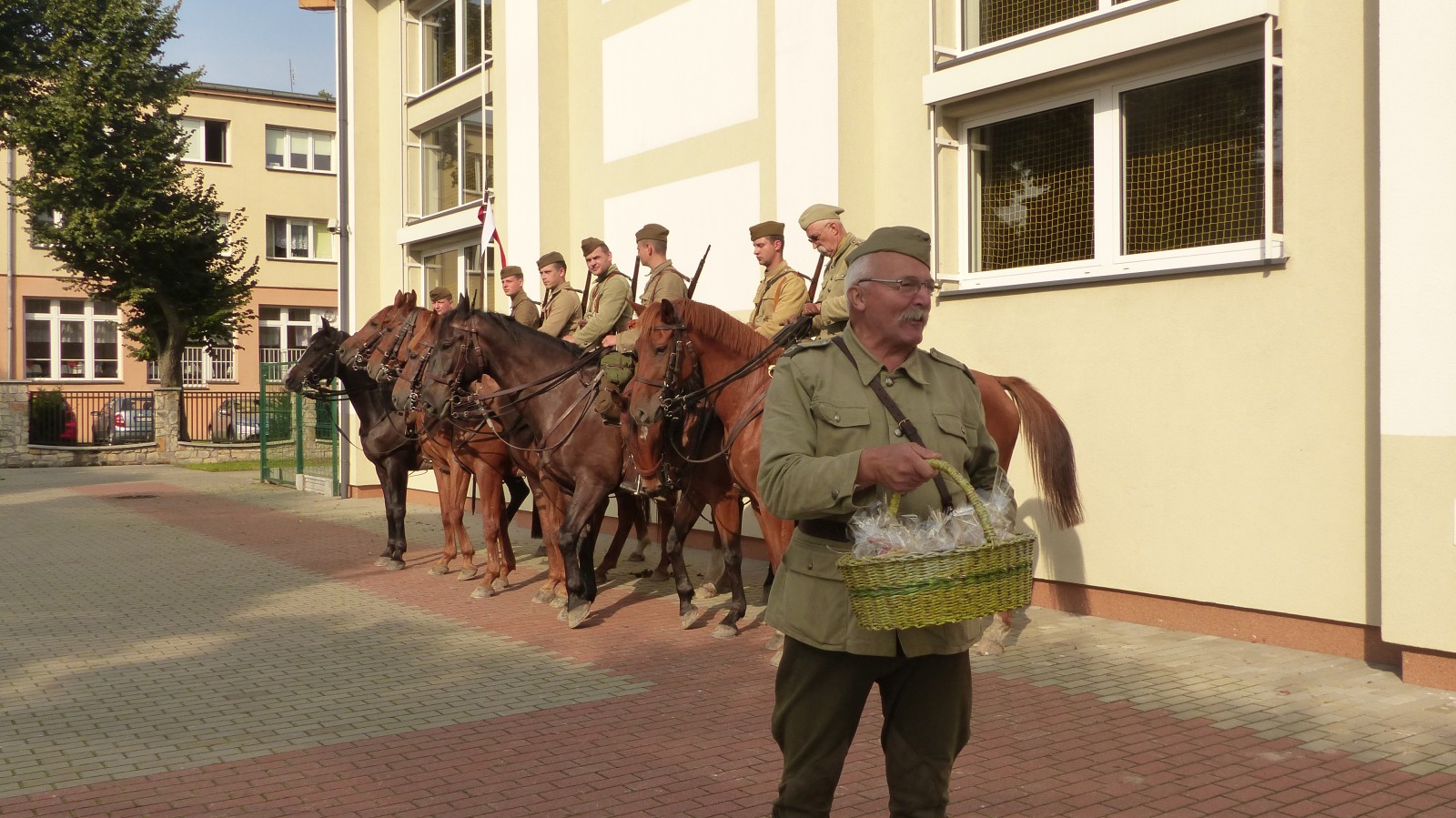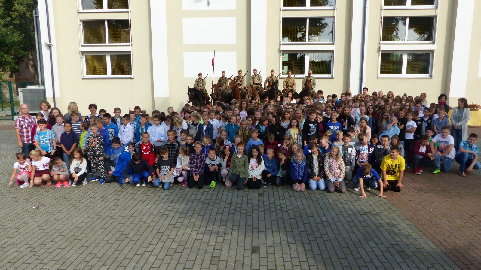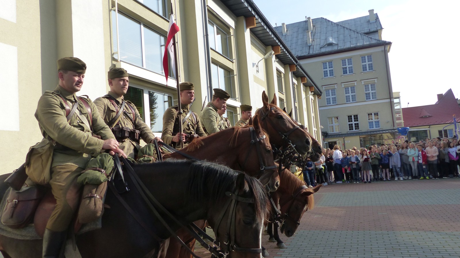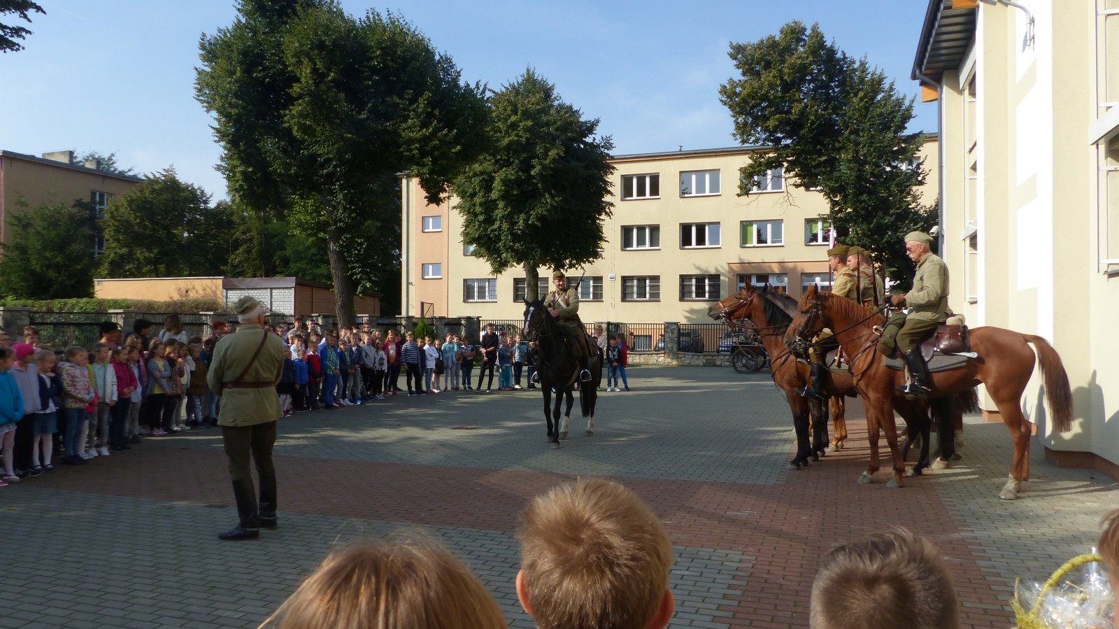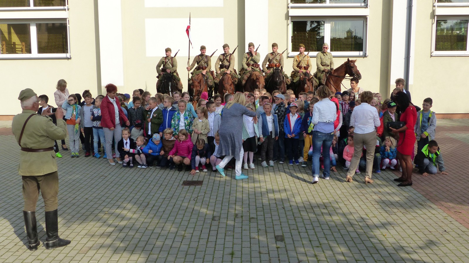 Na szkolnym boisku zgromadzili się uczniowie i nauczyciele, by spotkać się ze swoimi niecodziennymi gośćmi. Spotkanie prowadzili uczniowie klasy 4d Maja Walas i Bartosz Dziamara. Wszystkim spodobały się występy muzyczne klasy 4d oraz Basi Malety i Julii Ziemiańskiej, które zaśpiewały ułańskie pieśni.