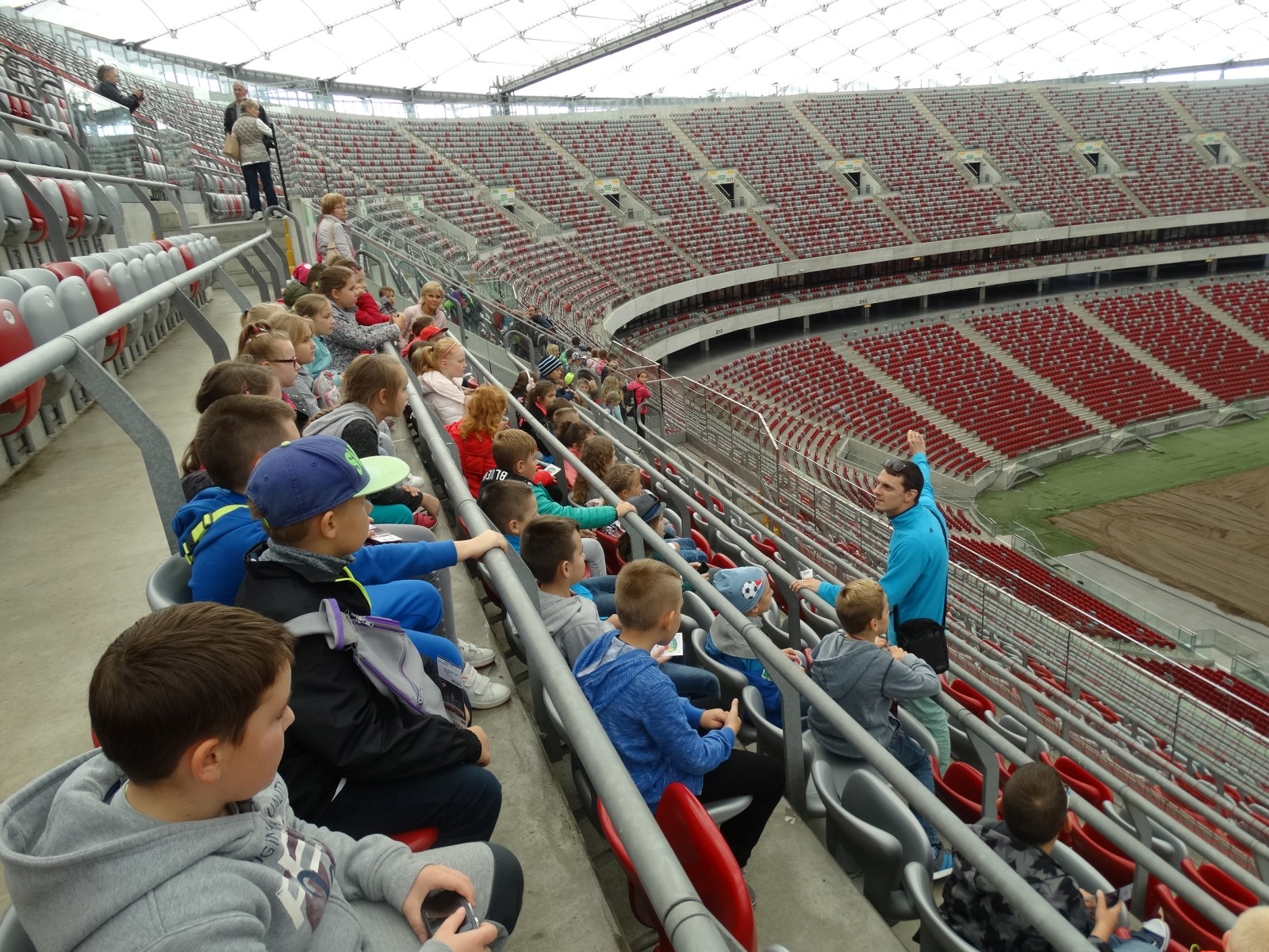 28 września 2017 roku, uczniowie z klasy 3a, 3c i 3e wraz z opiekunkami udali się na wycieczkę do Warszawy. Pierwszym, niezwykle ważnym do zwiedzania dla uczestników wycieczki był Stadion Narodowy. Jest wśród nas wielu kibiców piłki nożnej i wizyta na tym stadionie była spełnieniem ich marzeń. Gdy weszliśmy na trybuny i wspięliśmy się na sam ich szczyt, z góry podziwialiśmy ogrom tego obiektu. Naprawdę, robi wrażenie!