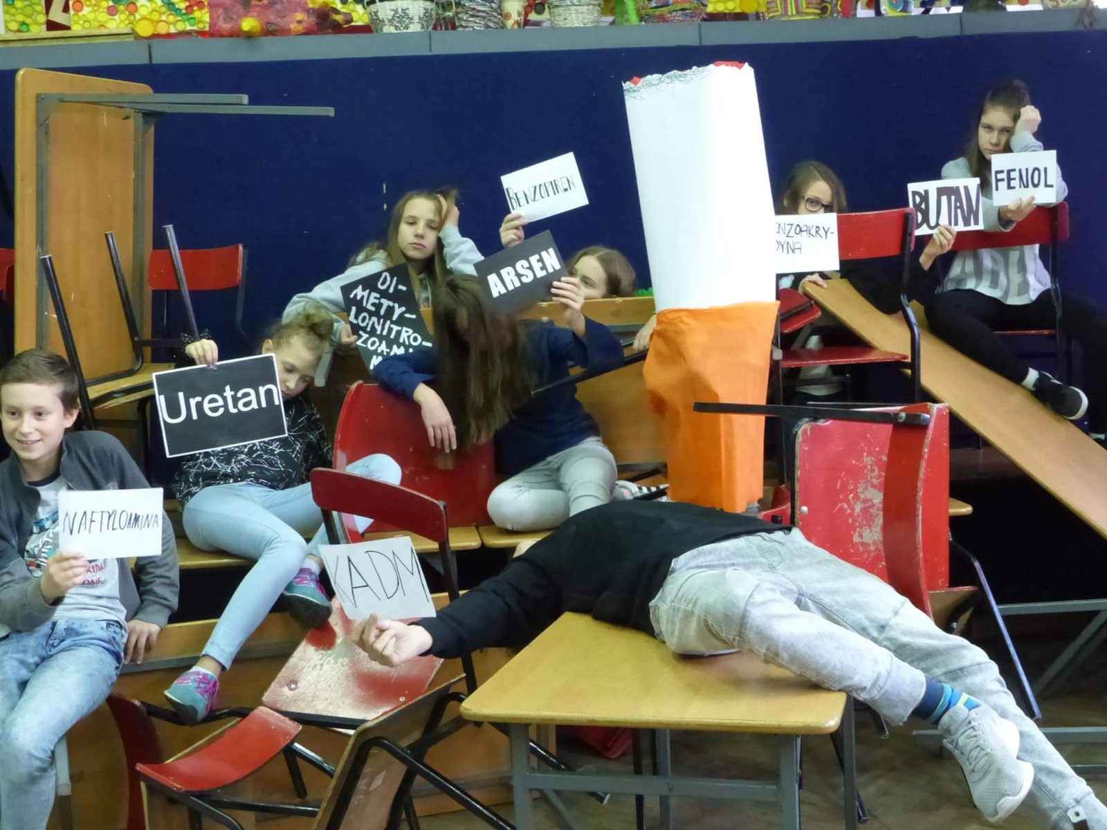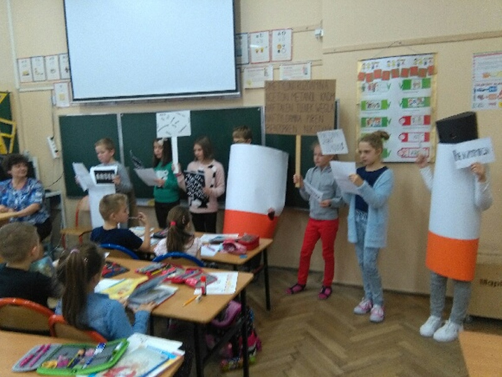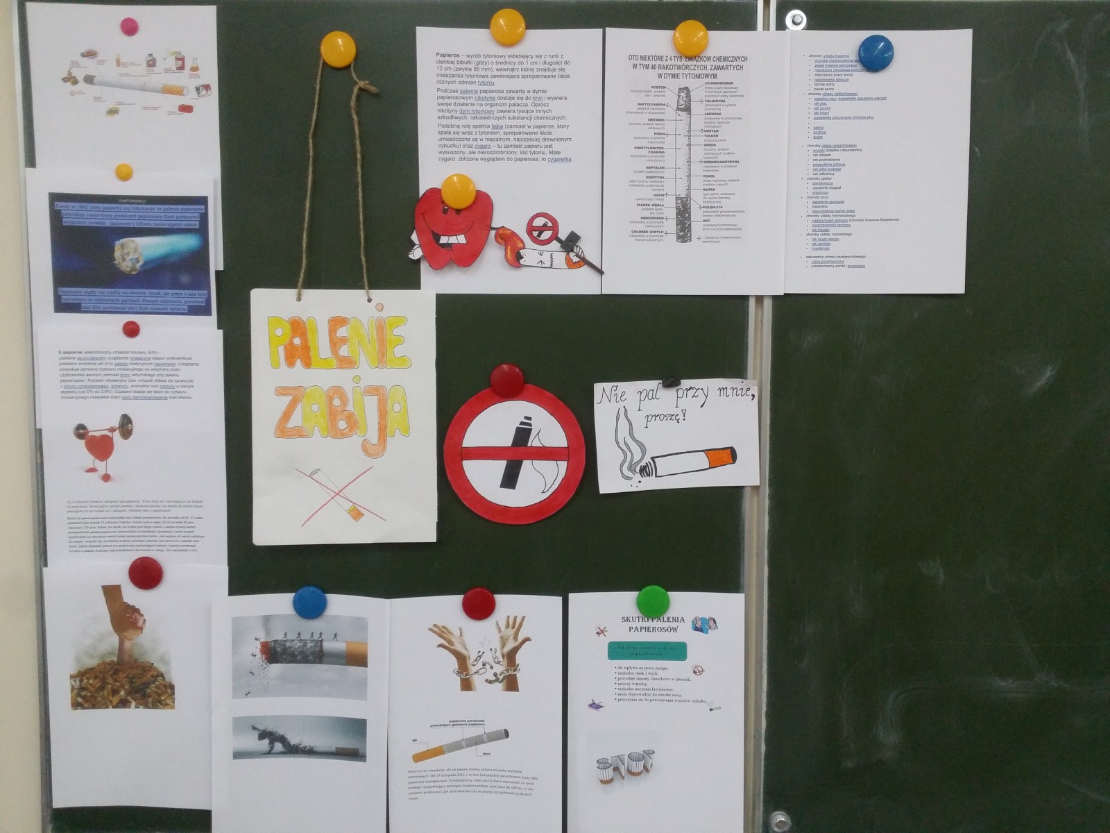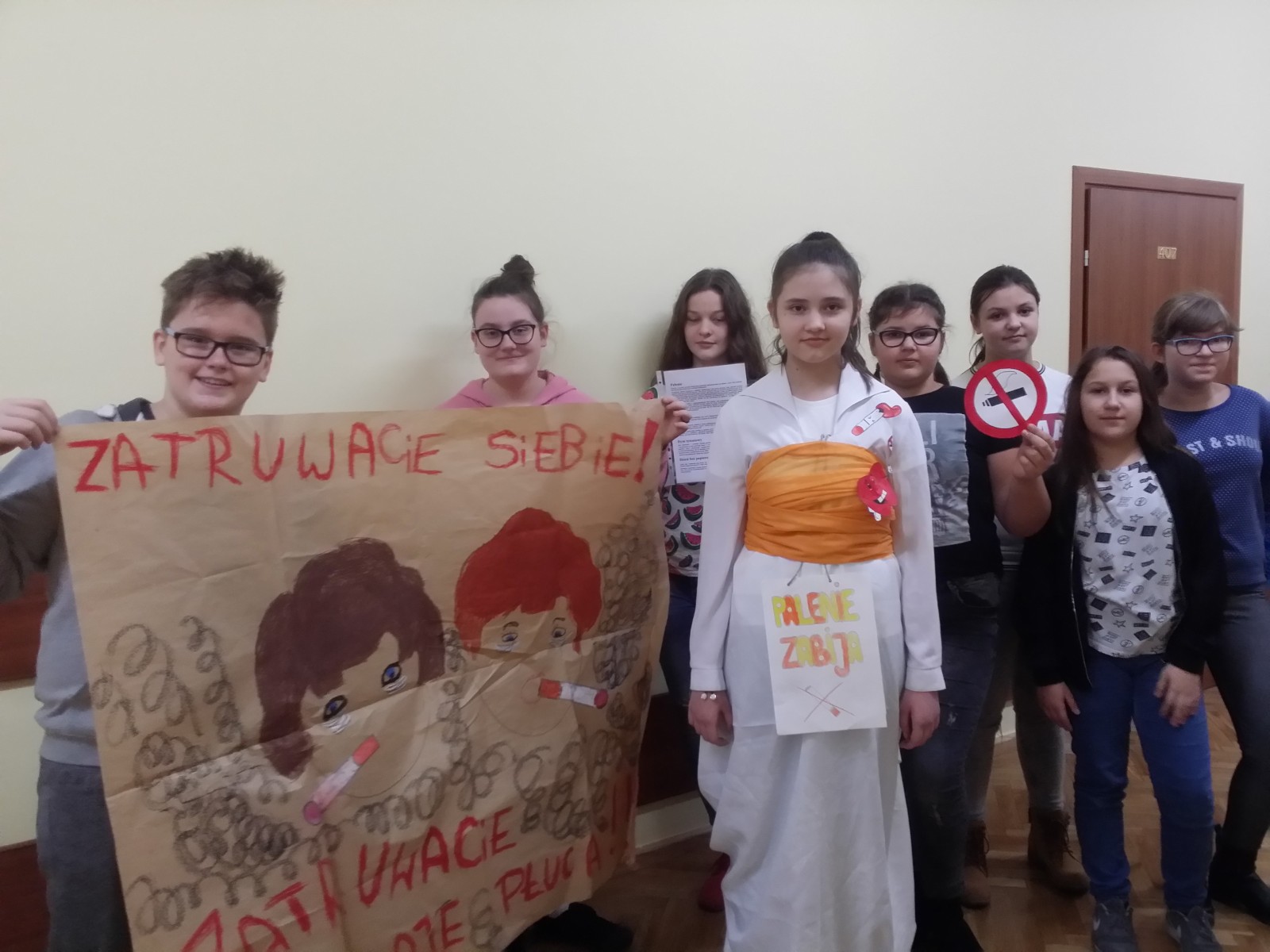 16 listopada 2017r. obchodziliśmy Światowy Dzień Rzucania Palenia. Tego dnia klasy 1-3 opracowywały nowe zakazy palenia tytoniu, a klasy 4-6 przebierały się za papierosa, obklejając go nawami substancji trujących. Każda klasa wraz z wychowawcą omówiła skutki palenia tytoniu i zapoznała się z statystykami osób palących w Polsce. Zadowalające jest to, iż procent ludzi palących papierosy jest z roku na rok coraz mniejszy. Klasa 4d i 5c zaprezentowały swoje stroje oraz uświadamiały uczniów i pracowników całej szkoły. Na wywiadówce rodzice zostali zapoznani z metodami rzucania palenia.