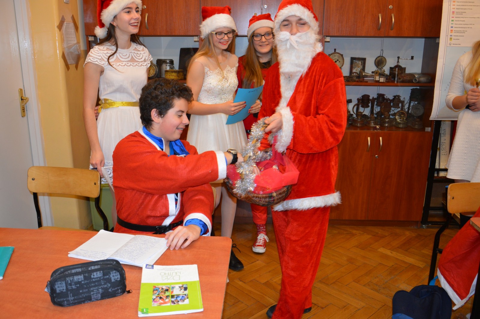 Nie trzeba pytać, na kogo grzeczne dzieci czekają 6 grudnia, bo wszyscy doskonale wiedzą, że na św. Mikołaja. W tym dniu nasza szkoła przeżyła prawdziwą inwazję Mikołajów. Można było ich spotkać dosłownie wszędzie. Okazało się, iż grzecznych dzieci w naszej szkole nie brakuje, bowiem do każdej klasy zawitał Mikołaj wraz ze Śnieżynkami. Zadawał uczniom pytania i za każdą dobrą odpowiedź nagradzał ich cukierkami. Dodatkowo, całą tę radosną atmosferę urozmaiciły ,,muzyczne przerwy” utrzymane w konwencji bożonarodzeniowej. Na koniec wszystkim Mikołajom zrobiono pamiątkowe zdjęcie przy pachnącej choince.