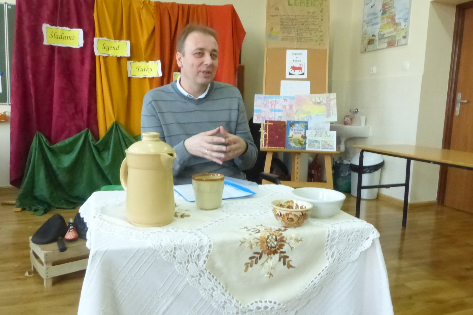 Następnie podążając śladami legend, pan Bartosz Stachowiak opowiedział legendy związane z Turkiem i okolicami: „Jak Matka Boska Jezuska kąpała”, „O milczącym dzwonku z turkowskiego kościoła”, „Tur, Turcy, Turek”. Uczniowie z zaciekawieniem wysłuchali rodzimych legend, a później wyodrębniali wydarzenia oraz wyróżniali elementy fantastyczne i realistyczne. Nauczycielka języka polskiego Emilia Kozłowska stwierdziła, że cel lekcji został osiągnięty: uczniowie znają legendy związane z Turkiem i okolicami oraz umieją wymienić cechy legend jako gatunku literackiego. Lekcja stanowiła doskonałe przygotowanie do samodzielnego tworzenia opowieści legendarnych, w których dzieci zastosują własną wyobraźnię i wiedzę. Dziękujemy panu Bartoszowi Stachowiakowi za przybycie i pomoc w realizacji tematu o legendach.