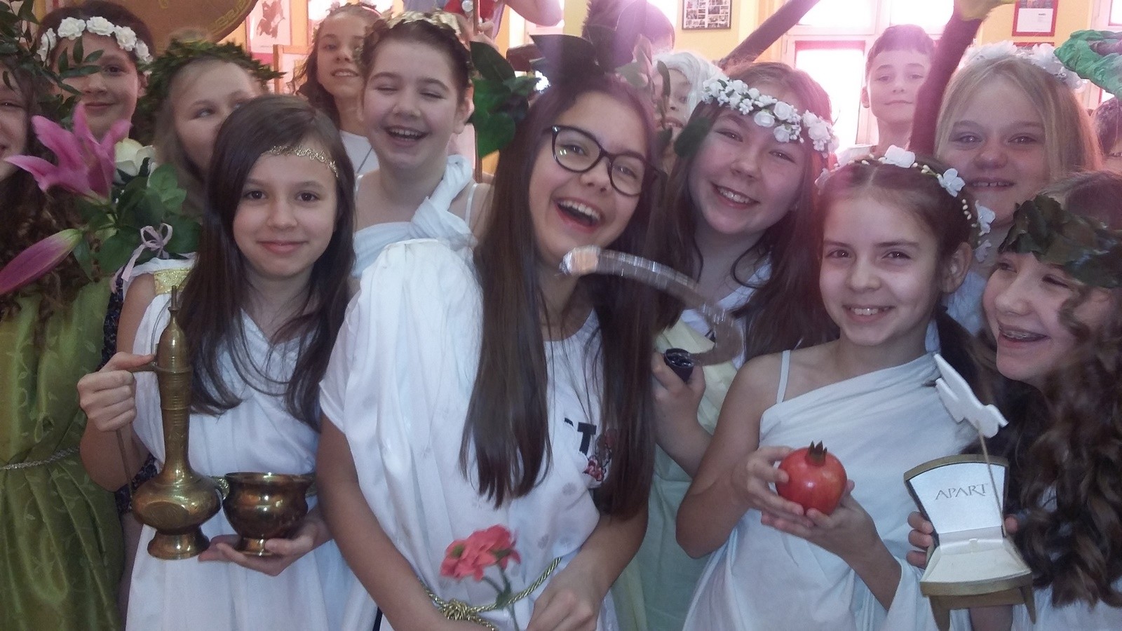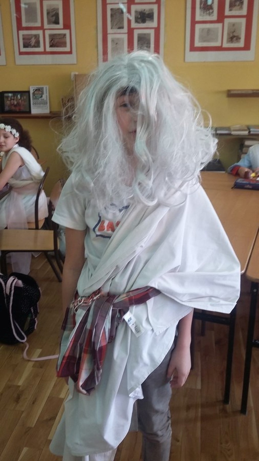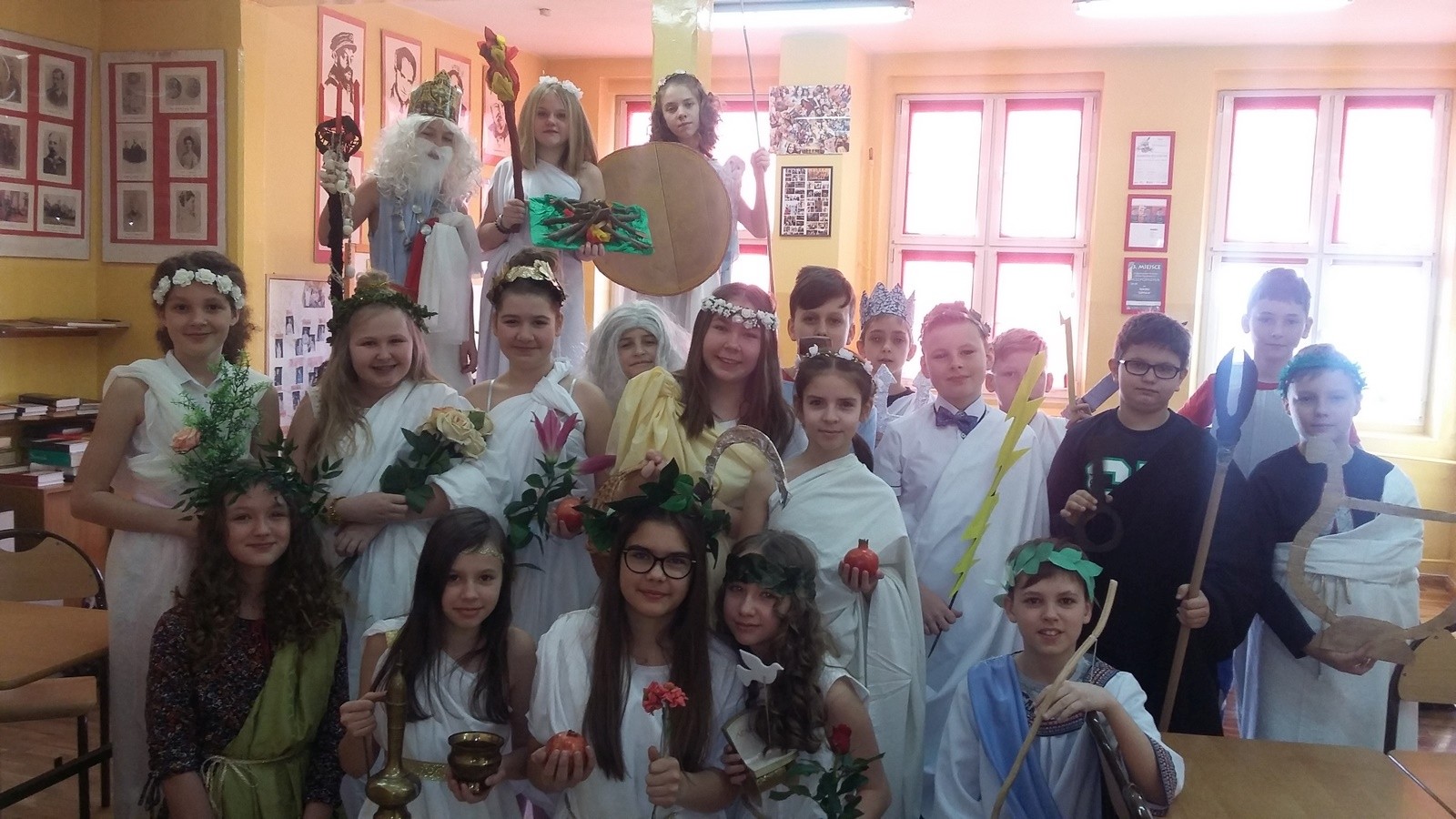 W środę, 21 marca pracownia polonistyczna zamieniła się w siedzibę bogów greckich – Olimp. Uczniowie klasy 5c i 5d wcielili się w postaci z mitologii. Zadaniem było przygotowanie własnoręcznie wykonanego stroju, atrybutu i tekstu na temat wylosowanego boga, najlepiej wygłoszonego z pamięci. Do projektu wszyscy podeszli profesjonalnie. Uczniowie występowali przed swoją klasą, próbowali opanować tremę, uczyli się współpracować w grupie, a wszystko w miłej i serdecznej atmosferze. Przez całą przerwę zakładali stroje: materiały, koce, prześcieradła, a nawet obrusy! Niektóre były wyjątkowe, np. własnoręcznie malowane, barwne i zabawne. Przewiązywali się wstążkami, pomagali sobie, ćwiczyli kwestie. Każdy chciał przedstawić swoją postać jak najlepiej i najciekawiej, aby wszyscy słuchali zdziwieni i zaskoczeni informacjami. Na zakończenie wykonano grupową fotografię.