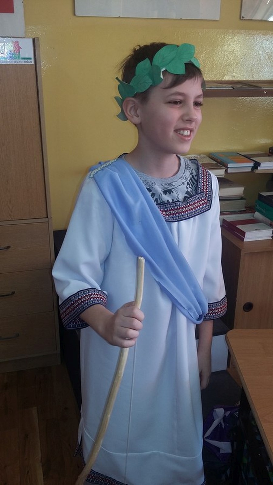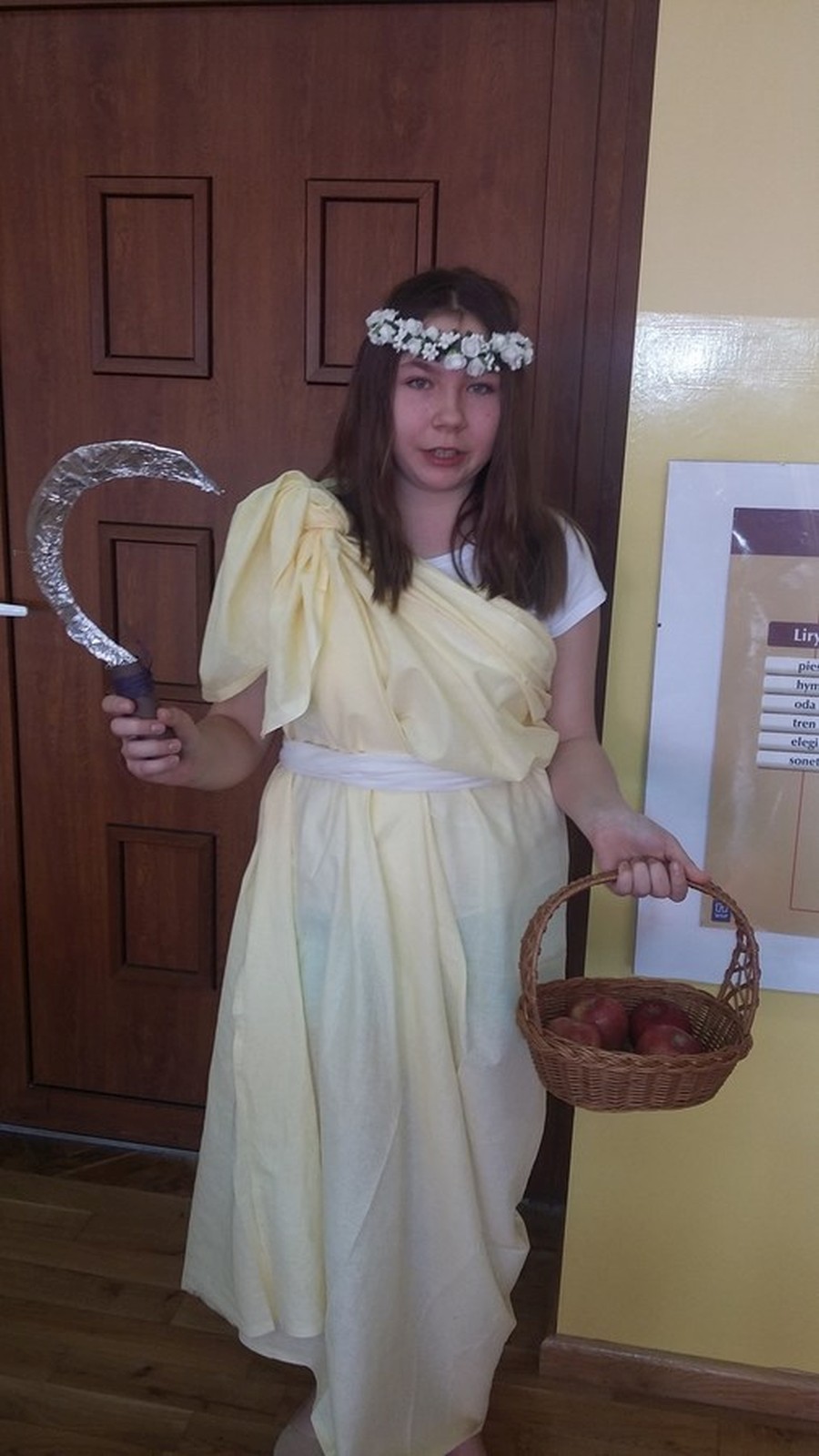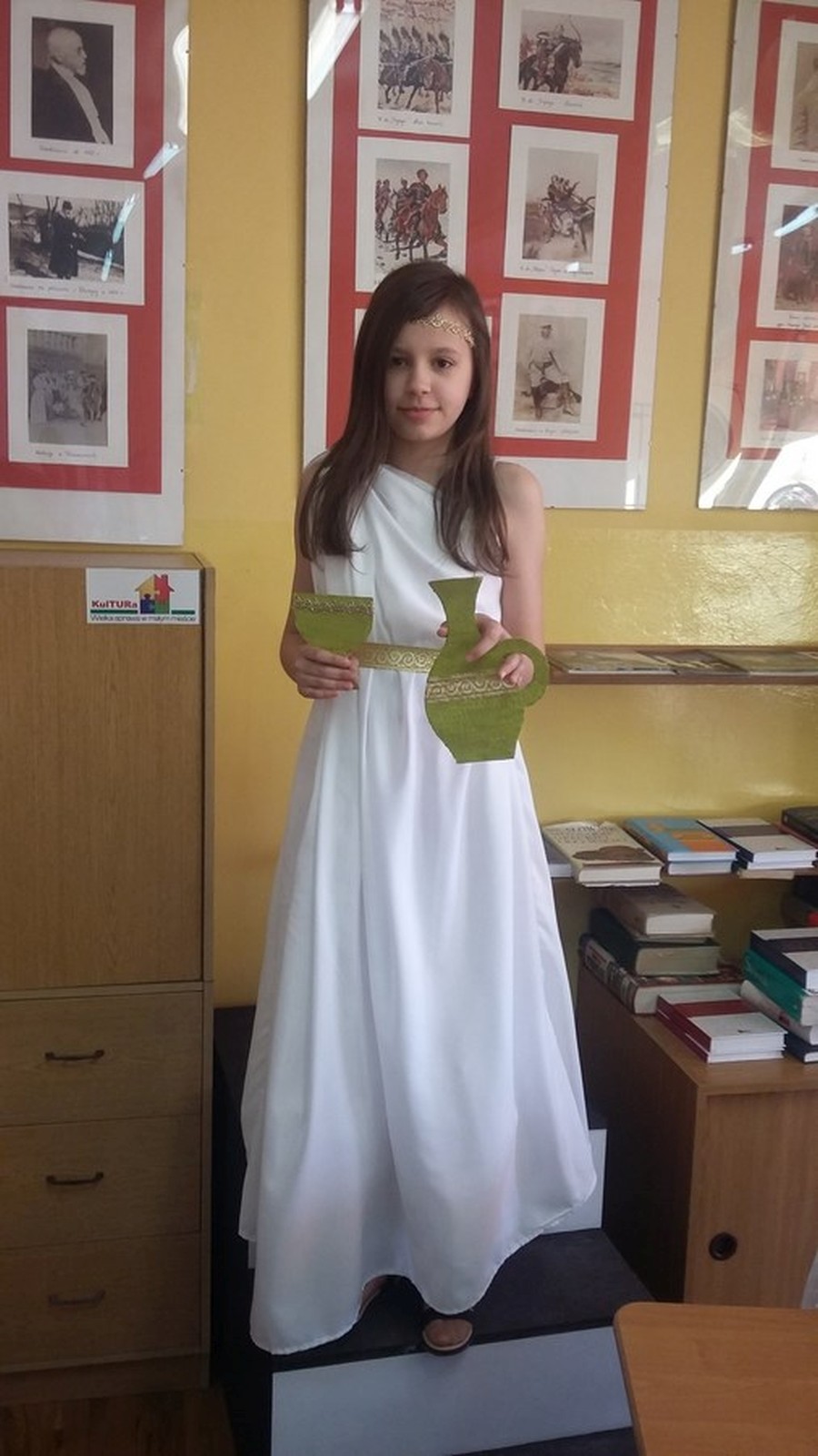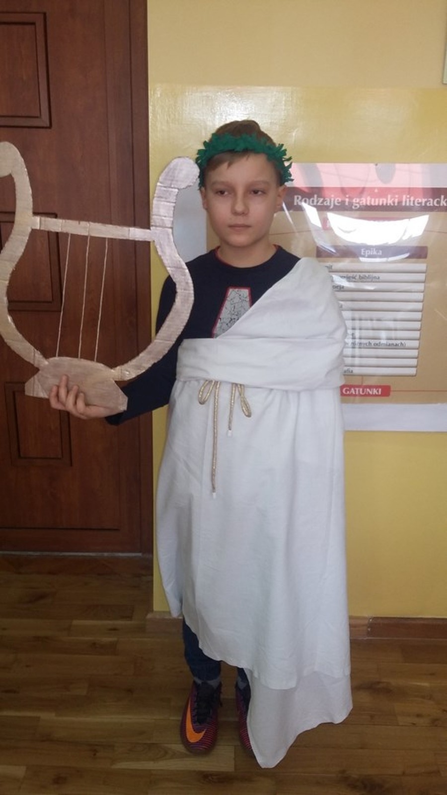 W środę, 21 marca pracownia polonistyczna zamieniła się w siedzibę bogów greckich – Olimp. Uczniowie klasy 5c i 5d wcielili się w postaci z mitologii. Zadaniem było przygotowanie własnoręcznie wykonanego stroju, atrybutu i tekstu na temat wylosowanego boga, najlepiej wygłoszonego z pamięci. Do projektu wszyscy podeszli profesjonalnie. Uczniowie występowali przed swoją klasą, próbowali opanować tremę, uczyli się współpracować w grupie, a wszystko w miłej i serdecznej atmosferze. Przez całą przerwę zakładali stroje: materiały, koce, prześcieradła, a nawet obrusy! Niektóre były wyjątkowe, np. własnoręcznie malowane, barwne i zabawne. Przewiązywali się wstążkami, pomagali sobie, ćwiczyli kwestie. Każdy chciał przedstawić swoją postać jak najlepiej i najciekawiej, aby wszyscy słuchali zdziwieni i zaskoczeni informacjami. Na zakończenie wykonano grupową fotografię.
