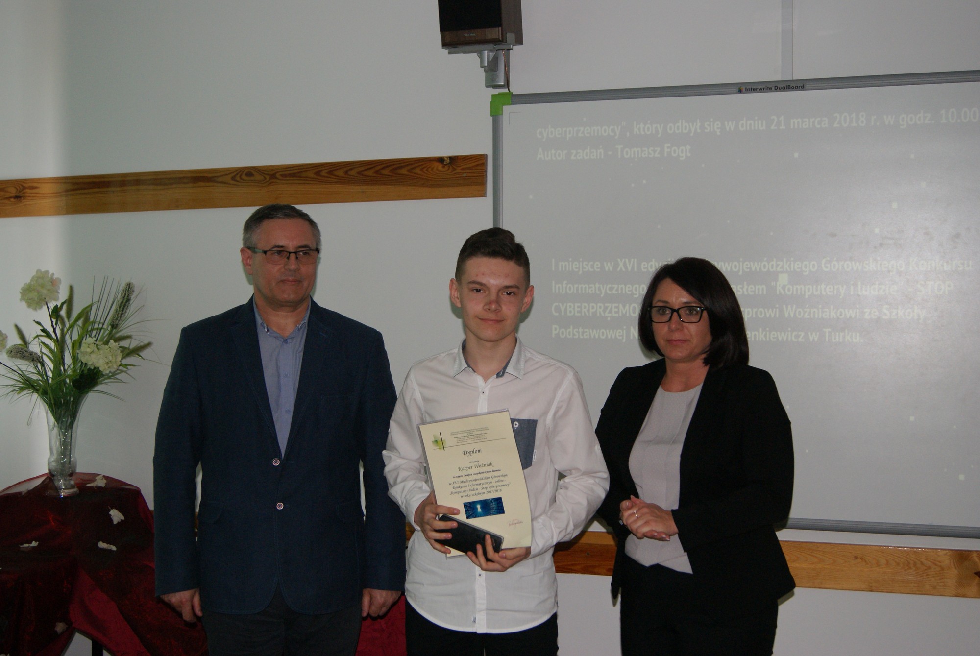 Kacper Woźniak, uczeń oddziału gimnazjalnego Szkoły Podstawowej nr 1 w Turku, odniósł duży sukces wygrywając XVI edycję Międzywojewódzkiego Górowskiego Konkursu Informatycznego on-line pod hasłem "Komputery i ludzie" - STOP CYBERPRZEMOCY. Miesiąc wcześniej chętni uczniowie z trzech województw (wielkopolskiego, śląskiego i lubuskiego) rozwiązywali online test z szeroko pojętej wiedzy informatycznej. Kacper zdobył pierwsze miejsce i w poniedziałek odebrał dyplom i nagrody.