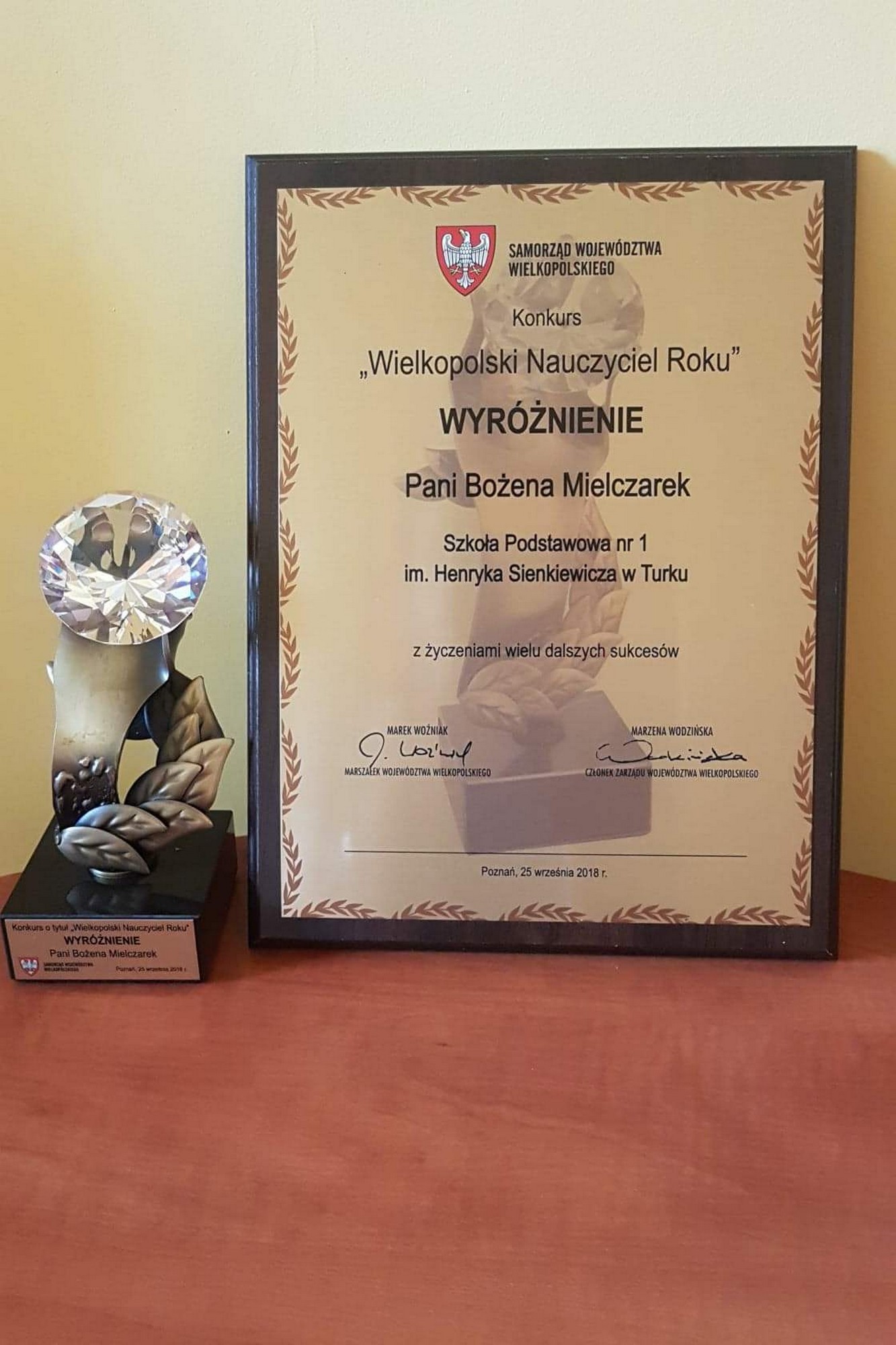 25 września br. w Teatrze Wielkim im. Stanisława Moniuszki w Poznaniu odbyła się uroczysta Gala, podsumowująca konkurs „Wielkopolski Nauczyciel Roku”. Pani Bożena Mielczarek z rąk pani Marzeny Wodzińskiej v-ce Marszałek Województwa Wielkopolskiego otrzymała statuetkę przedstawiającą dłoń, owiniętą laurem, trzymającą diament – symbolizujący ucznia oraz dyplom potwierdzający osiągnięcia. W uroczystości podsumowującej konkurs udział wzięli: dyrektor szkoły Elżbieta Pokojowa, v-ce dyrektor Krystyna Morek oraz nauczyciele. Galę uświetnił występ solistów Teatru Wielkiego oraz Koncert Varius Manx & Kasia Stankiewicz.