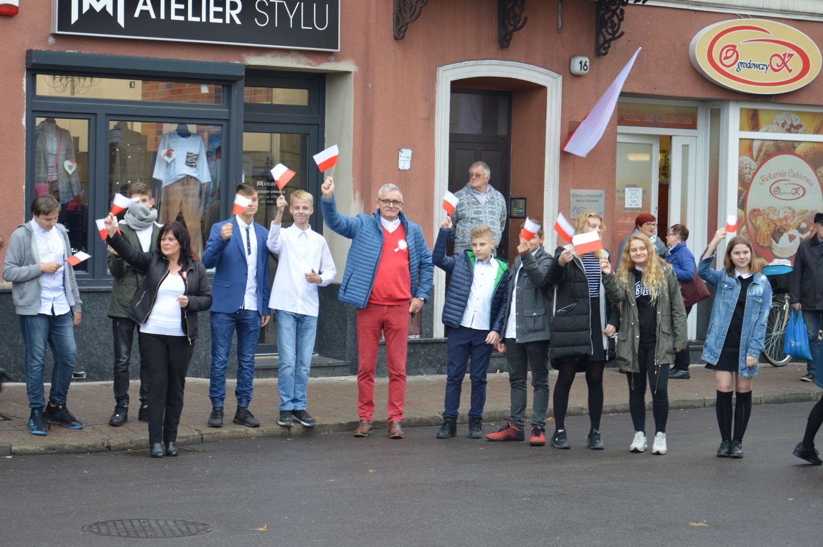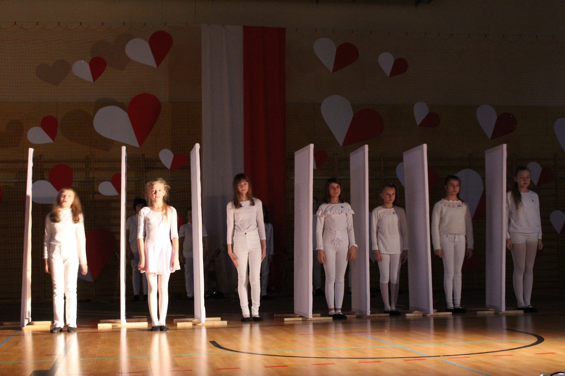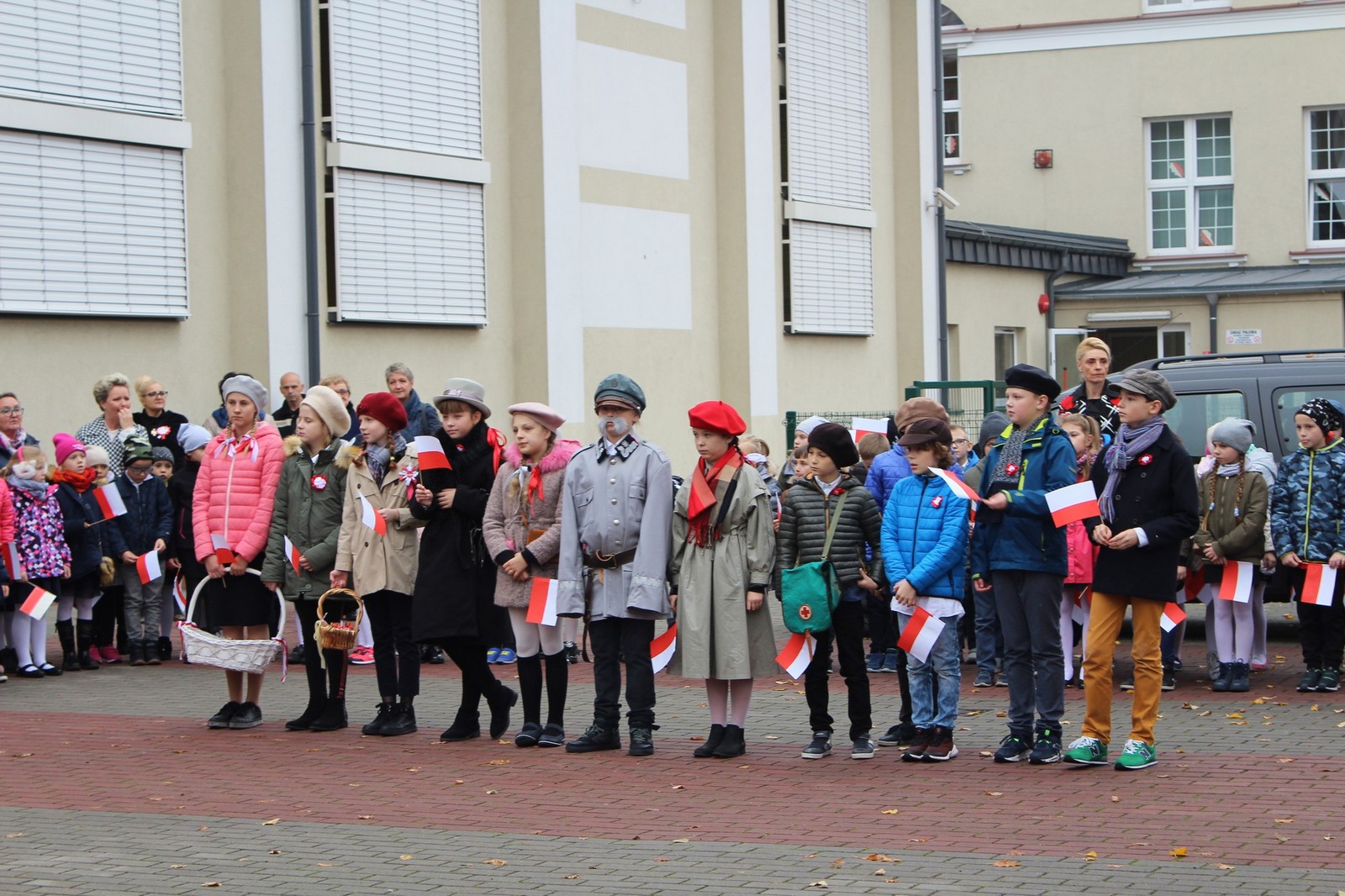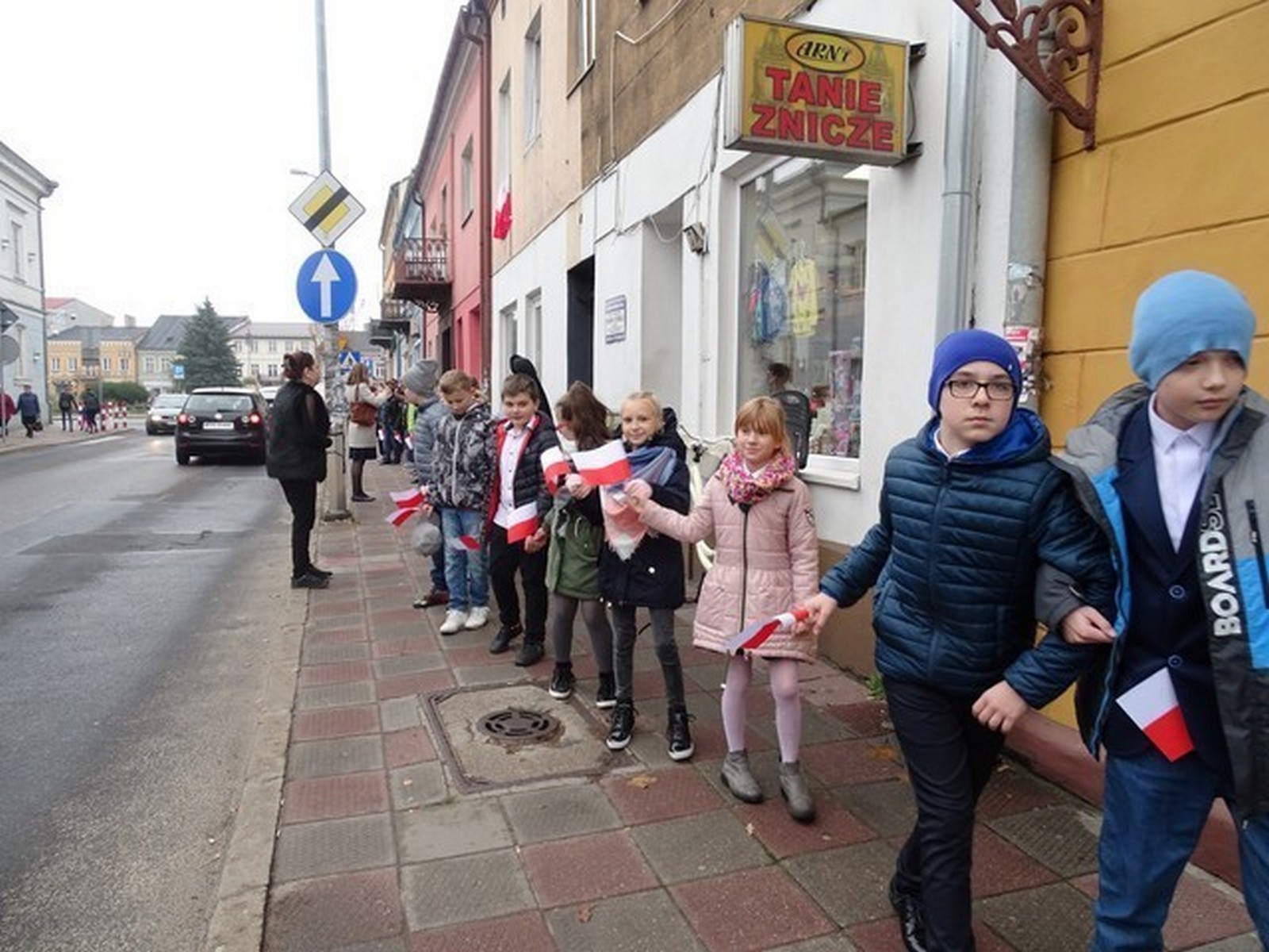 O godz.11.11 –wszyscy uczniowie i nauczyciele włączyli się do ogólnopolskiej akcji i uroczyście odśpiewali hymn państwowy przed budynkami szkoły. Po zakończeniu hymnu państwowego uczniowie klas I – VIII oraz oddziały gimnazjalne utworzy Łańcuch Niepodległości, wzdłuż ulic naszego miasta, łączących oba budynki szkoły, od ul. 3 Maja do ul. Parkowej. Do Łańcucha przyłączyli się przechodnie, zachęcani do udziału w tej akcji z balkonu miejskiego Ratusza. Byli to uczniowie: Hubert Majka, Jakob Loba, Weronika Karolak, Michalina Stasiak.