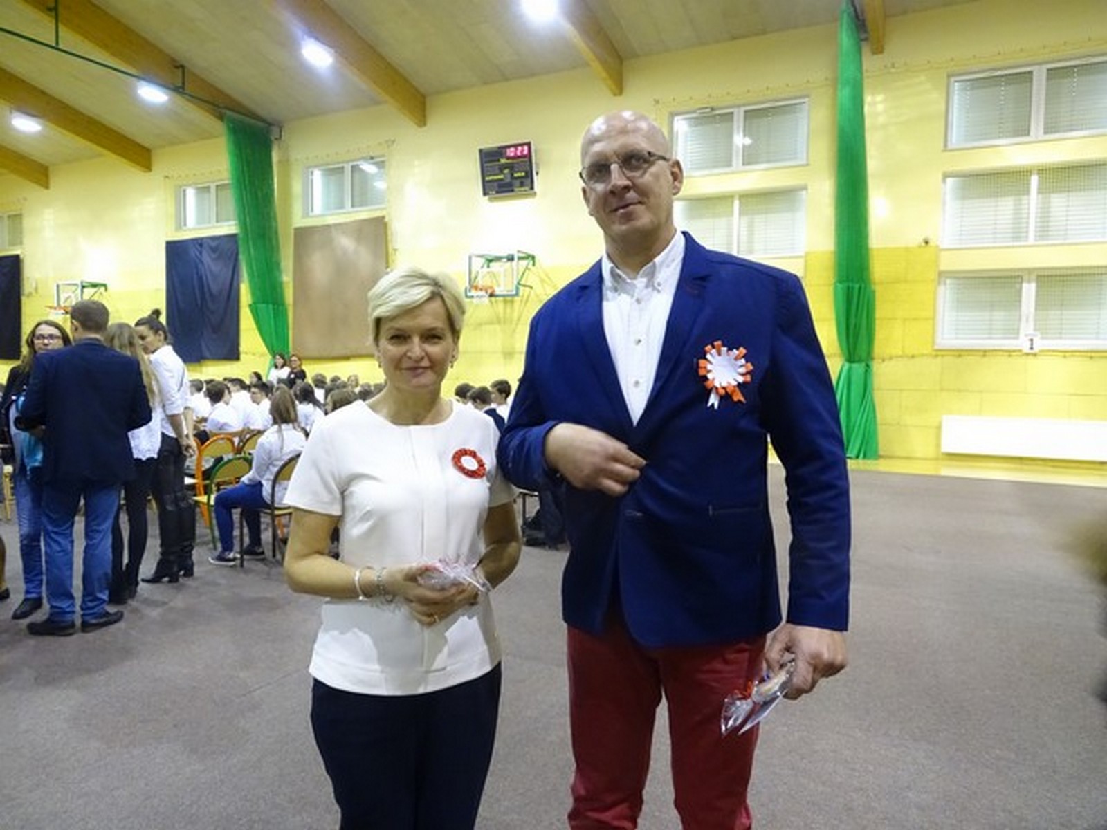 Uroczysty apel z udziałem całej społeczności szkolnej prowadzili uczniowie III klasy gimnazjalnej: Kinga Piskuła i Hubert Kozelan.