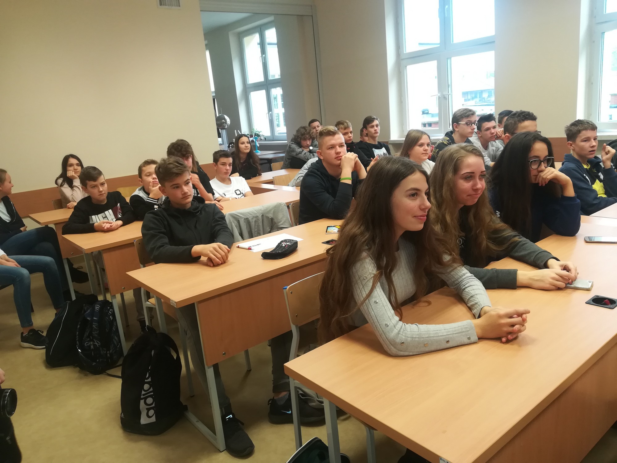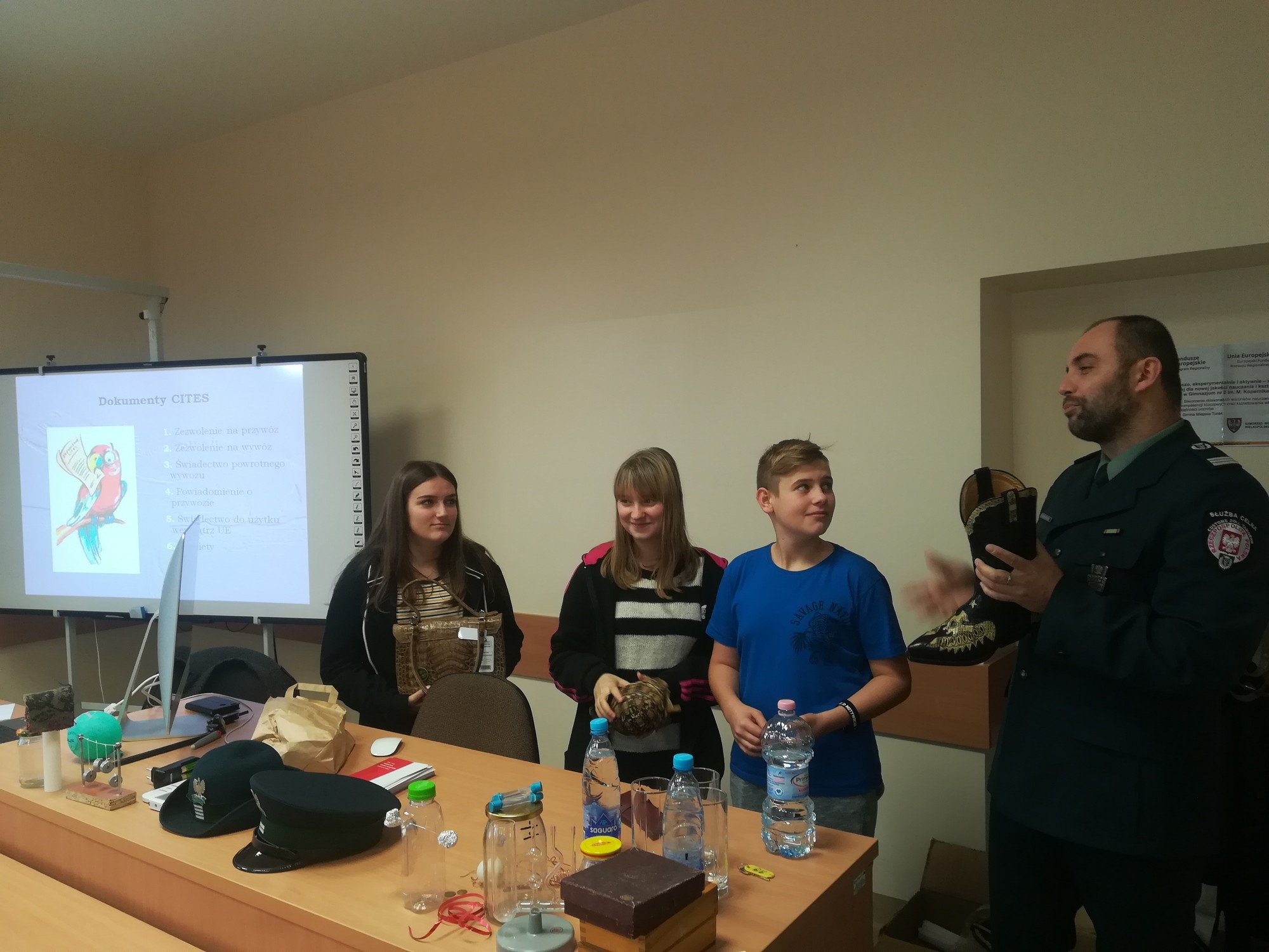 Dnia 13.11.2018 r. uczniowie klasy 8 c i 8b mieli możliwość poznania specyfiki zawodu celnika, bowiem do naszej szkoły zawitali przedstawiciele służby celnej z Kalisza. Panowie przedstawili młodzieży zasady swojej pracy oraz namiastkę obowiązujących przepisów celnych. Na spotkaniu pokazali przedmioty, które zostały zarekwirowane podróżnym podczas kontroli na lotnisku. Były to m.in.: torebka ze skóry krokodyla, skórzane buty, grzechotka ze skorupy żółwia, skóra węża, butelka z kobrą i skorpionem w środku. Tym faktem uświadomili młodzieży, że nie wszystko co można traktować jako pamiątkę z wakacji, jest legalne a posiadanie takich przedmiotów podlega karze.