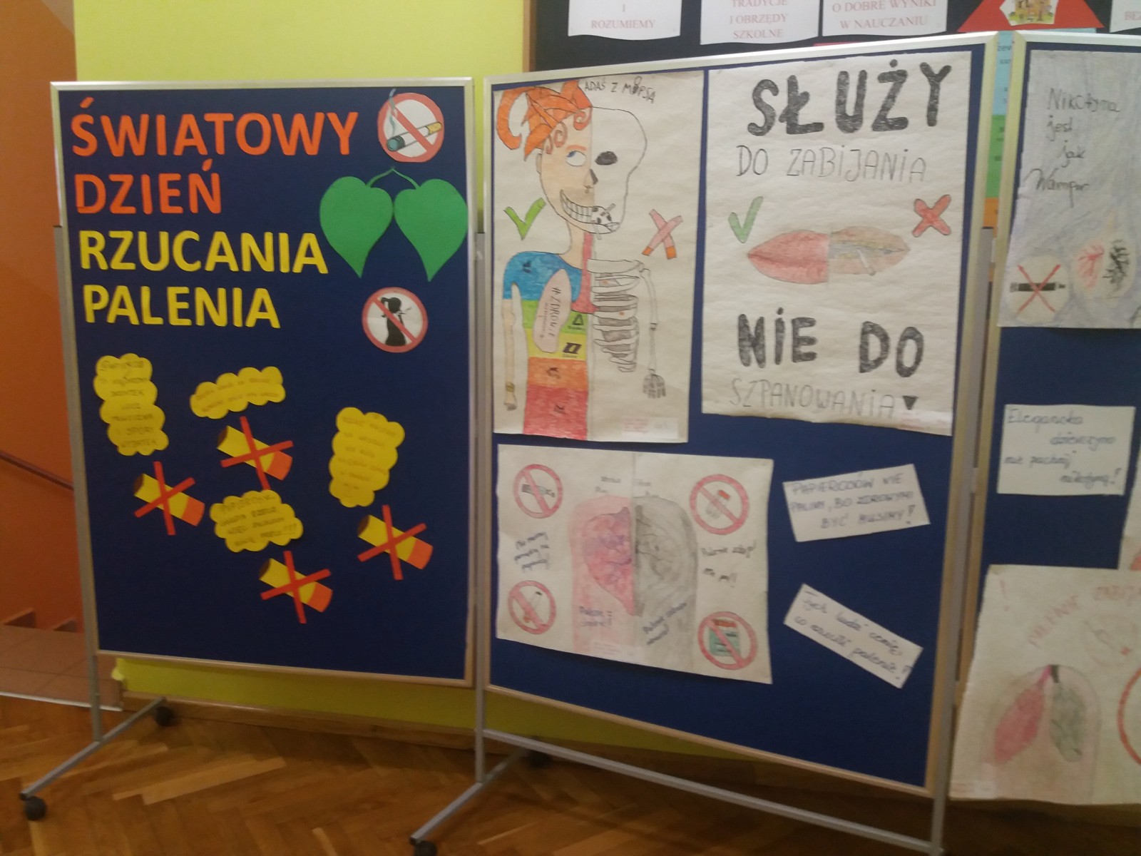 W dniach od 15 do 22 listopada obchodziliśmy „Światowy Dzień Rzucania Palenia”. W każdej klasie od I do VIII SP i III GIM odbyły się lekcje o tematyce „Papierosy są niemodne i niezdrowe – skutki palenia tytoniu”. W klasach IV pani pielęgniarka opowiedziała o szkodliwości palenia tytoniu oraz o innych uzależnieniach. W klasach VII-VIII i III Gim przeprowadzono diagnozę uczniów w zakresie używania środków psychoaktywnych, w tym papierosów i e-papierosów oraz prelekcja pracowników Ośrodka Wsparcia dla Osób z Problemami Uzależnień w Turku na temat „Szkodliwości palenia tytoniu i e-papierosów”. Na korytarzach w budynku A i B pojawiły się wspaniałe gazetki oraz wystawa plakatów klas szóstych propagujące szkodliwość palenia papierosów. Podczas wywiadówek rodzice otrzymali informacje o przeprowadzonej akcji, natomiast w klasach VI i VII zaproszono rodziców na spotkanie z funkcjonariuszem policji z Komendy Powiatowej Policji w Turku na której rozmawiano o rozpoznawaniu zagrożeń w środowisku młodzieży.